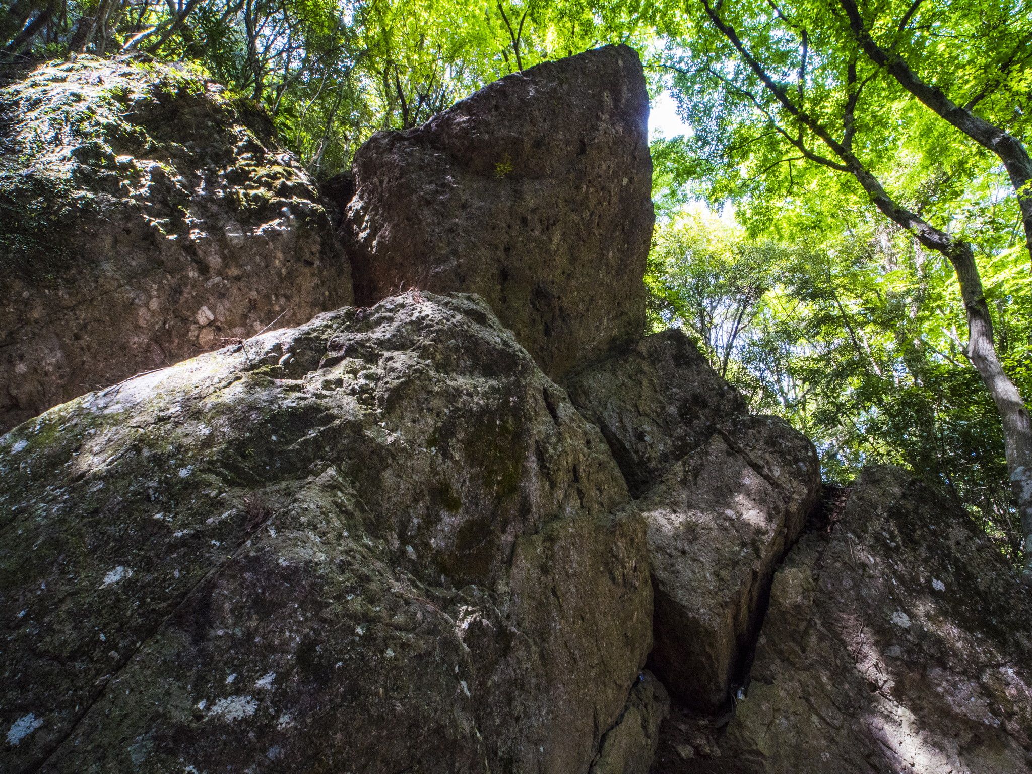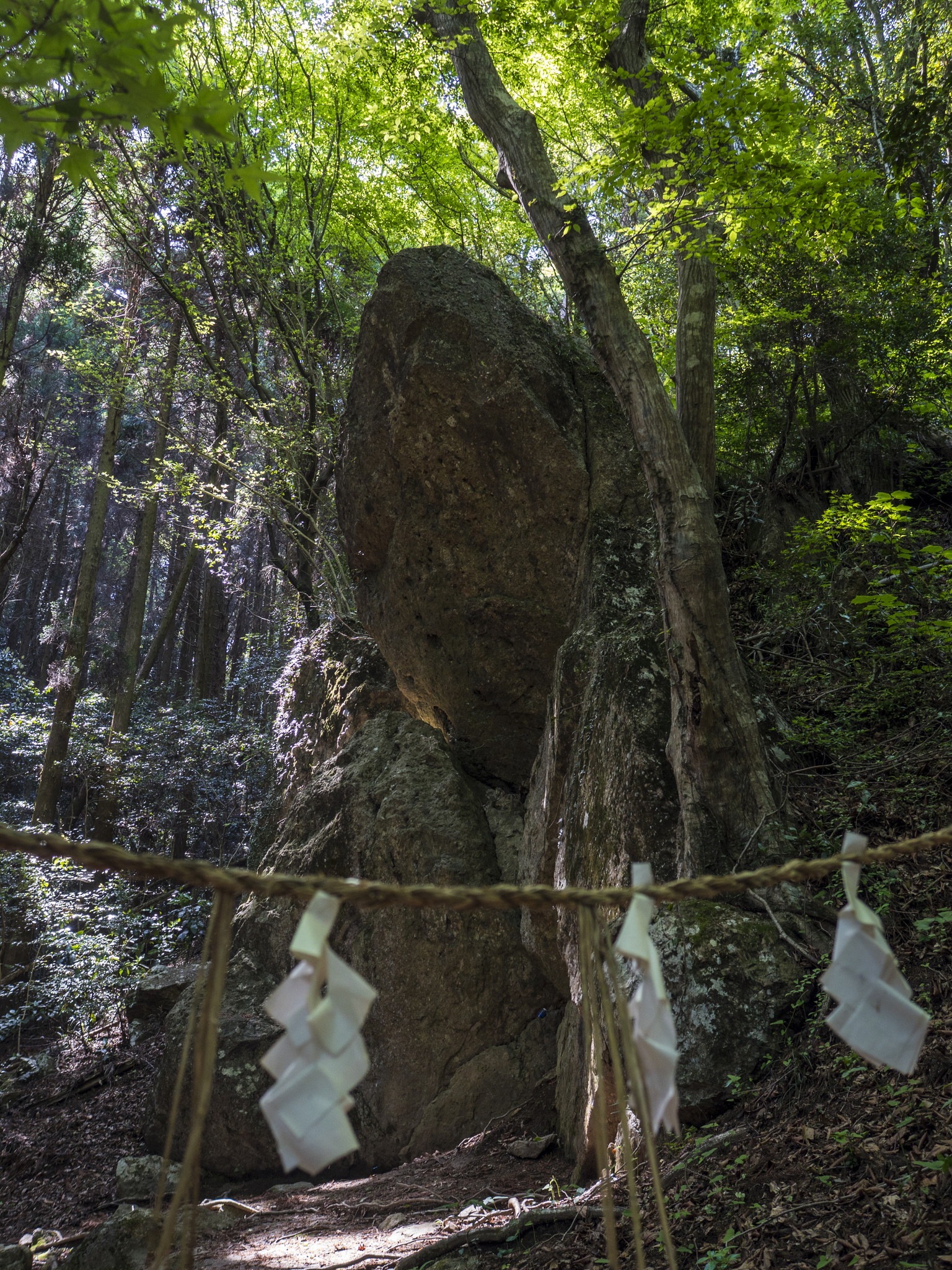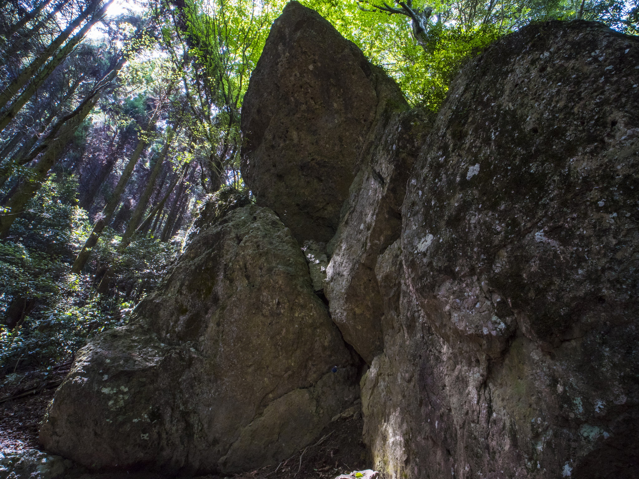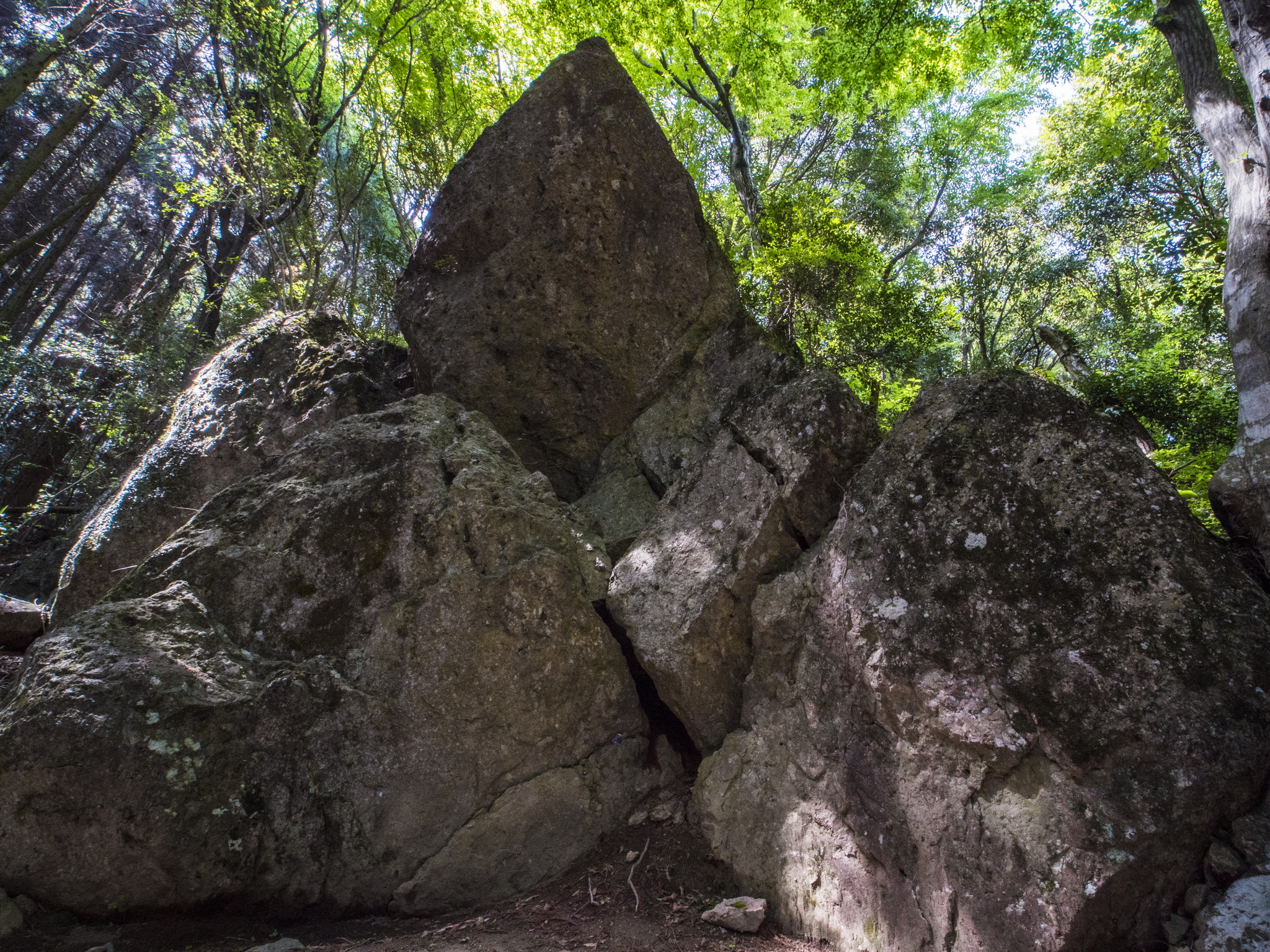西寒多神社の奥宮(本宮)で神功皇后の所縁の地とされる本宮神社は、607.5mの本宮山頂上から東北東280mほどに鎮座しています。社殿から頂上を結ぶ中点近くに、高さ10mを越える「石峰殿」と呼ばれる高さ約10mの巨石群が、磐座として照葉樹林の樹林の中に祀られています。この巨石群は古代の祭祀の跡とも言われています。