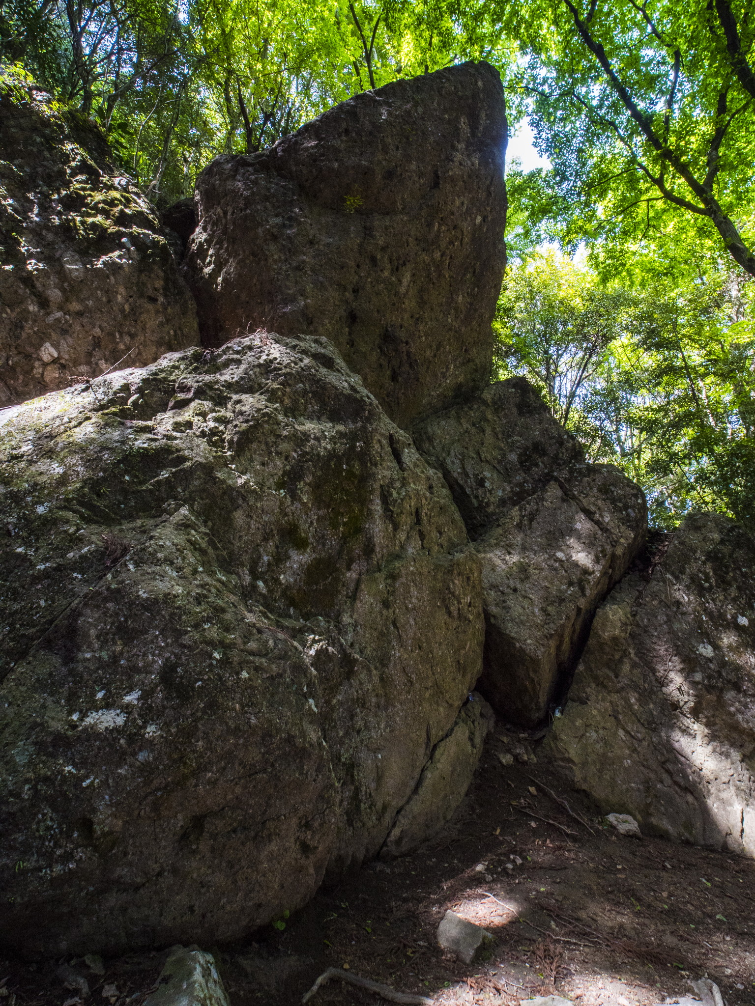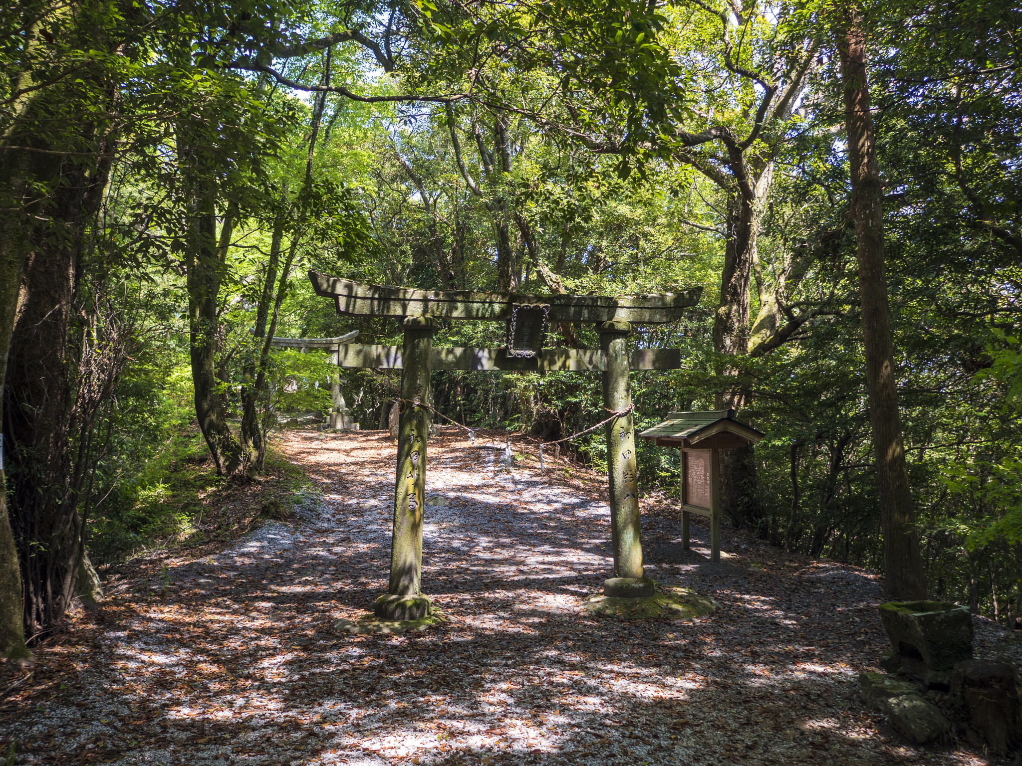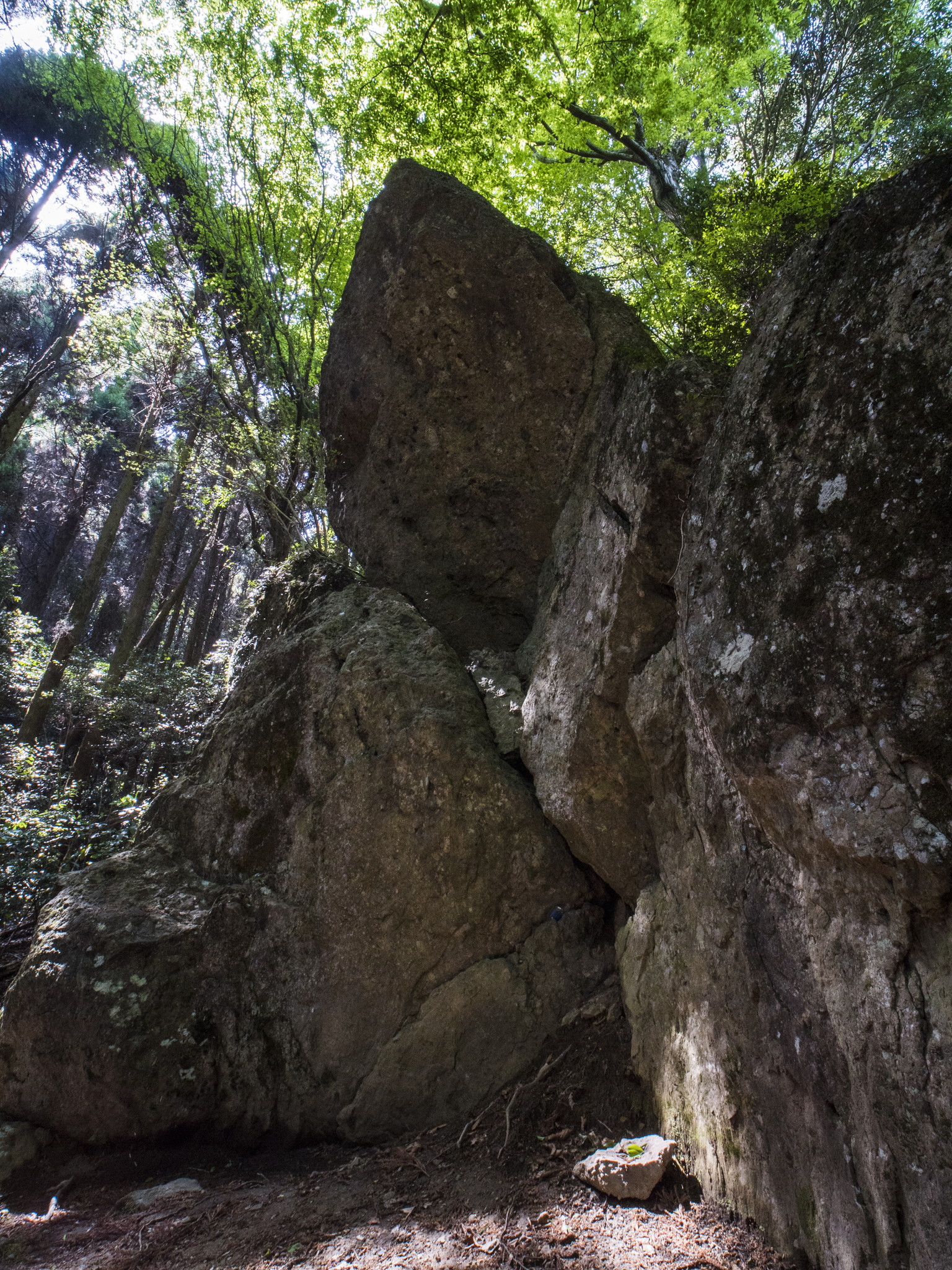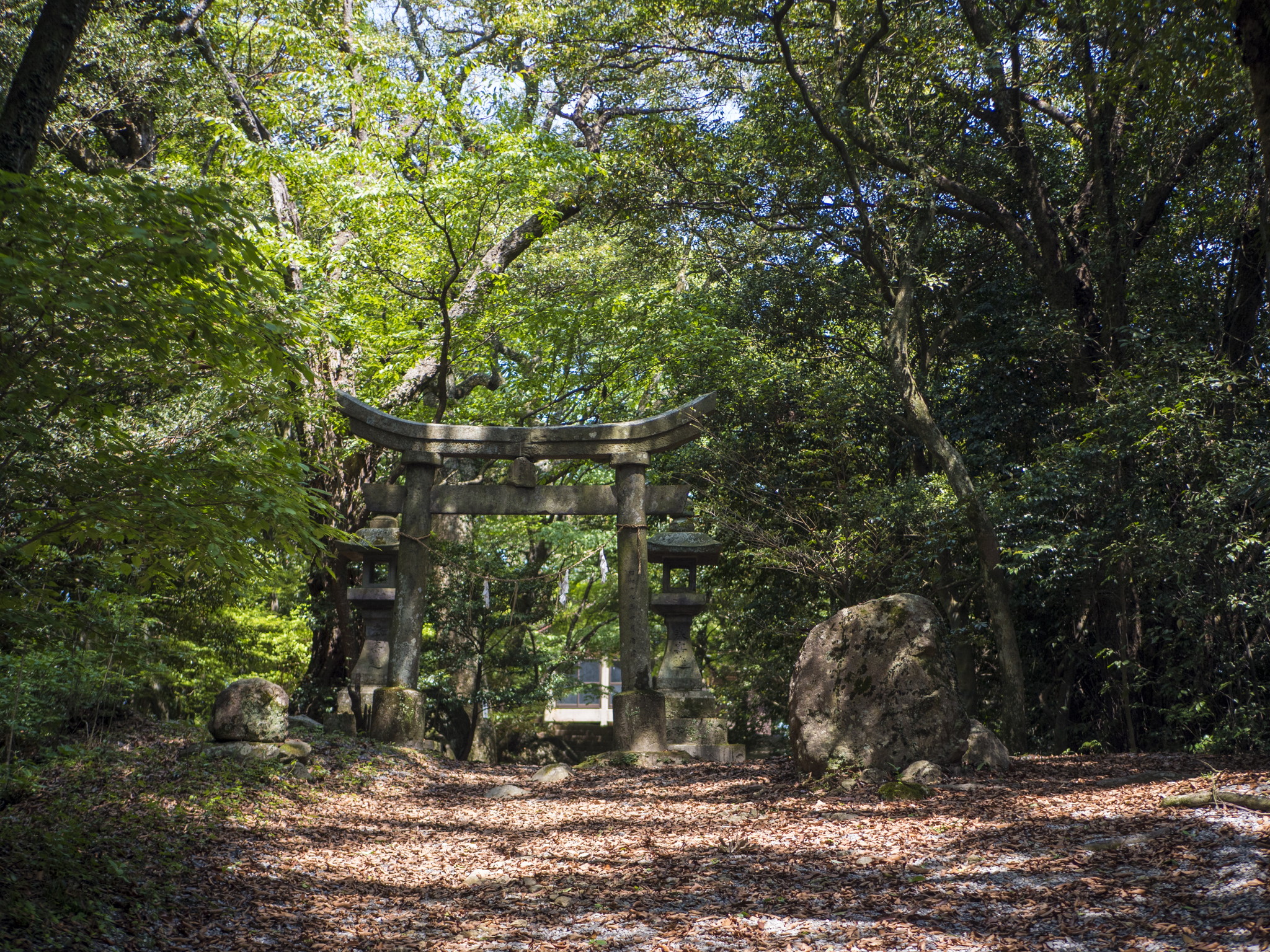 西寒多神社の奥宮(本宮)で神功皇后の所縁の地とされる本宮神社は、607.5mの本宮山頂上から東北東280mほどに鎮座しています。社殿から頂上を結ぶ中点近くに、高さ10mを越える「石峰殿」と呼ばれる高さ約10mの巨石群が、磐座として照葉樹林の樹林の中に祀られています。この巨石群は古代の祭祀の跡とも言われています。