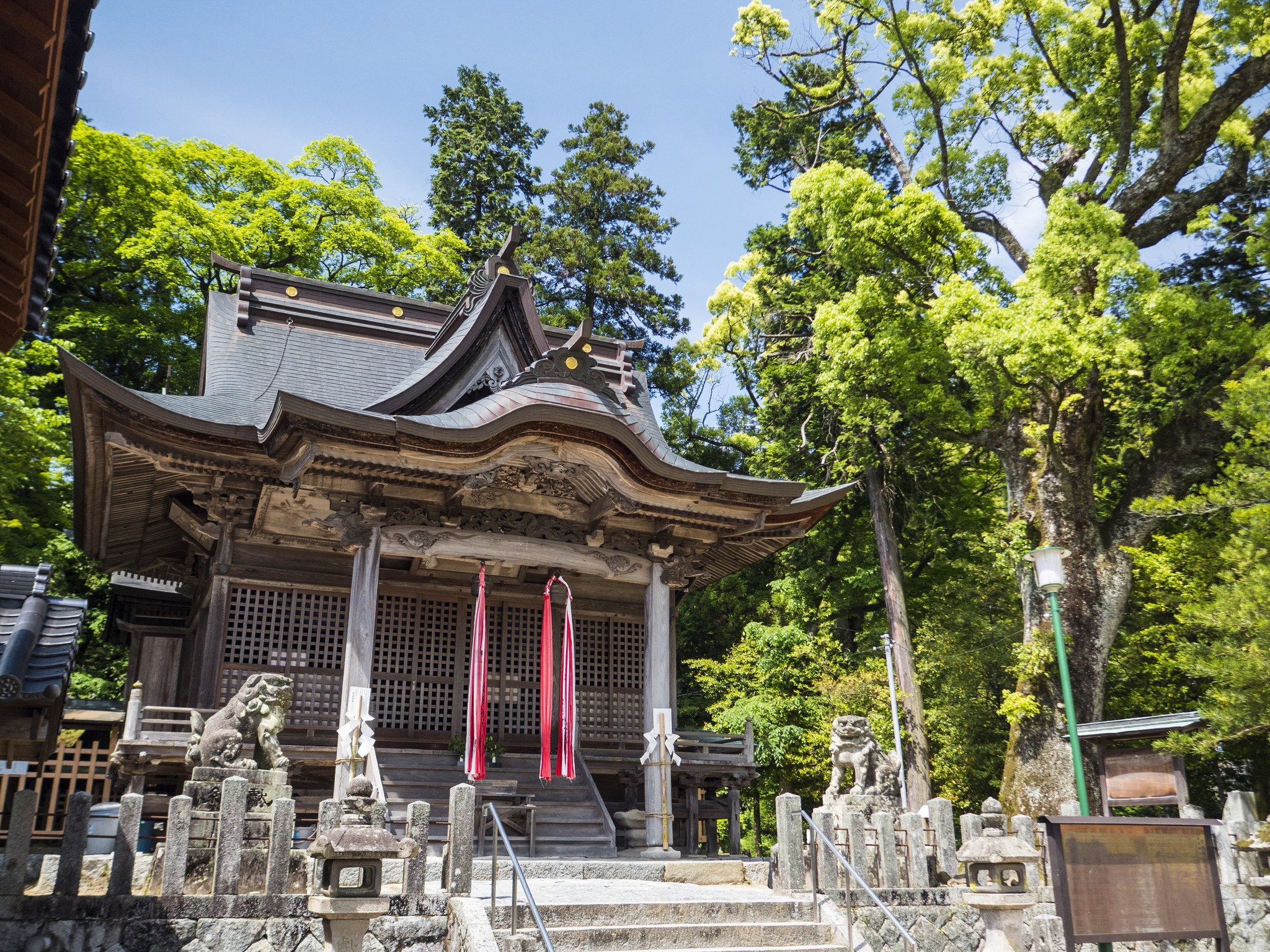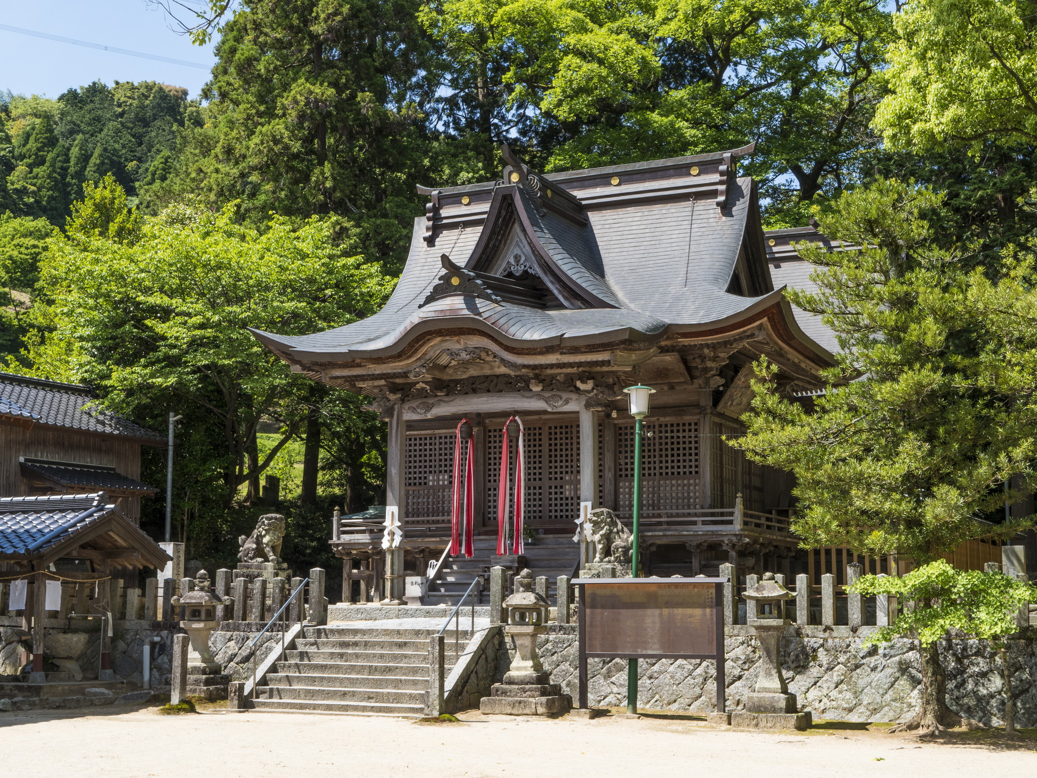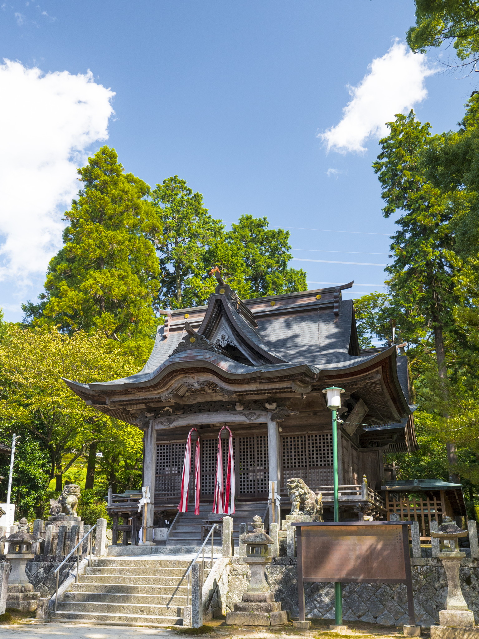 三間社流造の本殿は、向拝三間の銅板葺で、拝殿は、桁行三間、梁間二間の入母屋造千鳥破風付、向拝一間軒唐破風付の銅板葺です。