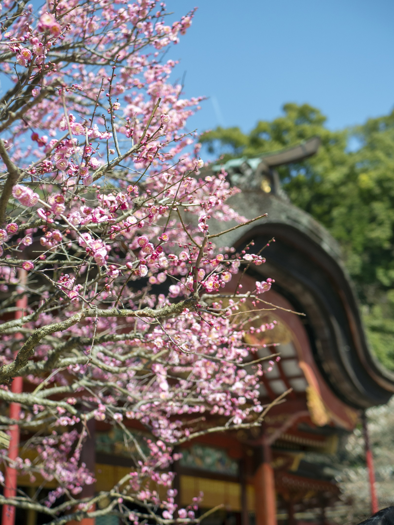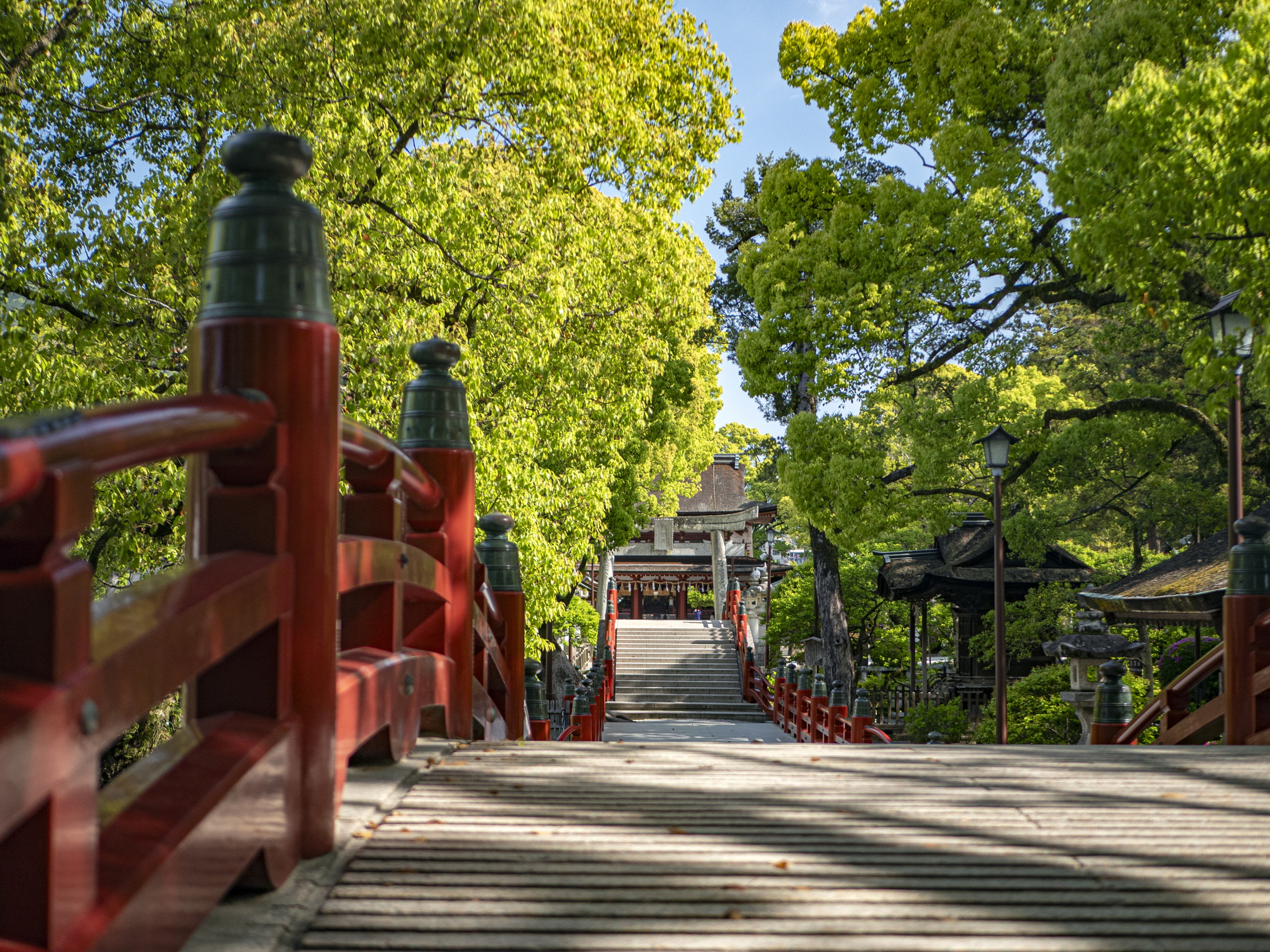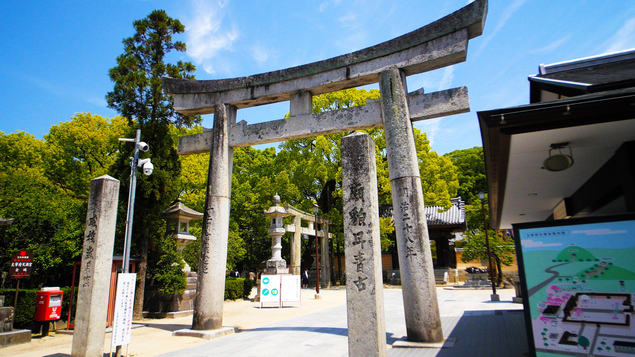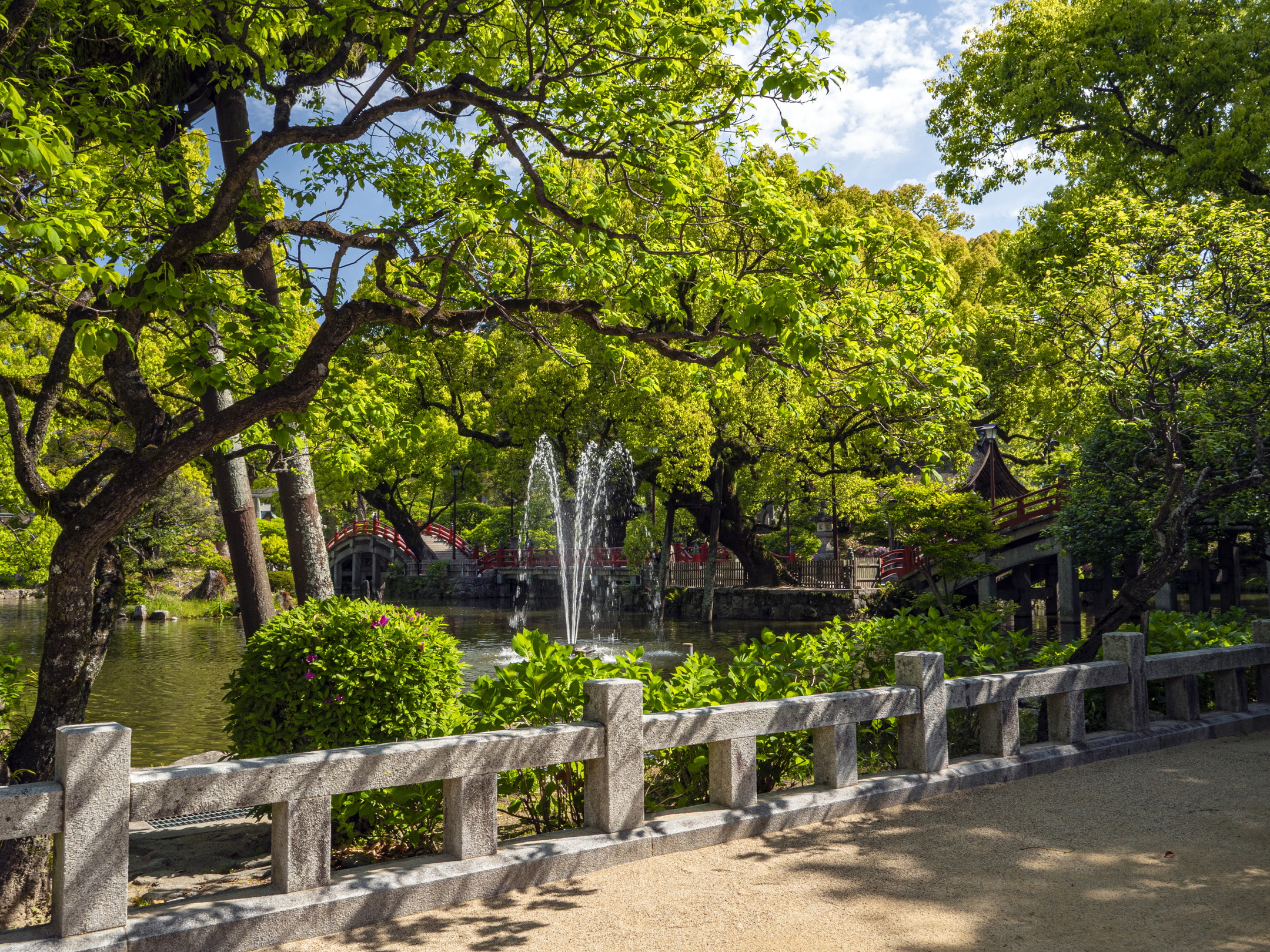 案内書のある四之鳥居を右手に進んだ奥に鎮座。御社殿を囲む水面に、建物の姿が映ることから「浮殿」と名付けられました。創建は不詳なるも、室町期の境内図に記されています。秋の神幸式大祭では、道真公の御神霊を遷した御神輿がお休みする御旅所となっています。