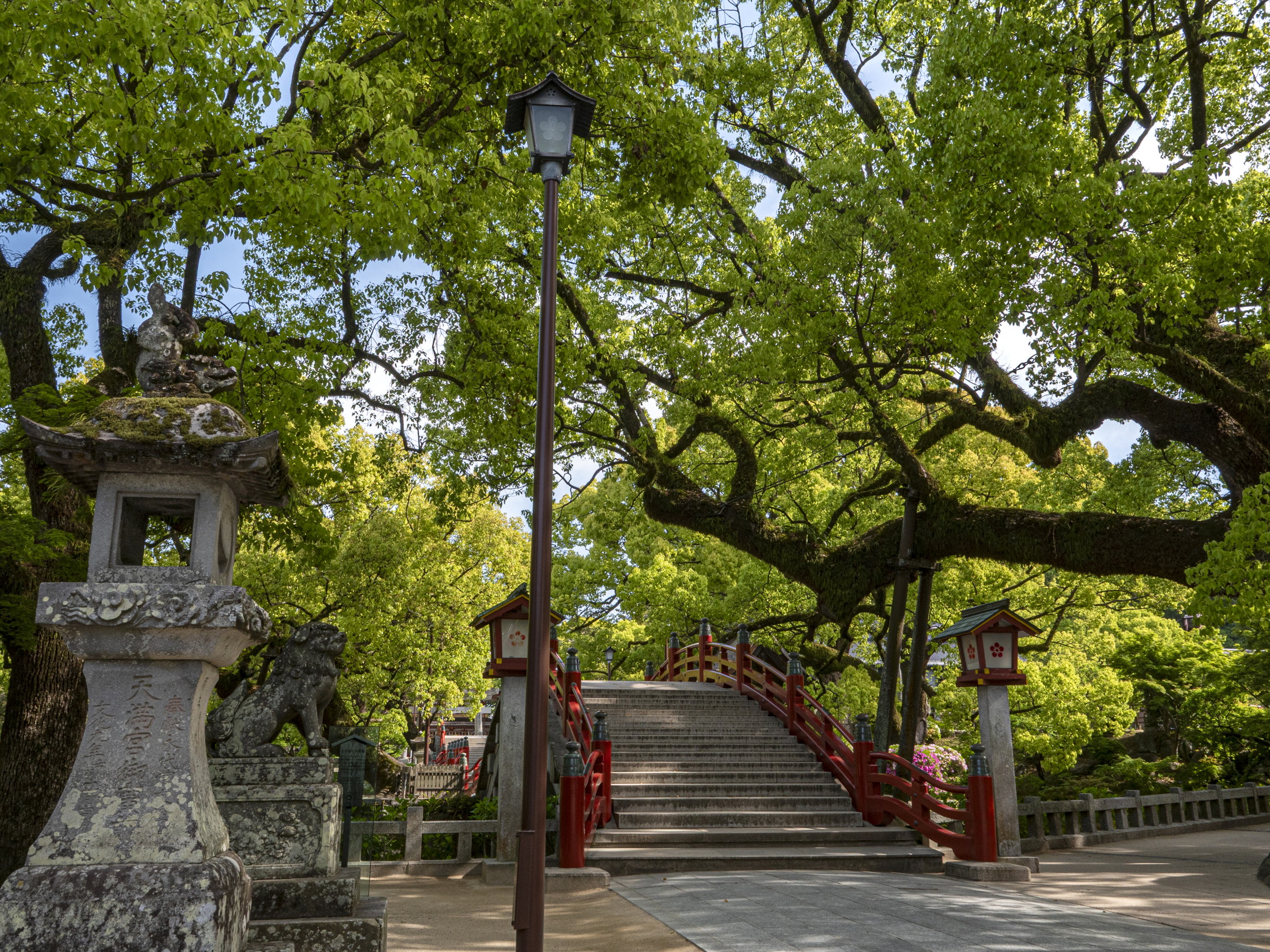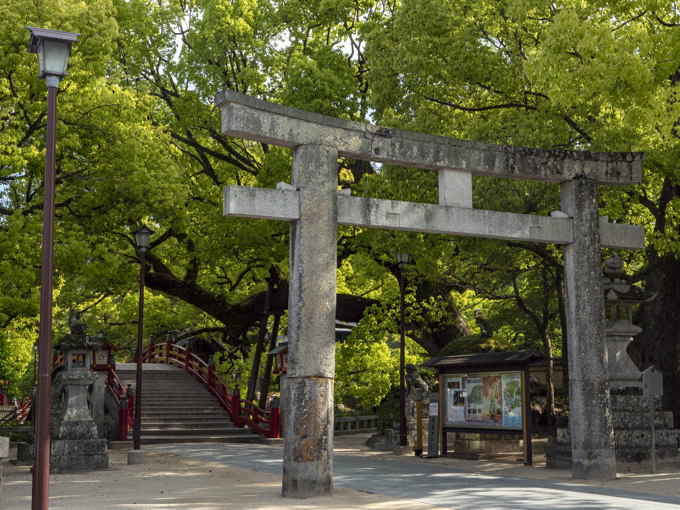 1つ目の太鼓橋を渡った右手に鎮座しています。忌服中の大宰府長官や藩主の代参者などの官人が参拝する場合は、今王社から本殿を遙拝したとされています。元は境内に入る手前の石造大鳥居の右手に面して祀られていました。現在の鎮座地には、十一面観音を祀る中嶋観音堂がたっていました。文化2年(1805)に移築されたと考えられています[16]。