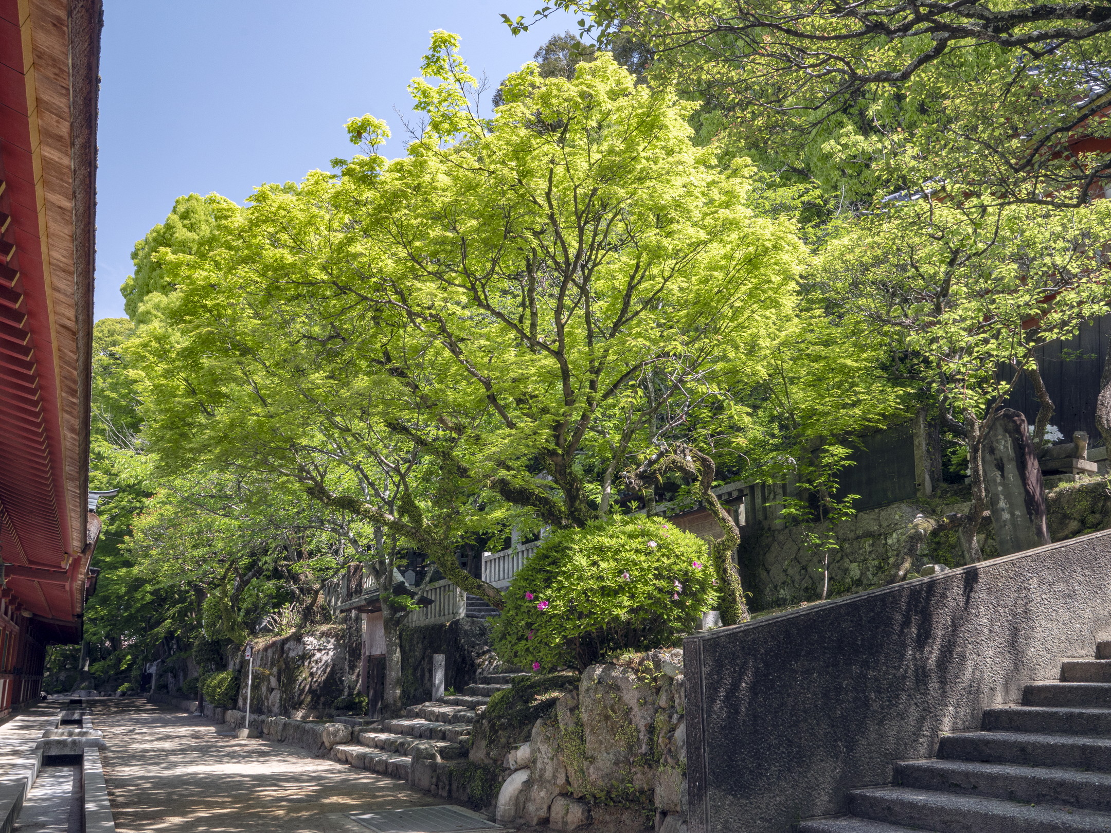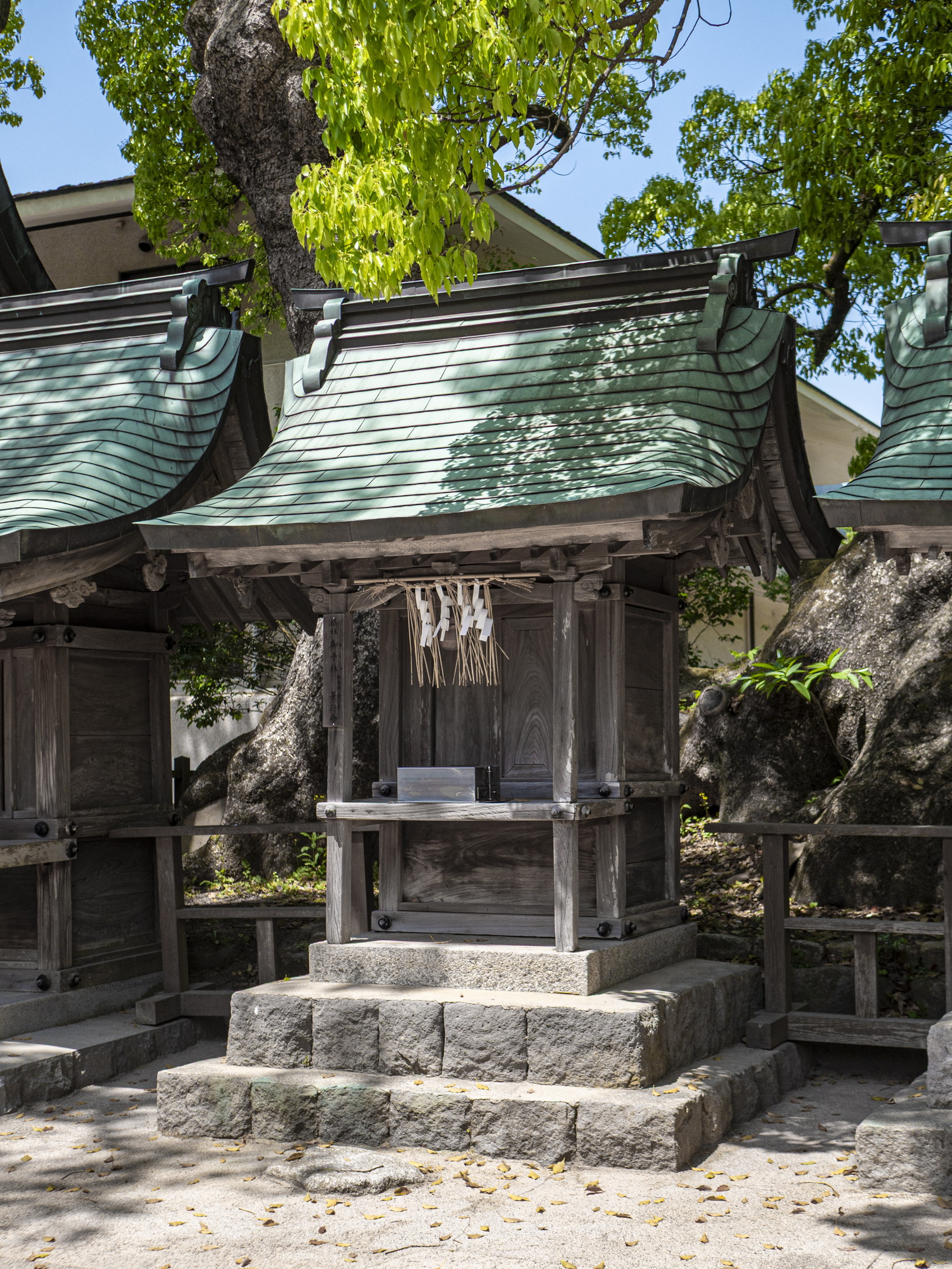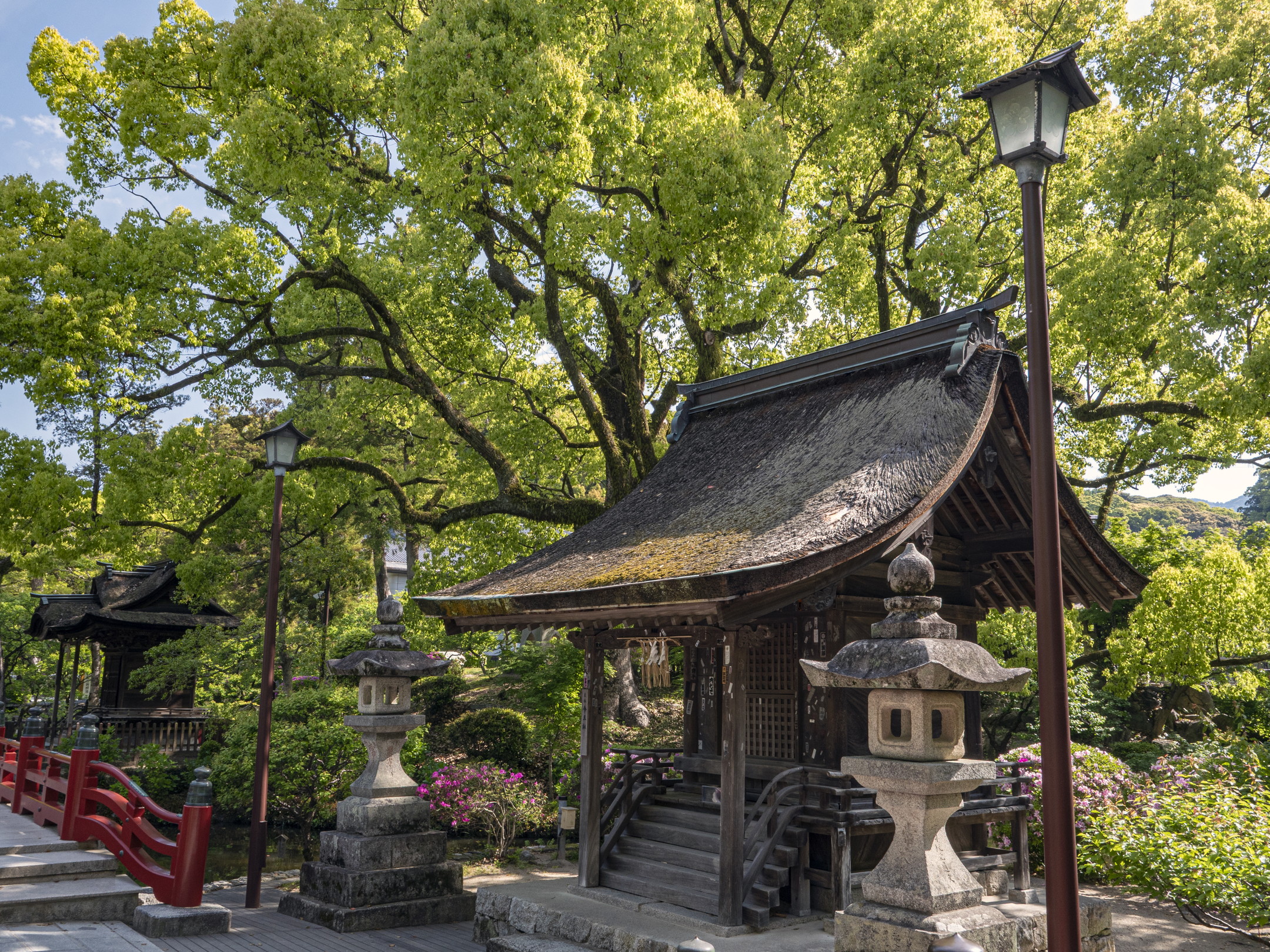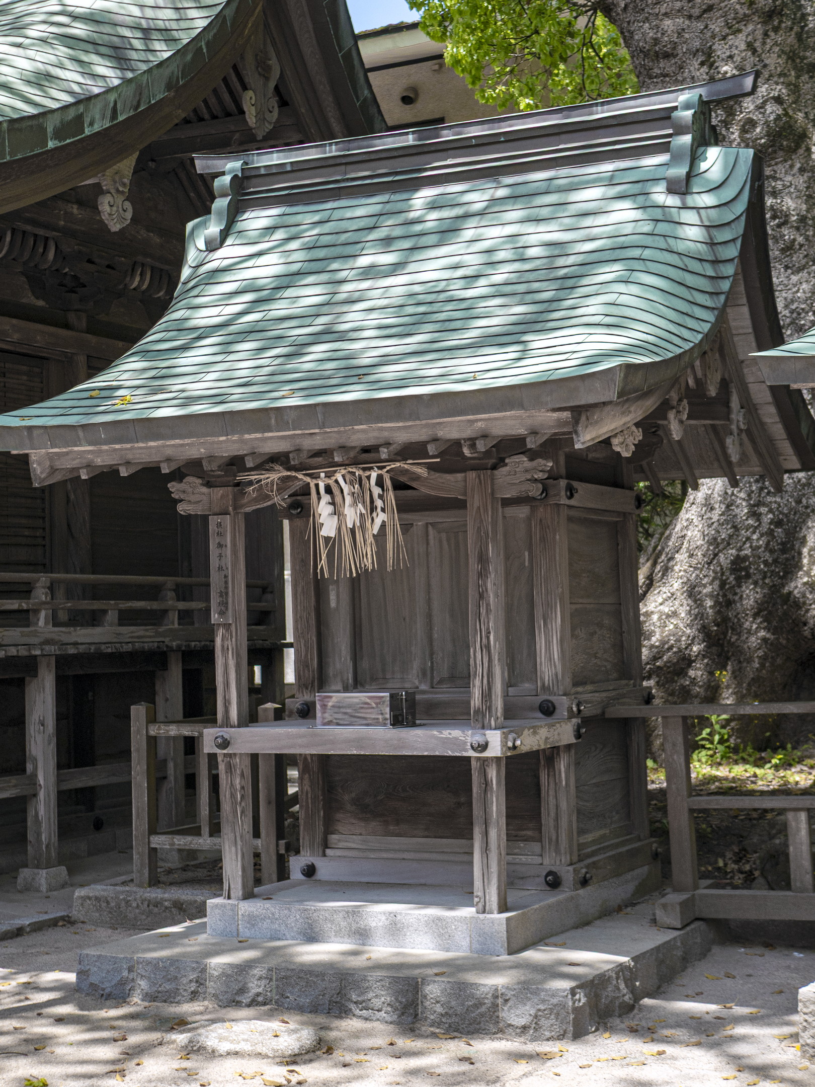 心字池を渡る2つ目の太鼓橋の右横に鎮座。海の神様である綿津見三柱神をお祀りしています。海上守護や除災招福の神として信仰されています。長禄2年(1458)の造営で、一間社入母屋造、正面千鳥破風付、向拝一間、唐破風造、檜皮葺。周囲に跳勾欄を廻らし、蟇股をはじめ彫刻物には彩色を施していた痕跡があります。和様・禅宗様・大仏様の三つの建築様式を併せ持つ県内最古の神社建築です。明治40年(1907)5月27日に国指定重要文化財の指定を受けました。