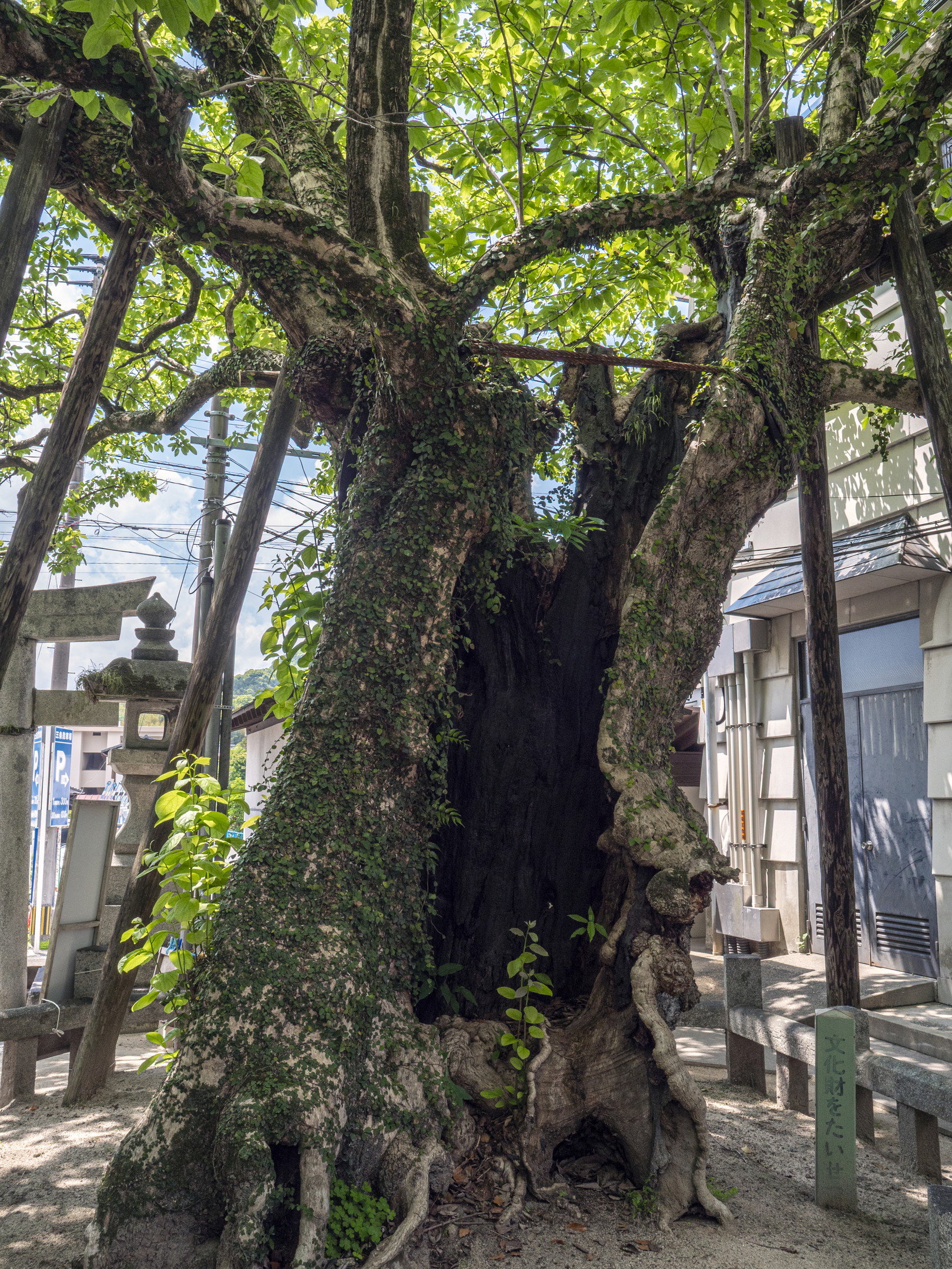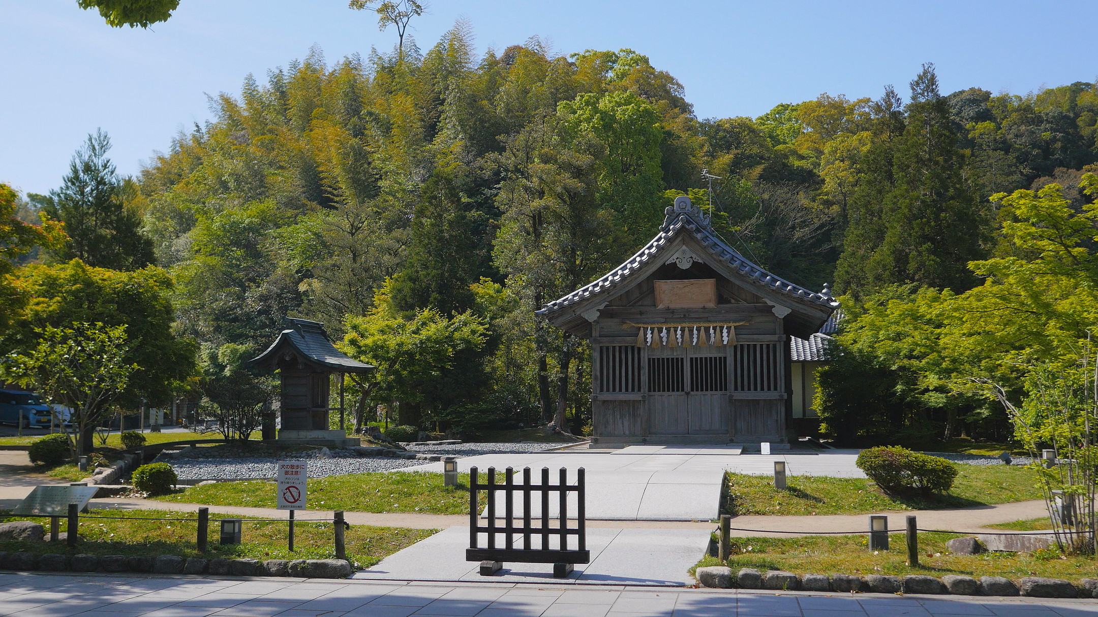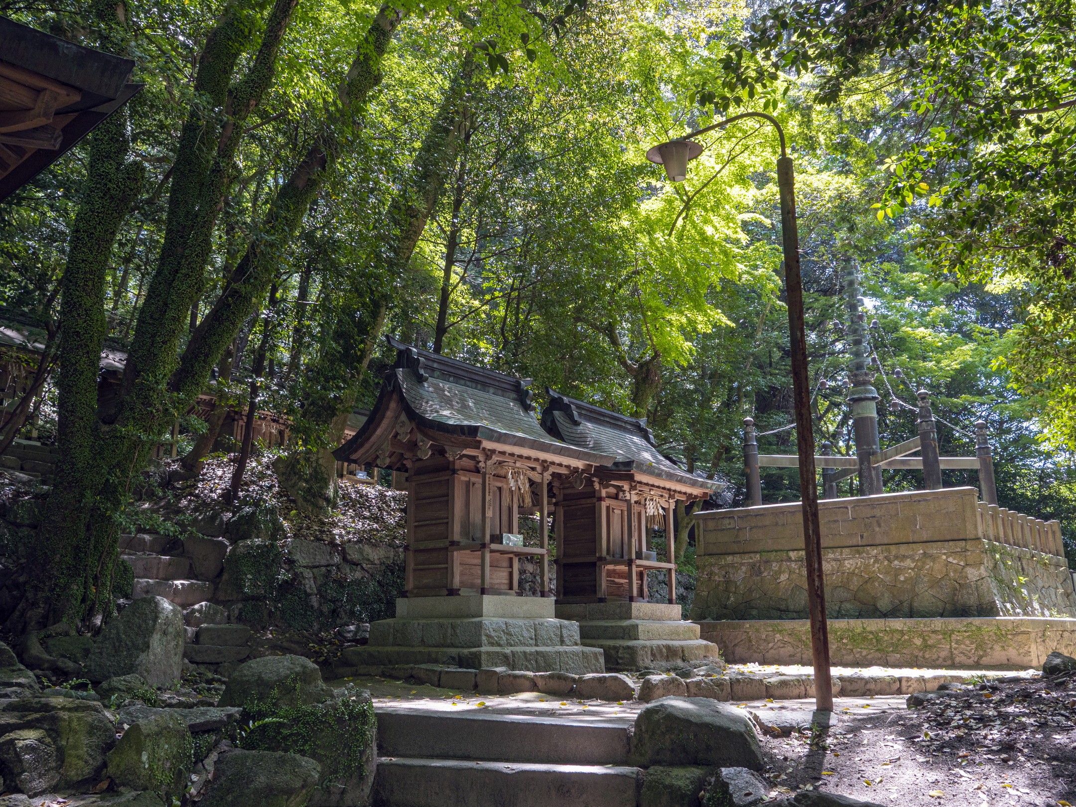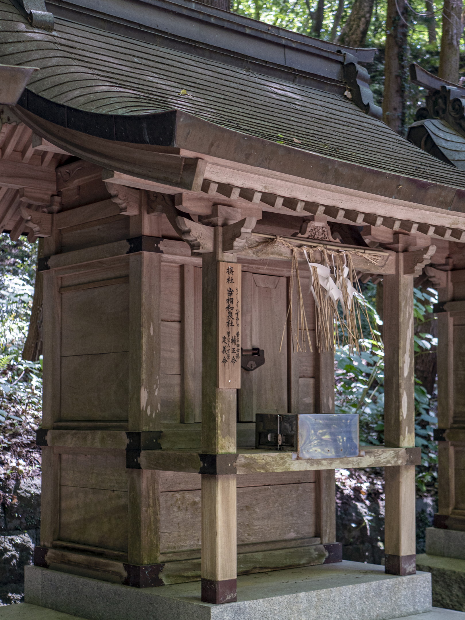 心字池を渡る2つ目の太鼓橋の右横に鎮座。海の神様である綿津見三柱神をお祀りしています。海上守護や除災招福の神として信仰されています。長禄2年(1458)の造営で、一間社入母屋造、正面千鳥破風付、向拝一間、唐破風造、檜皮葺。周囲に跳勾欄を廻らし、蟇股をはじめ彫刻物には彩色を施していた痕跡があります。和様・禅宗様・大仏様の三つの建築様式を併せ持つ県内最古の神社建築です。明治40年(1907)5月27日に国指定重要文化財の指定を受けました。