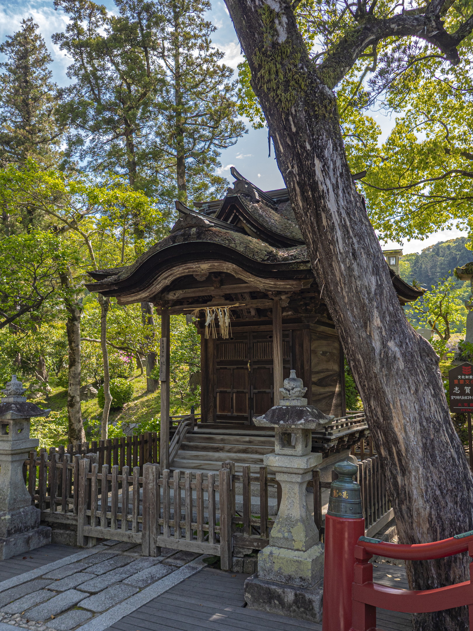 廻廊の東に摂末社が並びます。手前の段の南から北へ順に、中島神社、相輪摚、靏寿尼社、野見宿禰社、尊意社です。