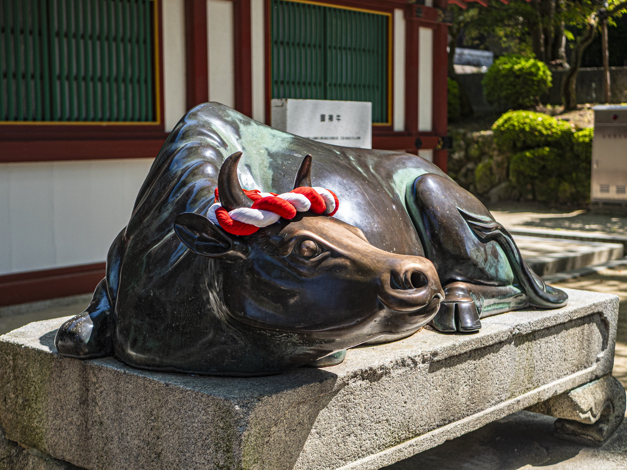 神門前に祀られている御神牛像は、文化2年(1805)遠賀郡芦屋町の釜師・釜師であった釜師の鋳工によるものです。高さ55.0cm、長さ135.0cmで、背面に陰刻銘で「宿坊延寿王院願主福岡連中博多連中世話人博多住西島半七祐寛画工博多住眠蝶斎耕景守章鋳工博多住山鹿儀平藤原包賢文化二乙丑年(1805)一一月吉祥日」と記されています。鋳肌は大変なめらかに仕上げられていますが、人の目につきにくい首の下に、鋳掛けの跡や埋金のあとが認められます。昭和37年(1962)2月20日、県指定有形文化財に指定されました[17]。