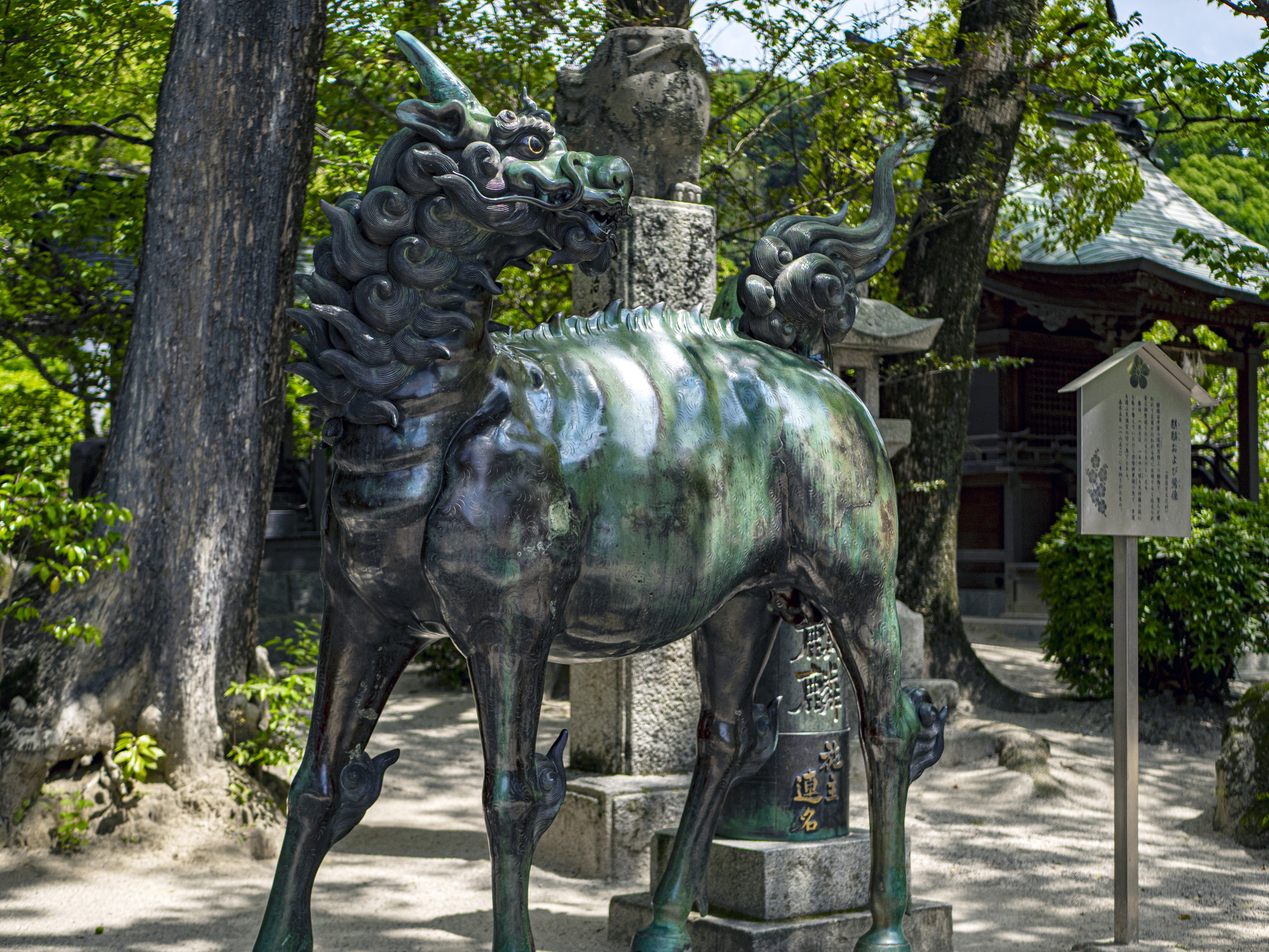 麒麟は、中国古代の想像上の動物で、聖人が現われて王道が行なわれる時に出現すると伝えられ、誠の心を貫かれた道真公の生き方と重ね合わせて制作されました。かつては2体存在しましたが、戦時中に金属供出を求められ、1体だけが奇跡的に免れ、その秀逸な姿を現代まで伝えています[19][20]。