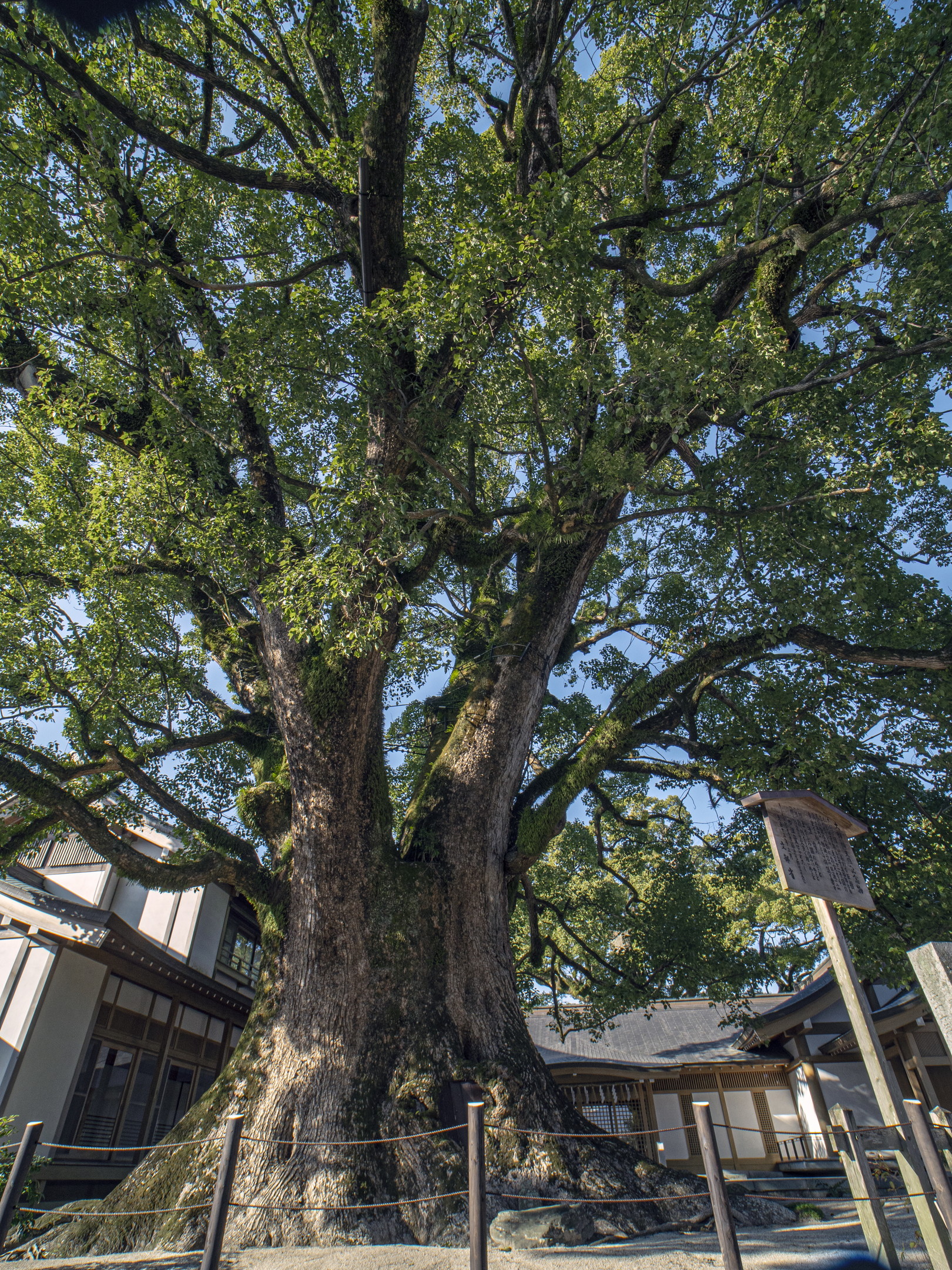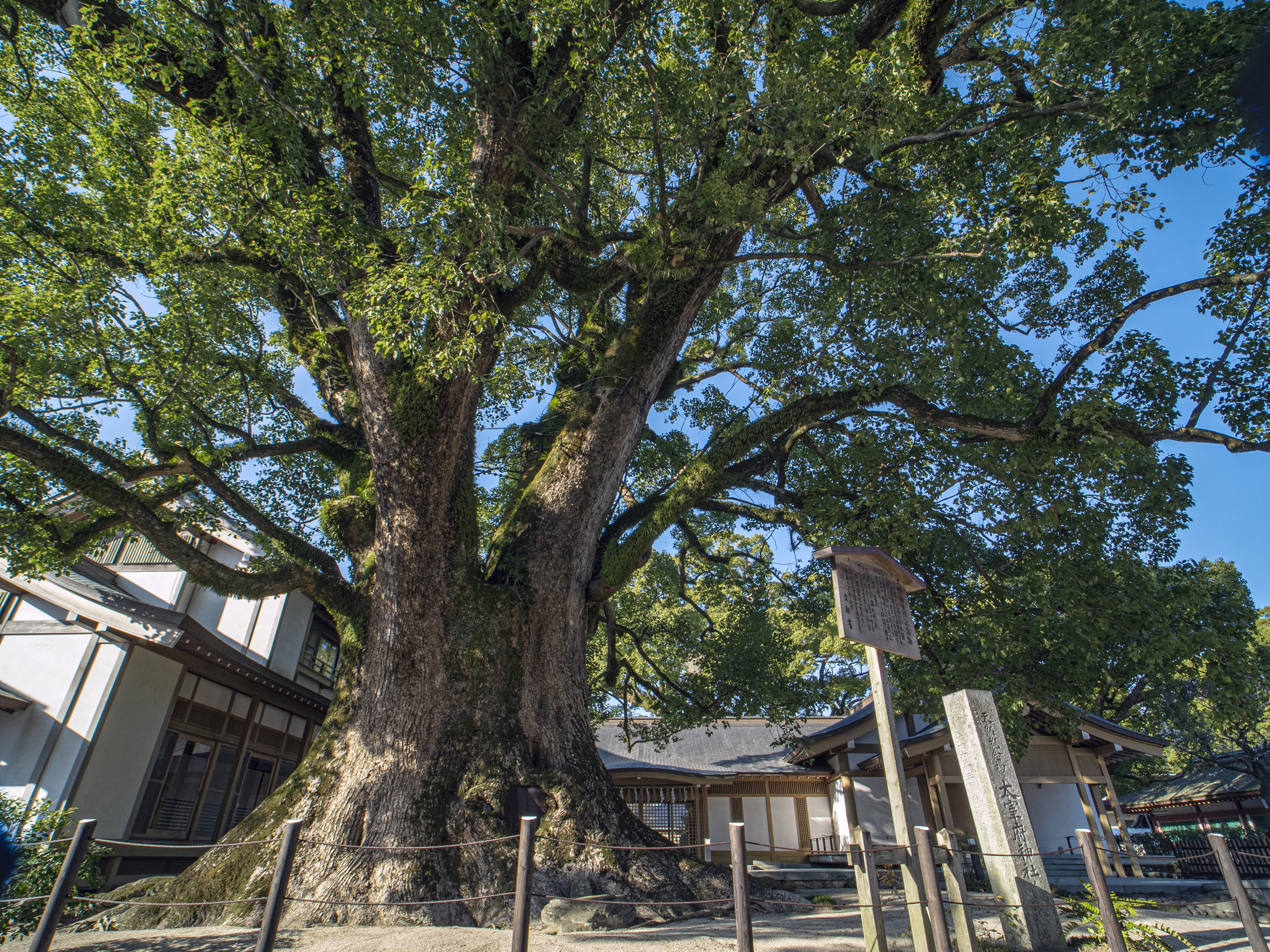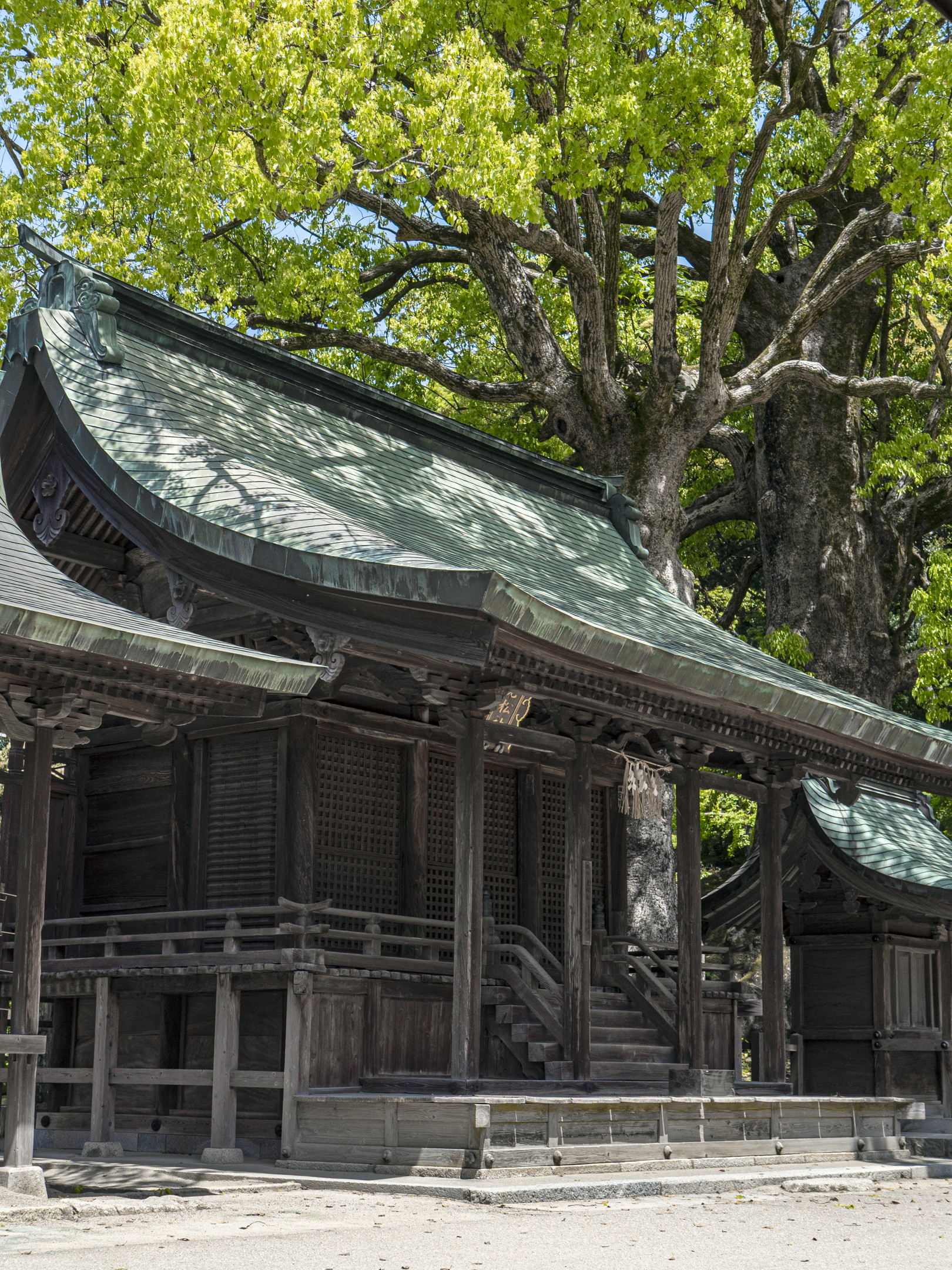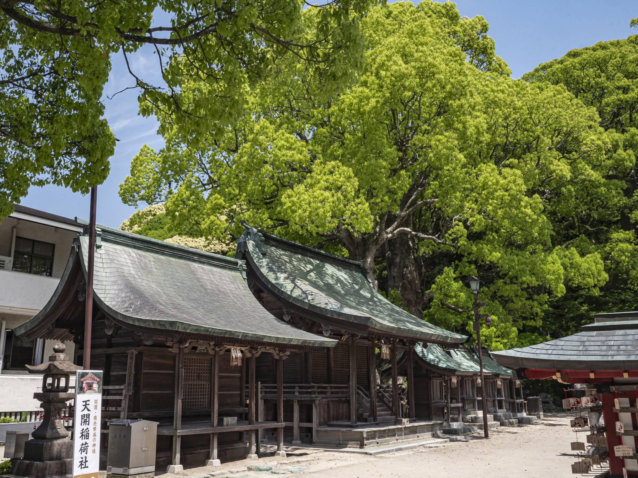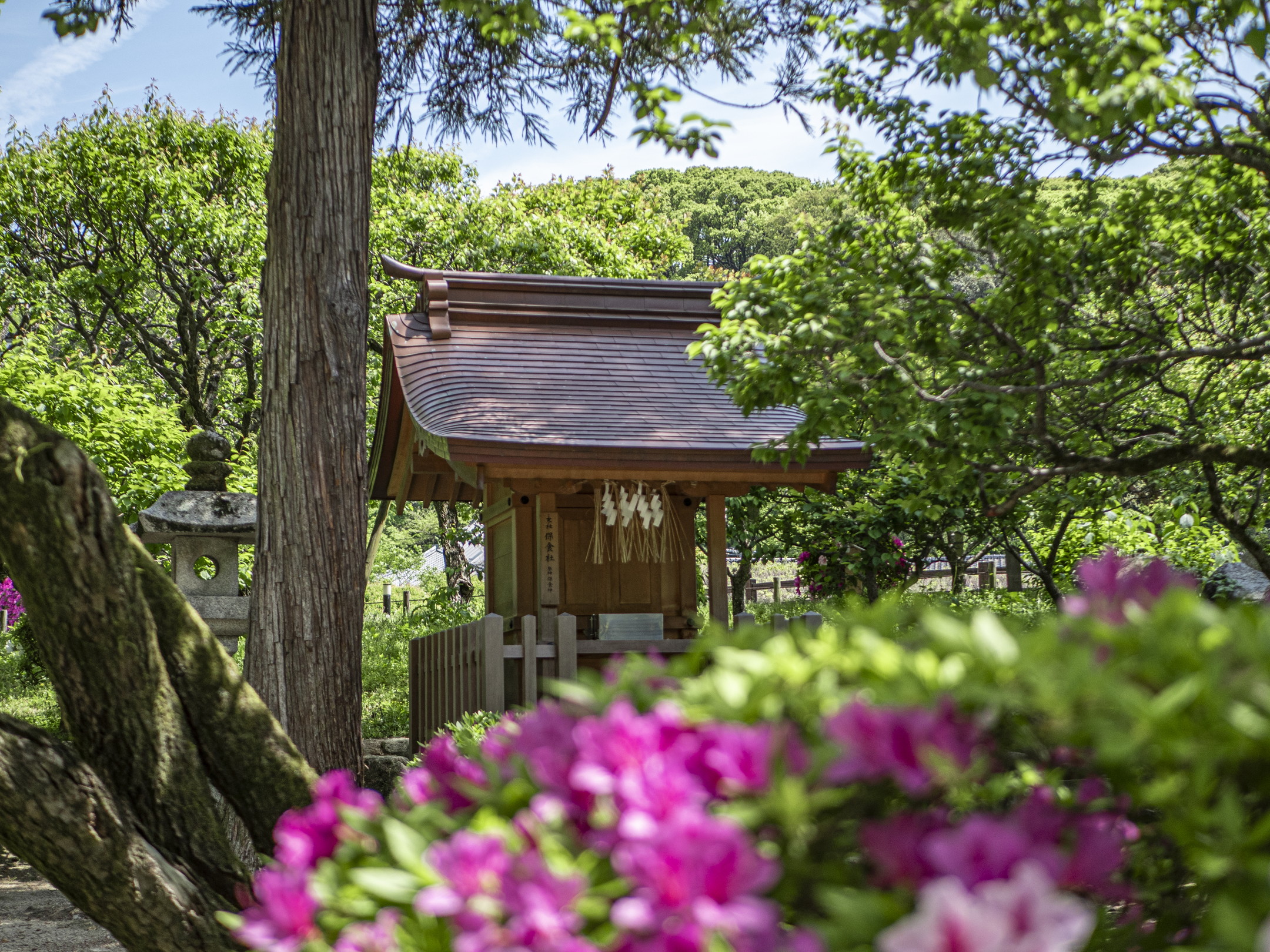 廻廊の東、向かって右手前に鎮座。お菓子の神である田道間守命は、但馬国出石郡神美村三宅を生誕地とし、その地に鎮座する中嶋神社の御祭神として祀られています。垂仁天皇90年(61)天皇より命ぜられた田道間守命は、景行天皇元年(71)常世国から非時香菓(橘)を持ち帰ります。非時香菓は「時を選ばず常に香しく輝きを放つ木の実」を意味するものされています。昭和29年(1954)7月に摂社として中嶋神社の九州分社遷座祭が斎行されました。お菓子の神様である田道間守命をお祀りしており、九州菓子業の守り神として信仰を集めています。