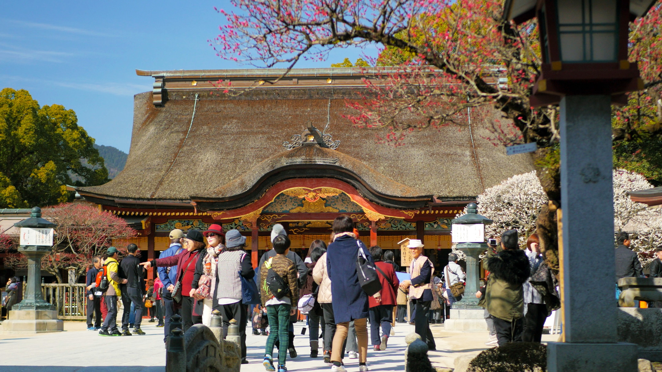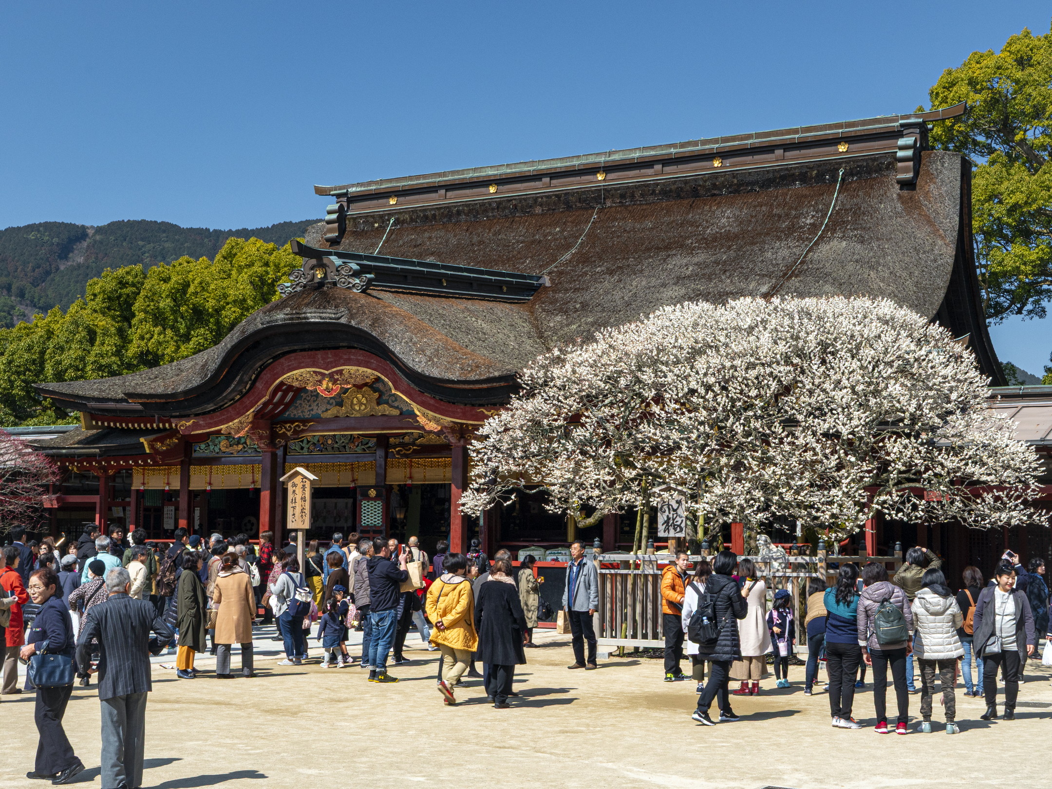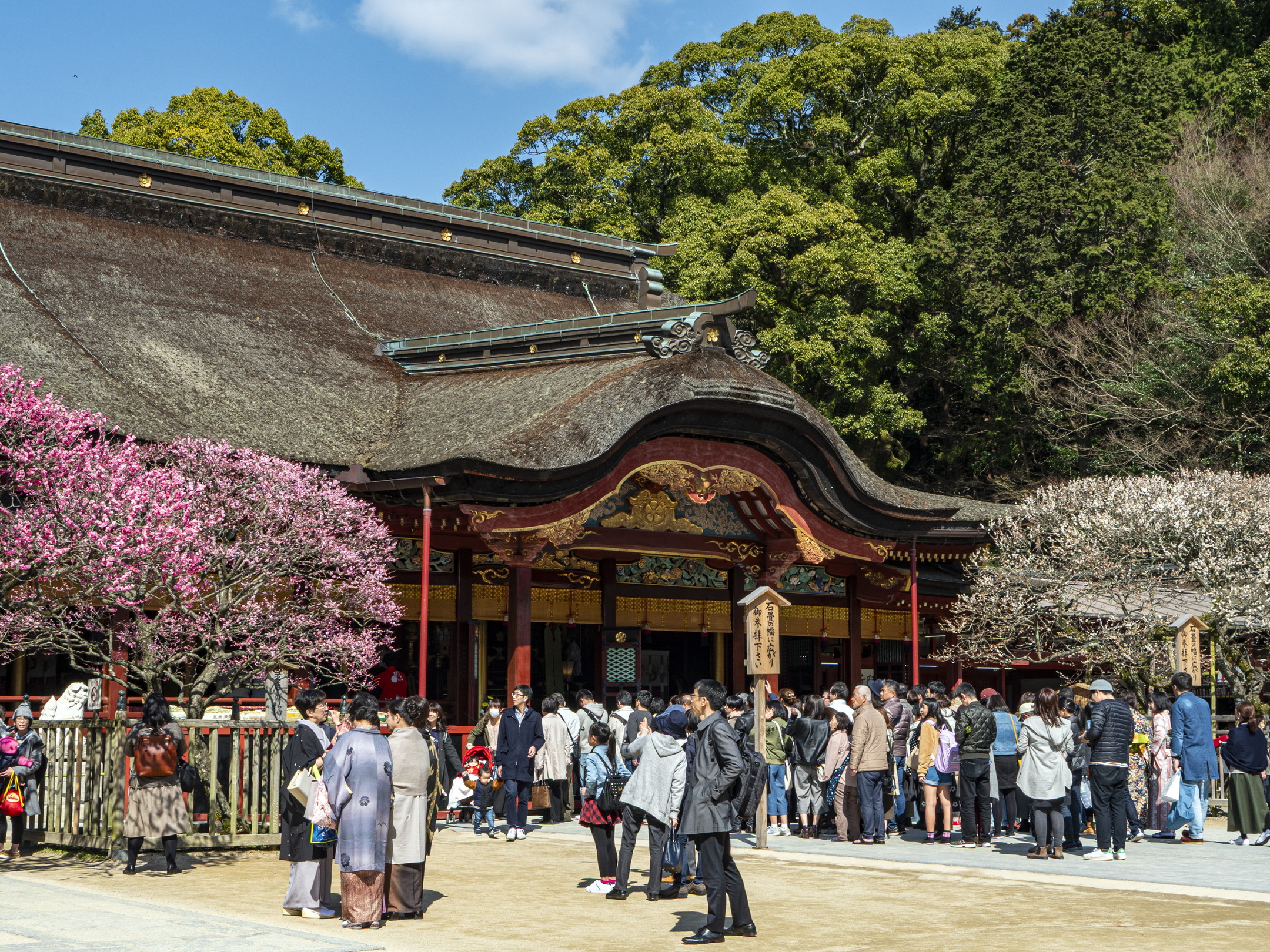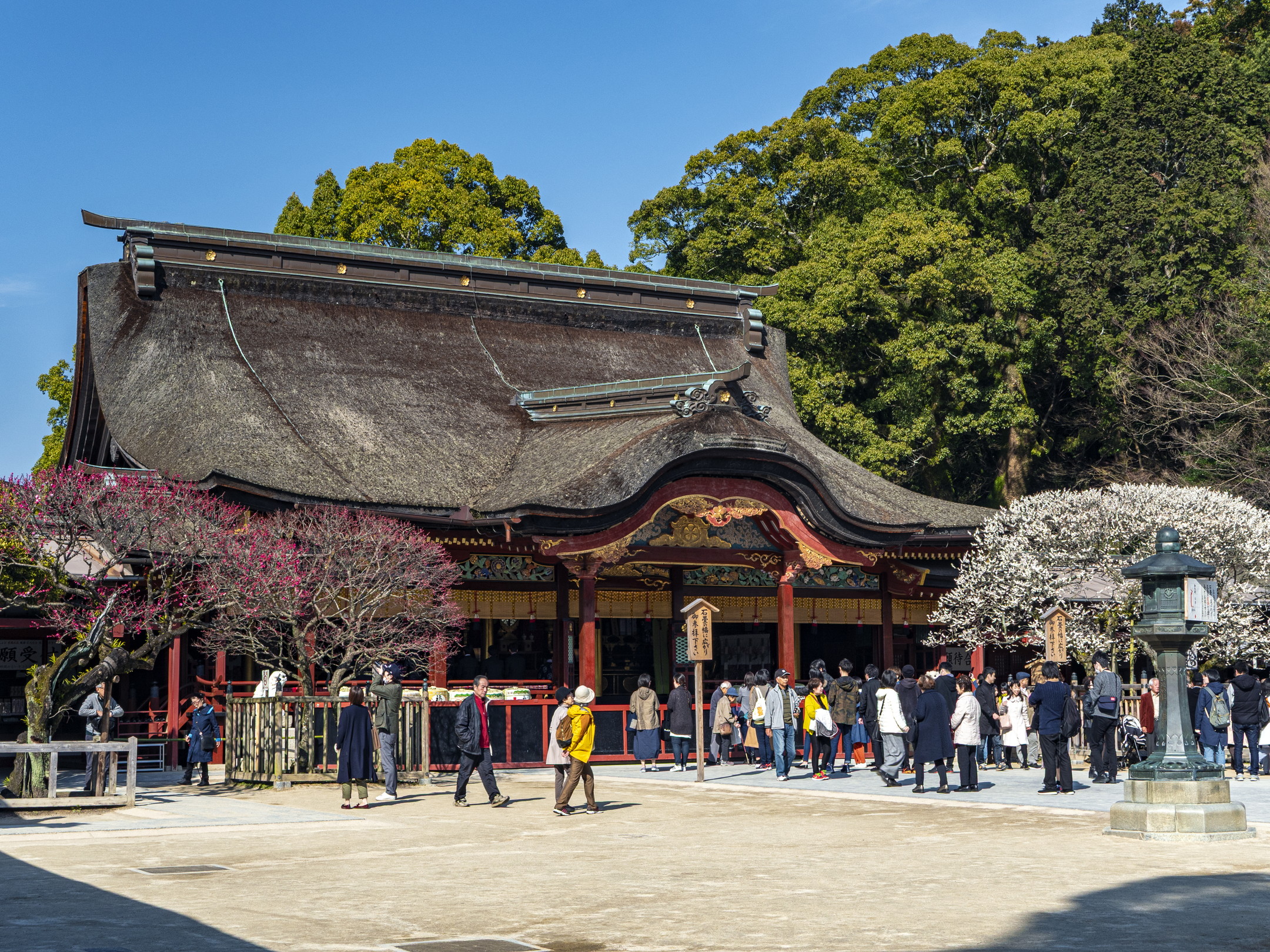 道真公と牛には、様々な深いご縁があります。道真公は承和12年(845)の乙丑にお生まれになりました。また大宰府の地でお亡くなりになられた道真公の御遺骸を牽いていた牛が、四堂で臥して動かなくなり、その場所に門弟の味酒安行が御墓所を造営したことが、御本殿の創建につながりました。境内に奉納されている御神牛像のすべてが伏した牛、すなわち臥牛であるのは、これに由来しています。学業に秀でた道真公の御神徳により、御神牛像の頭をなでると知恵を授かるとされ、多くの方に親しまれています。