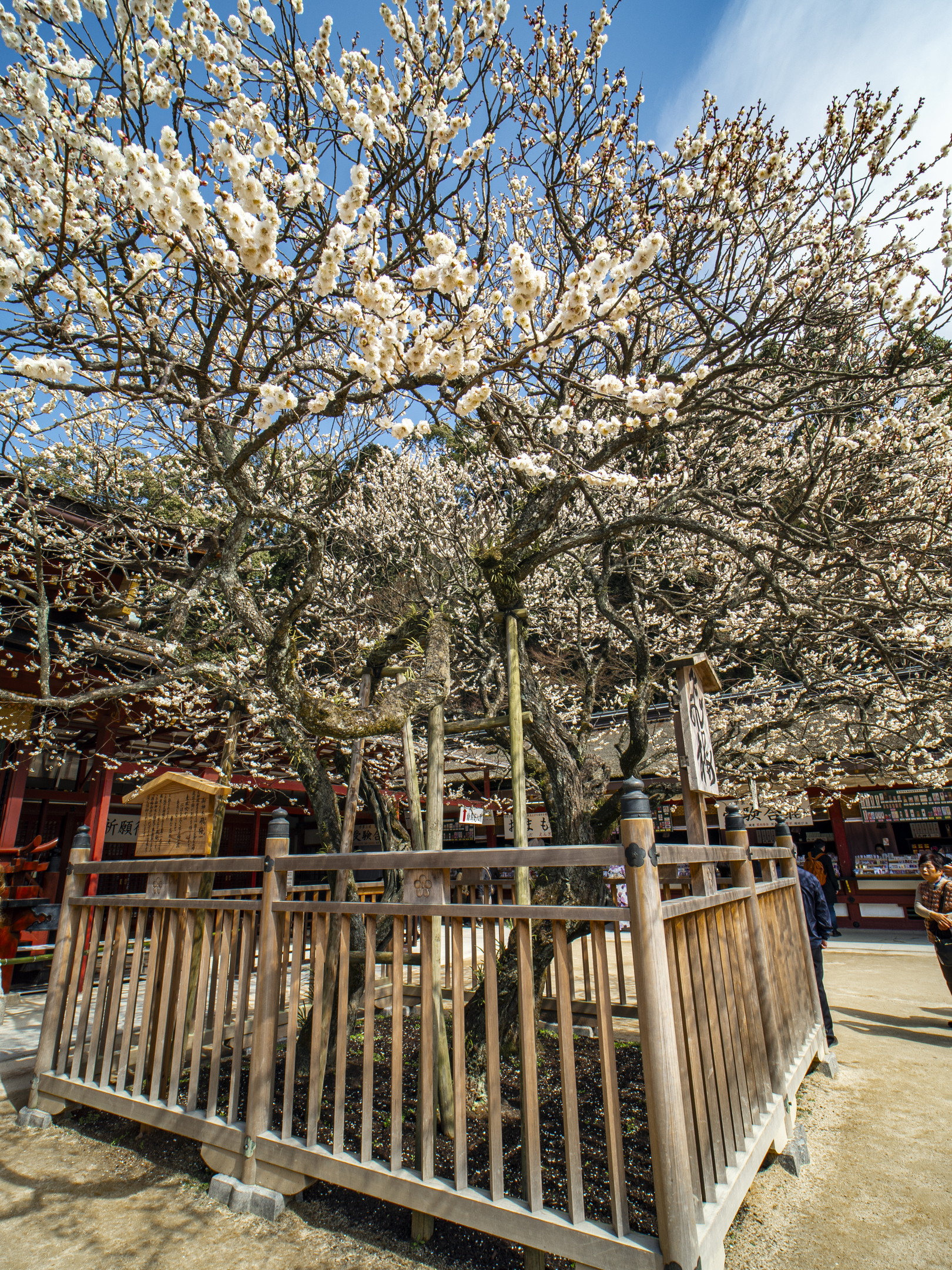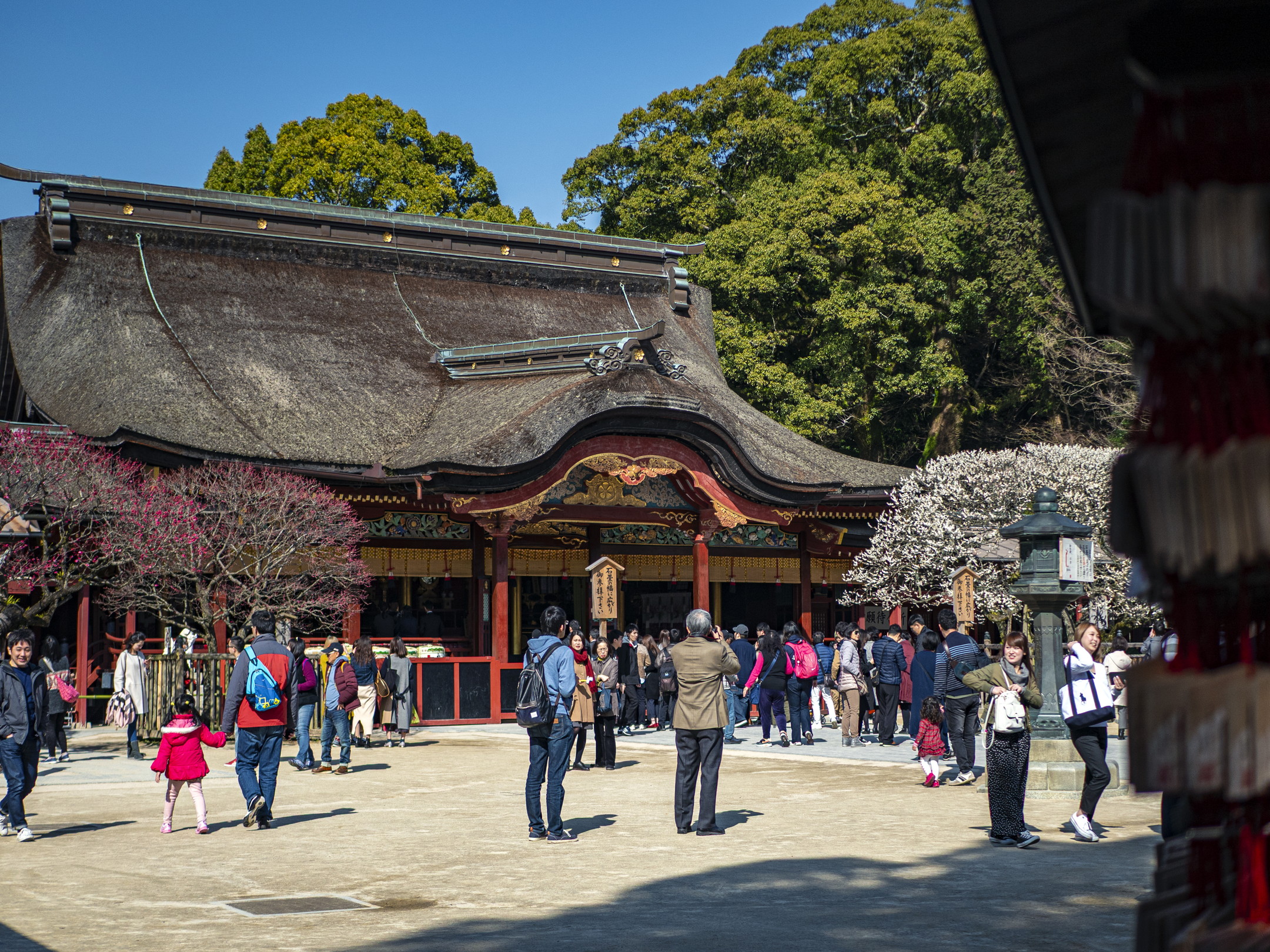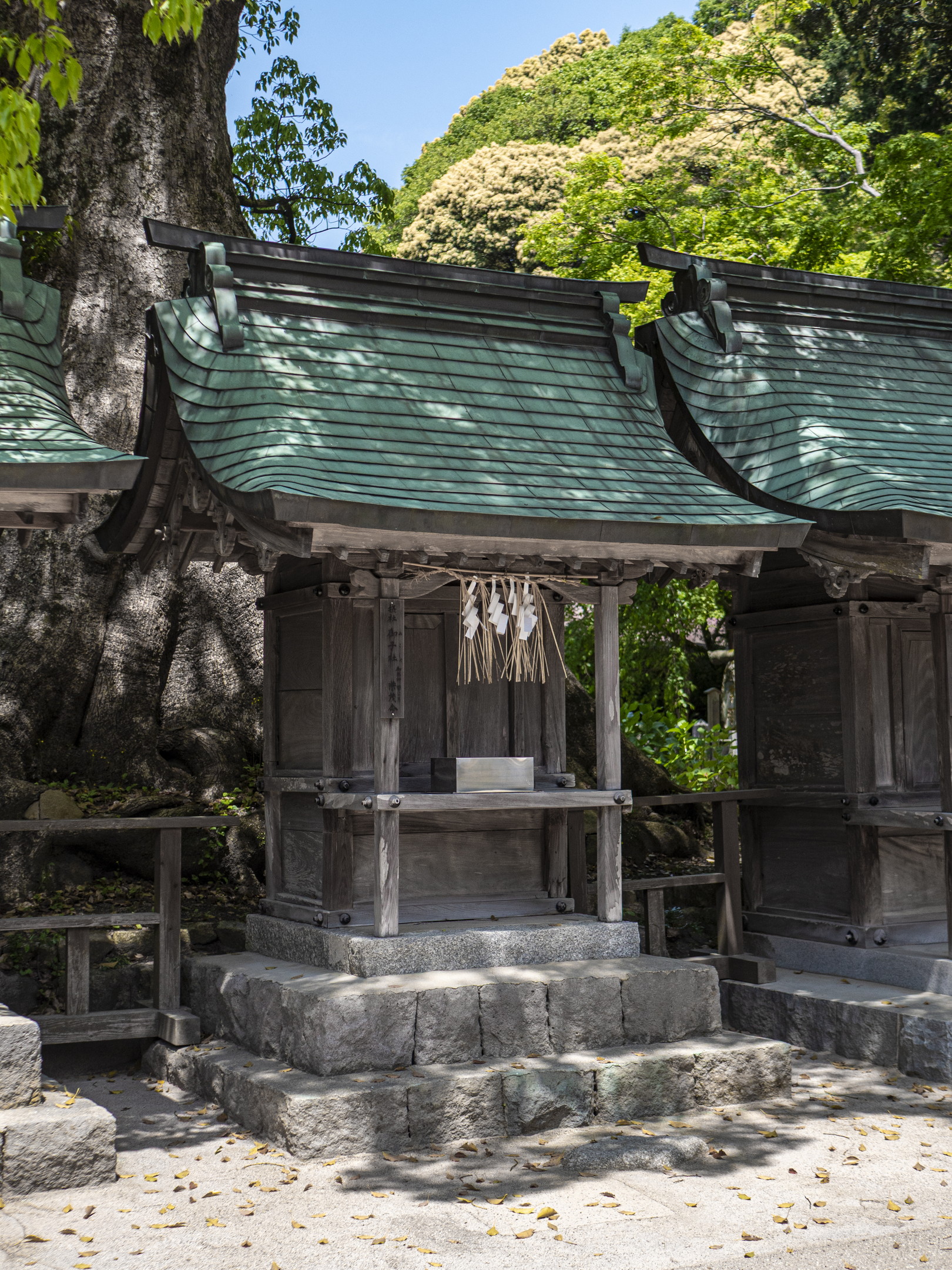 本殿後方の夫婦樟の前に並ぶ四社。道真公のお子様たちをお祀りし、御子社と呼ばれています。左から土佐国に配流された長男の高視命、越後国に配流された次男の景行命、遠江国に配流された三男の兼茂命、播磨国に配流された四男の淳茂命を祀っています。道真公が左遷されるのに合わせて官職を有する子息は悉く左遷されました。左遷された子息も含め、感慨を詠まれた道真公の次の詩が残されています。