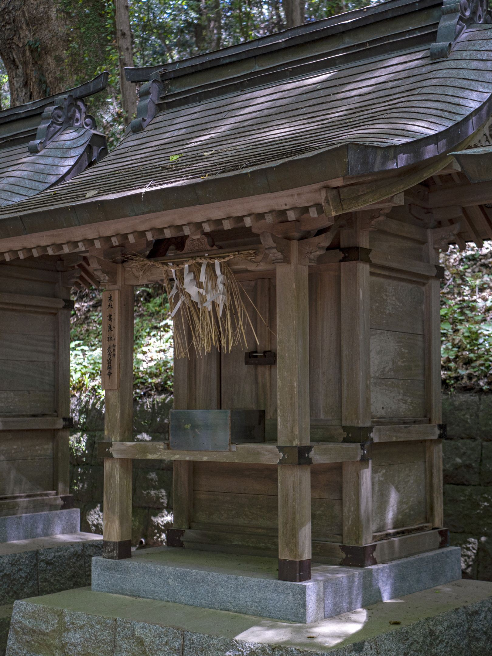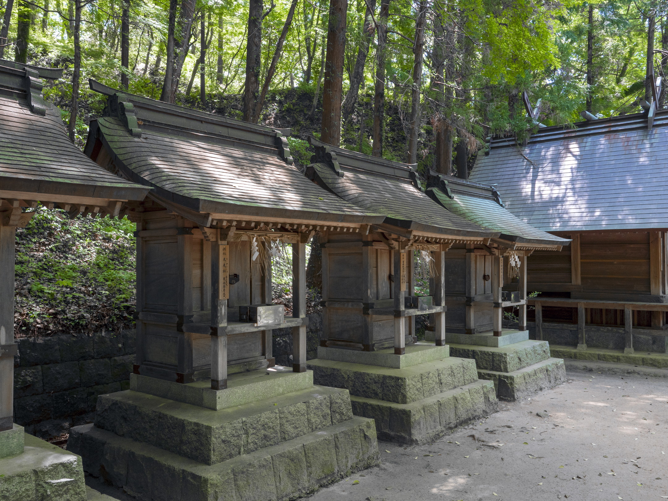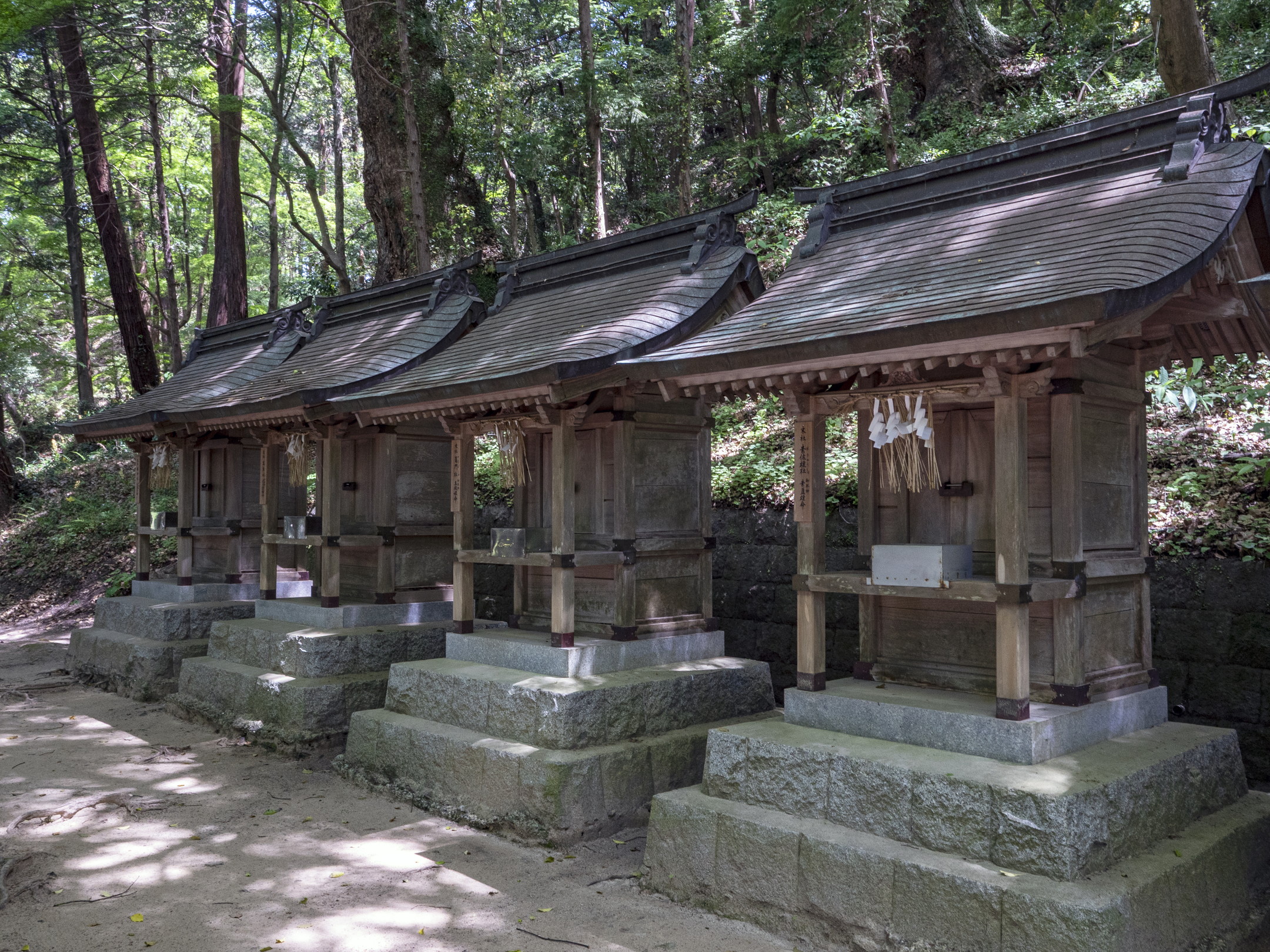 廻廊の東に摂末社が並びます。奥の段の南から北へ順に、皇太神宮、天穂日命社、金刀比羅社の3社。