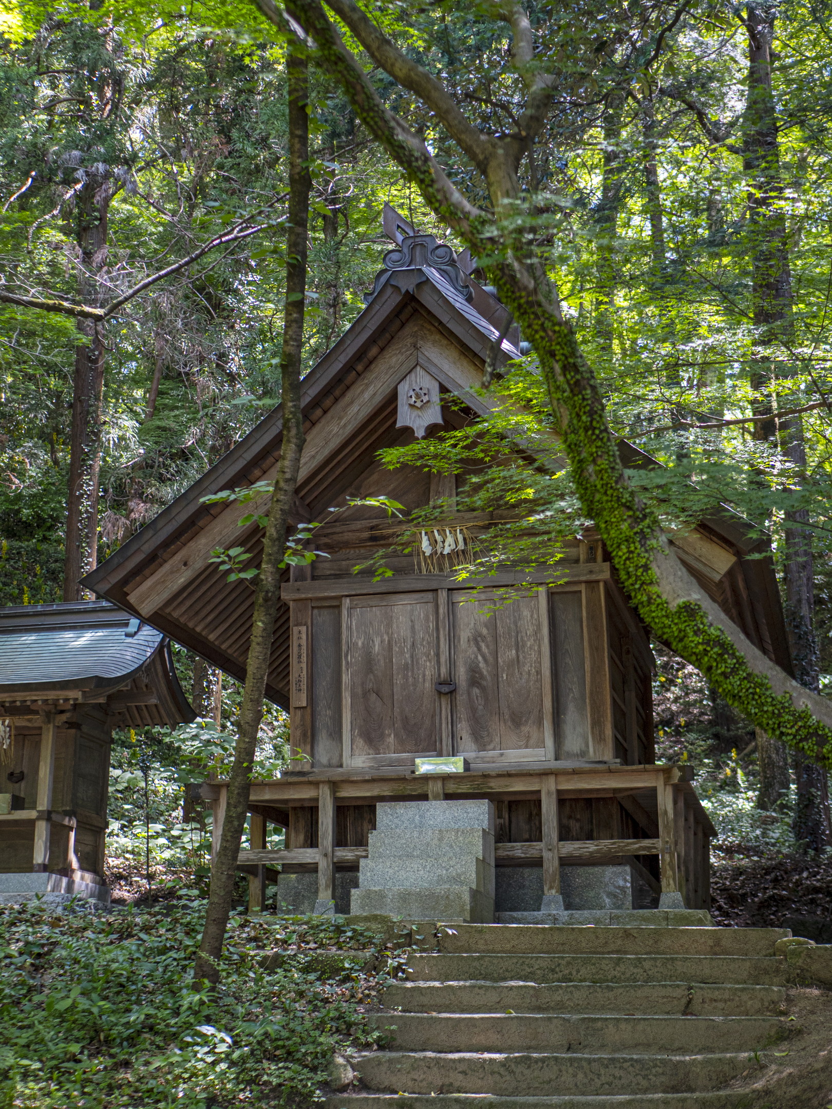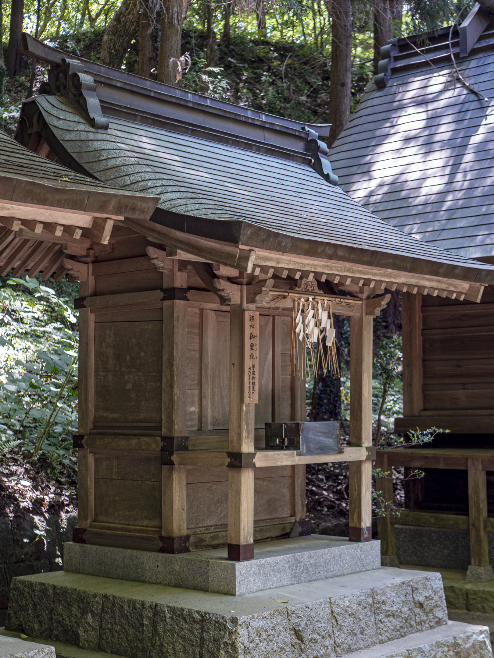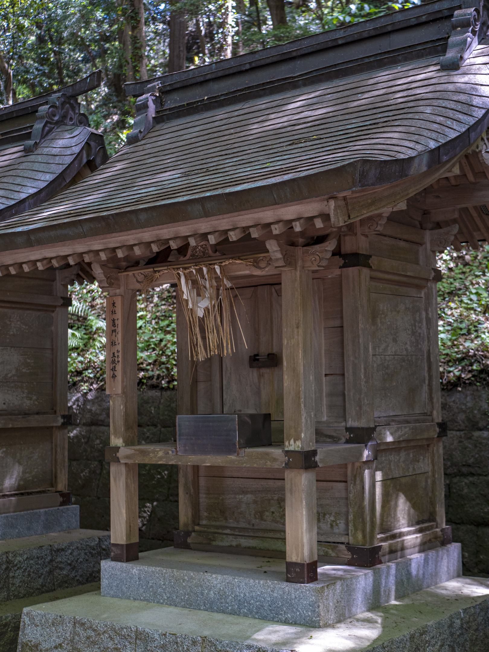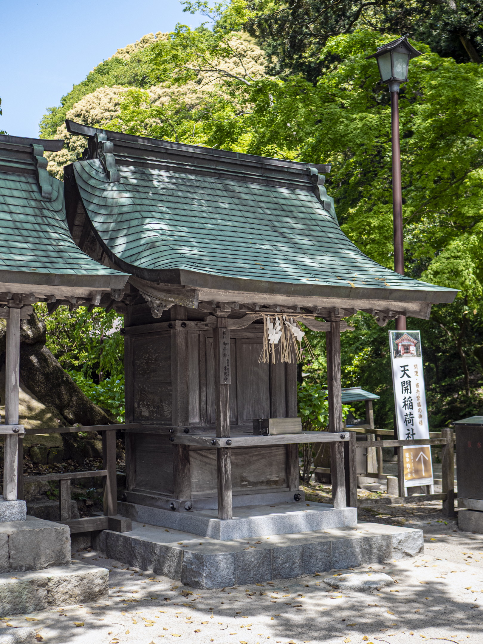 廻廊の東に摂末社が並びます。奥の段の南から北へ順に、皇太神宮、天穂日命社、金刀比羅社の3社。