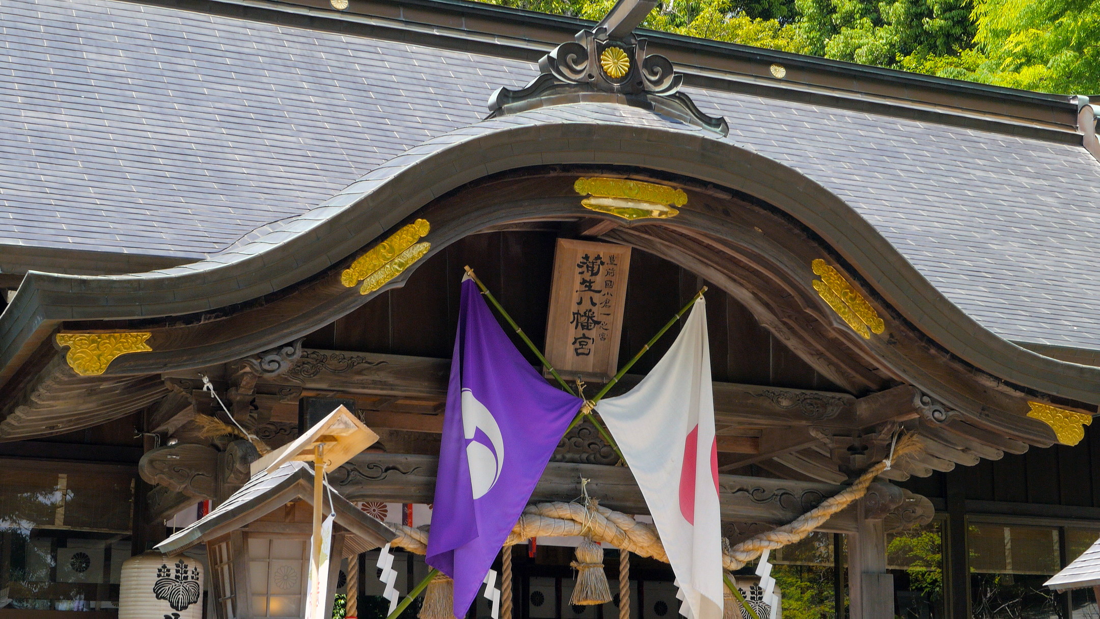 元暦2年3月24日(1185年5月2日)長門国赤間関における「壇ノ浦の戦い」にて、安徳天皇をかかげた平家一門は、源義経の率いる源氏軍に敗北します。平家の家長たる存在であった平時子は平家の最後を覚悟し、安徳天皇に「浪の下にも都の候ぞ」と言い聞かせ、安徳天皇と「三種の神器」と共に海に身を投じて自害しました。その入水で「三種の神器」も海に沈み、源頼朝は「三種の神器」が失われたことを嘆きます。規矩郡(企救郡)高濱浦に住む漁師の岩松与三が「三種の神器」の探索を命じられ、岩松与三は蒲生八幡宮に丹精を込めて祈願した後、浦中の漁師に命じて海に網をかけました。海底から網を引き揚げると八咫鏡と八尺瓊勾玉を網に得て、源頼朝に奏上しました。源頼朝は、大いに喜びこれを賞し、規矩一郡を岩松与三に賜りました。しかし岩松与三は、神宝を取り上げることができたのは、自分の力ではなく神力によるものだとして神恩に感謝し、賜った田地を蒲生八幡宮に奉り、壮麗な神殿を造営したのでした。