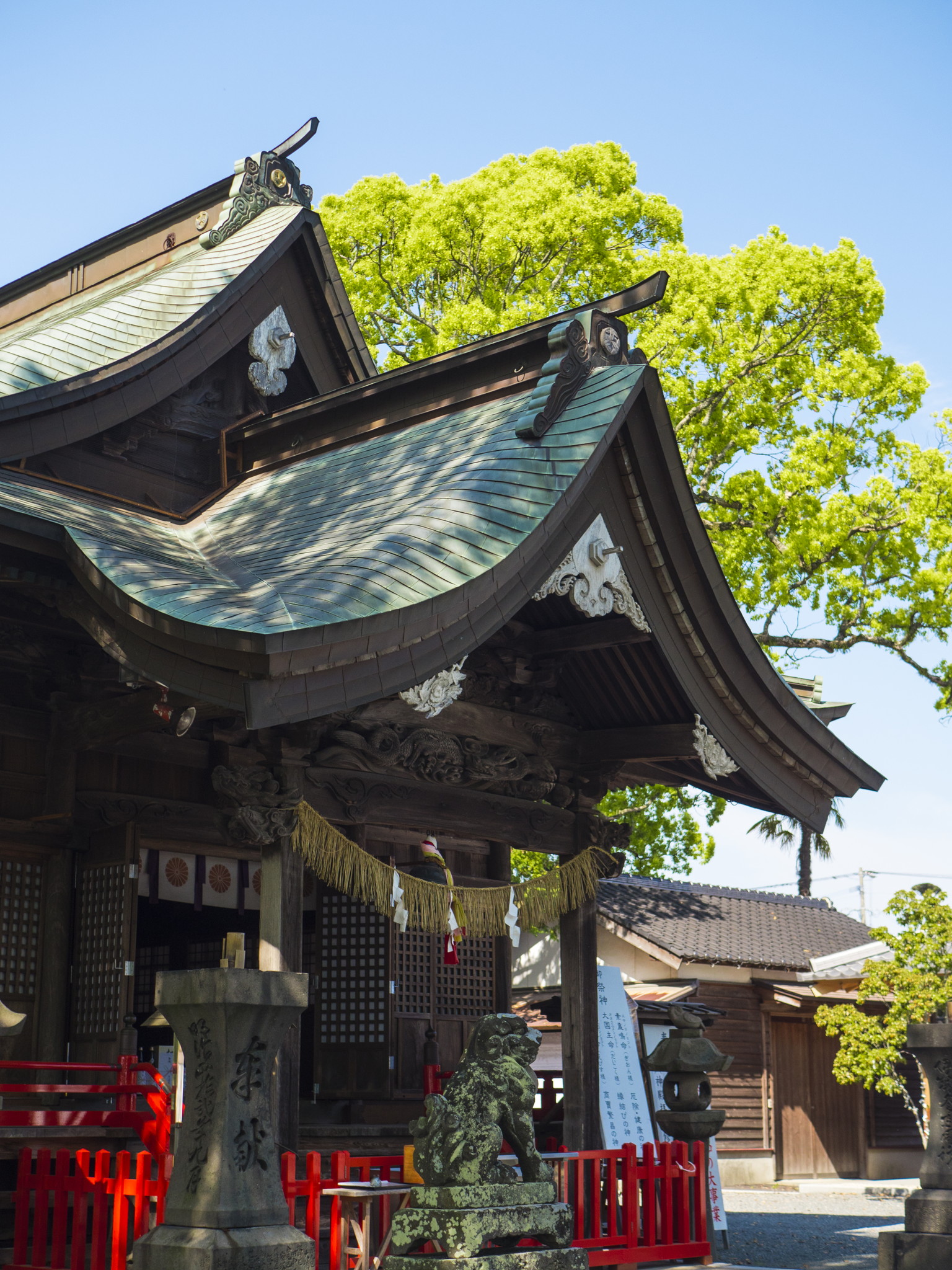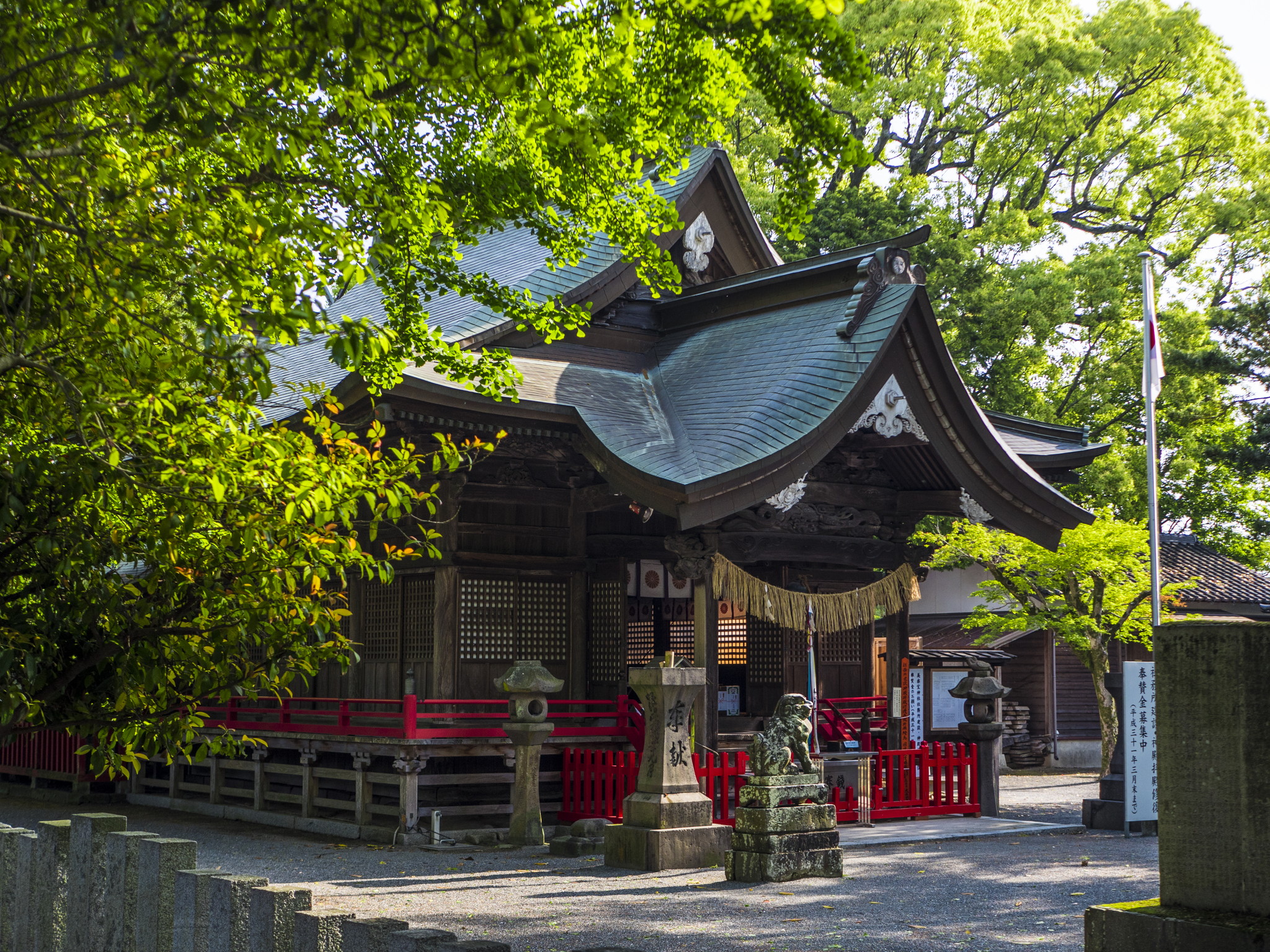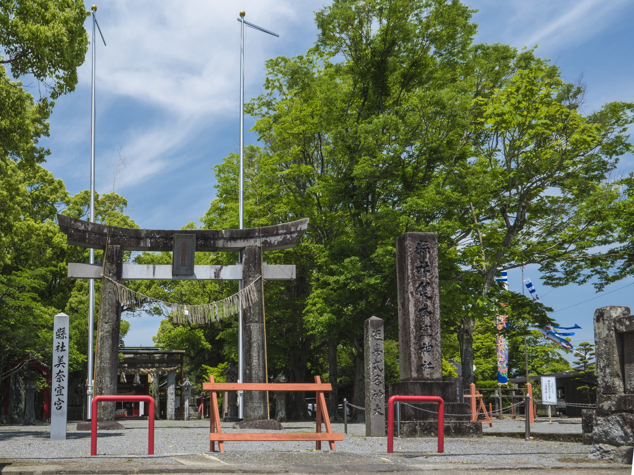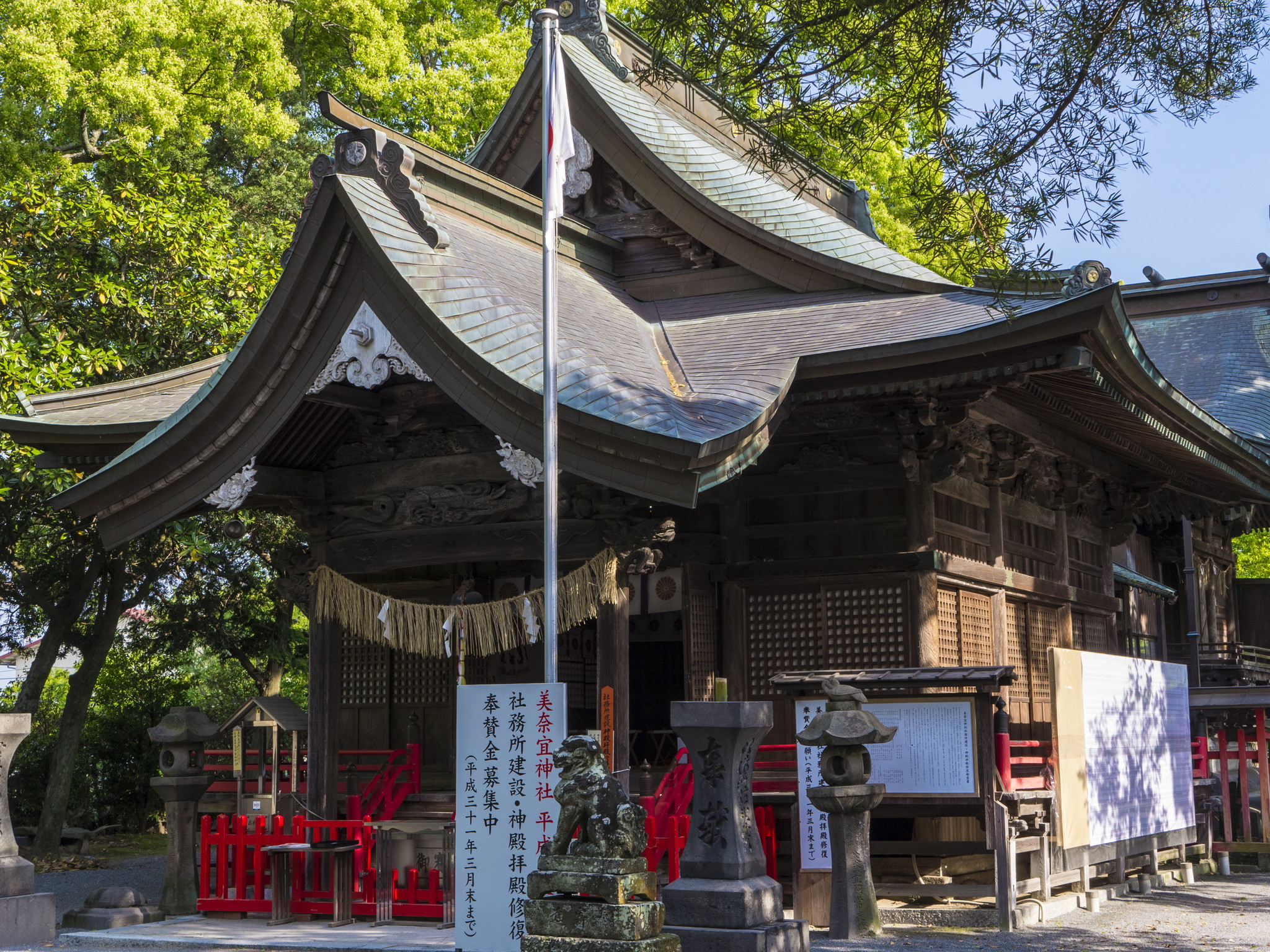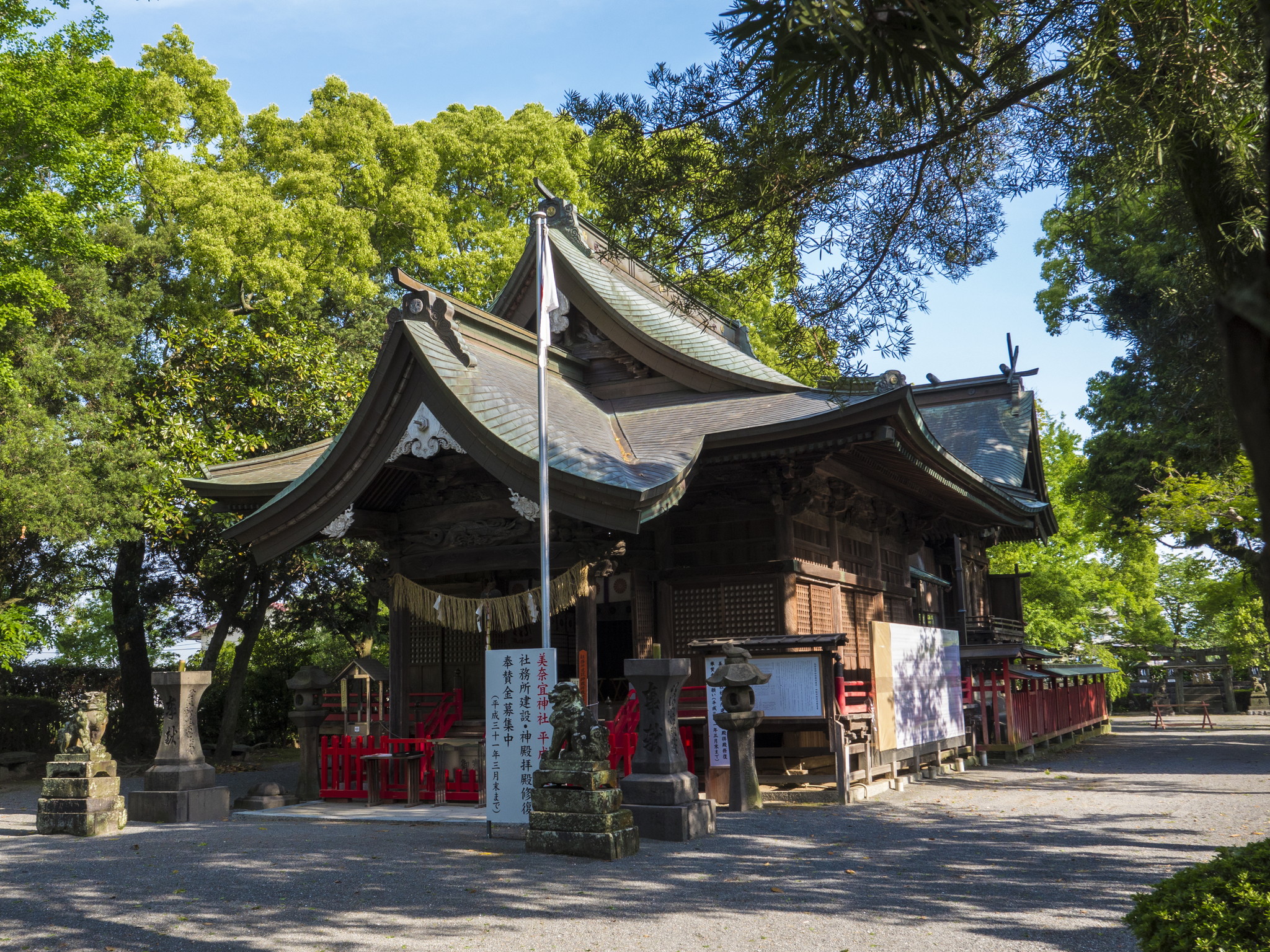 神功皇后摂政2年(202)創建とされる美奈宜神社は、中央殿に大国主命、東殿に素盞鳴命、西殿に事代主神の出雲三神を祀る神功皇后ゆかりの神社です。