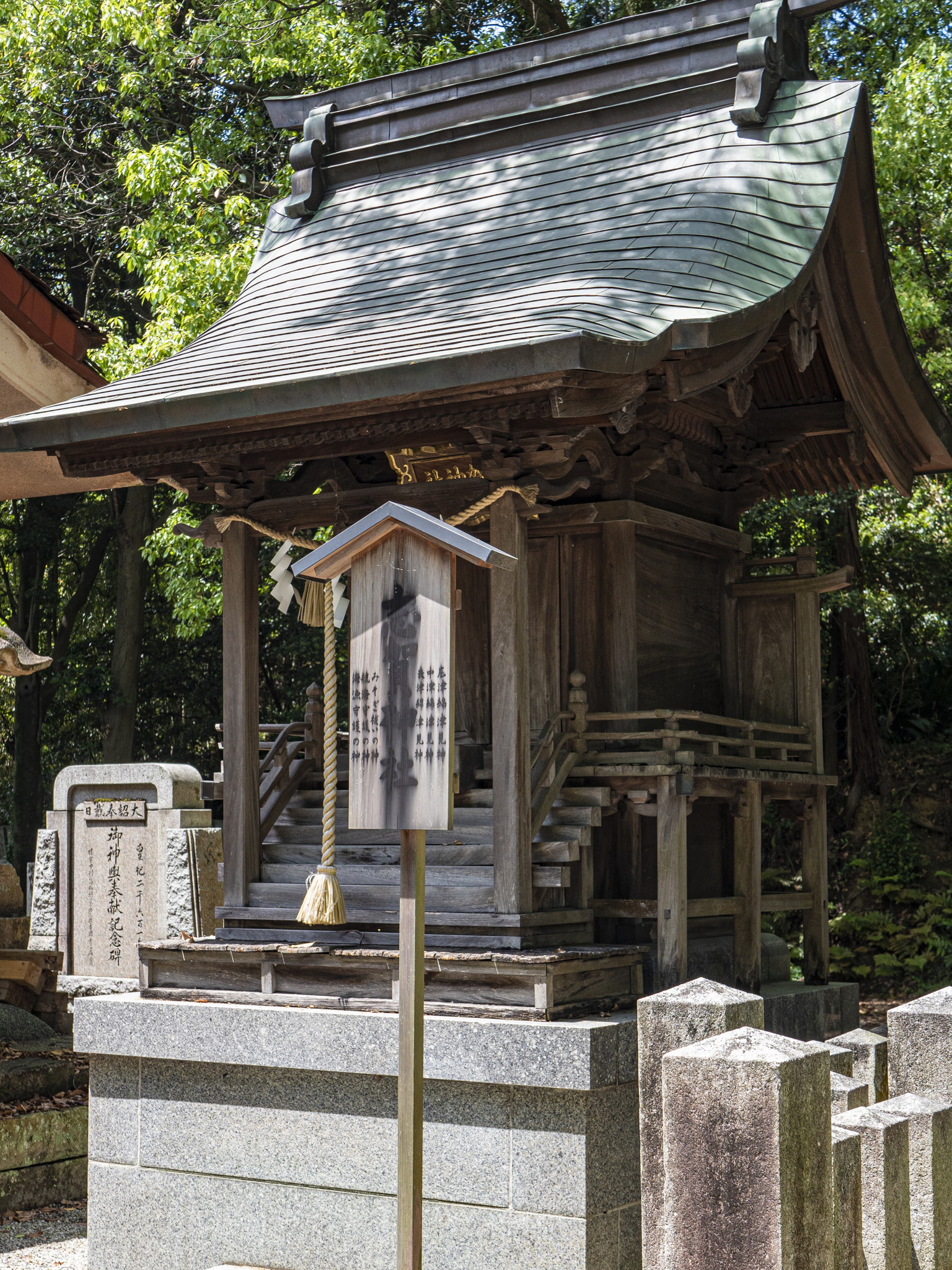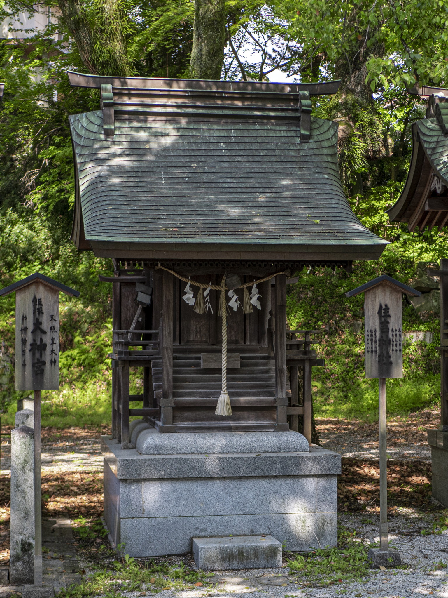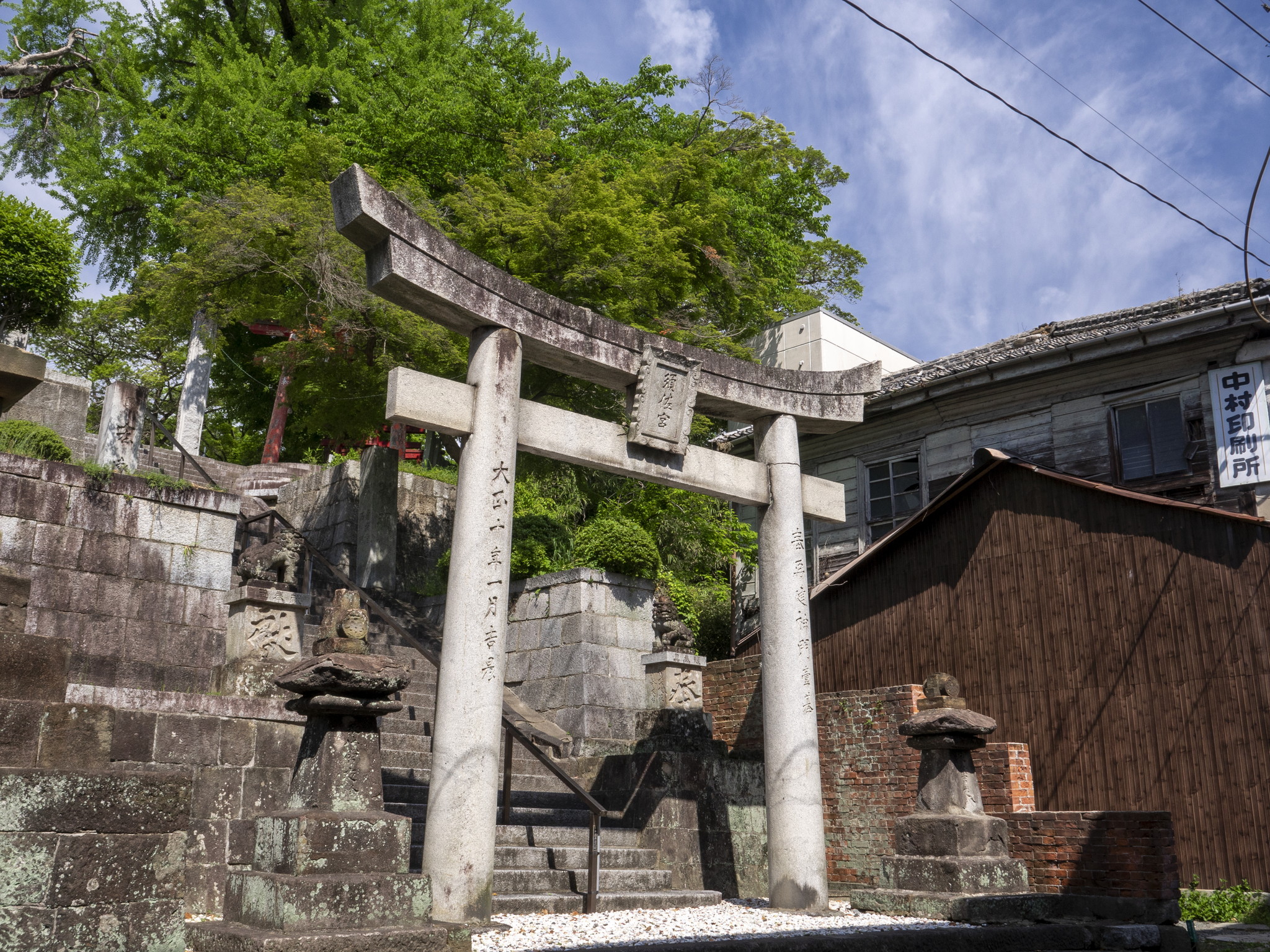 向町にあった大神宮が明治42年(1909)に境内に合祀されたもので、向町で「神の栄」の銘柄だった麻生酒造跡地に旧祠が残っています。
