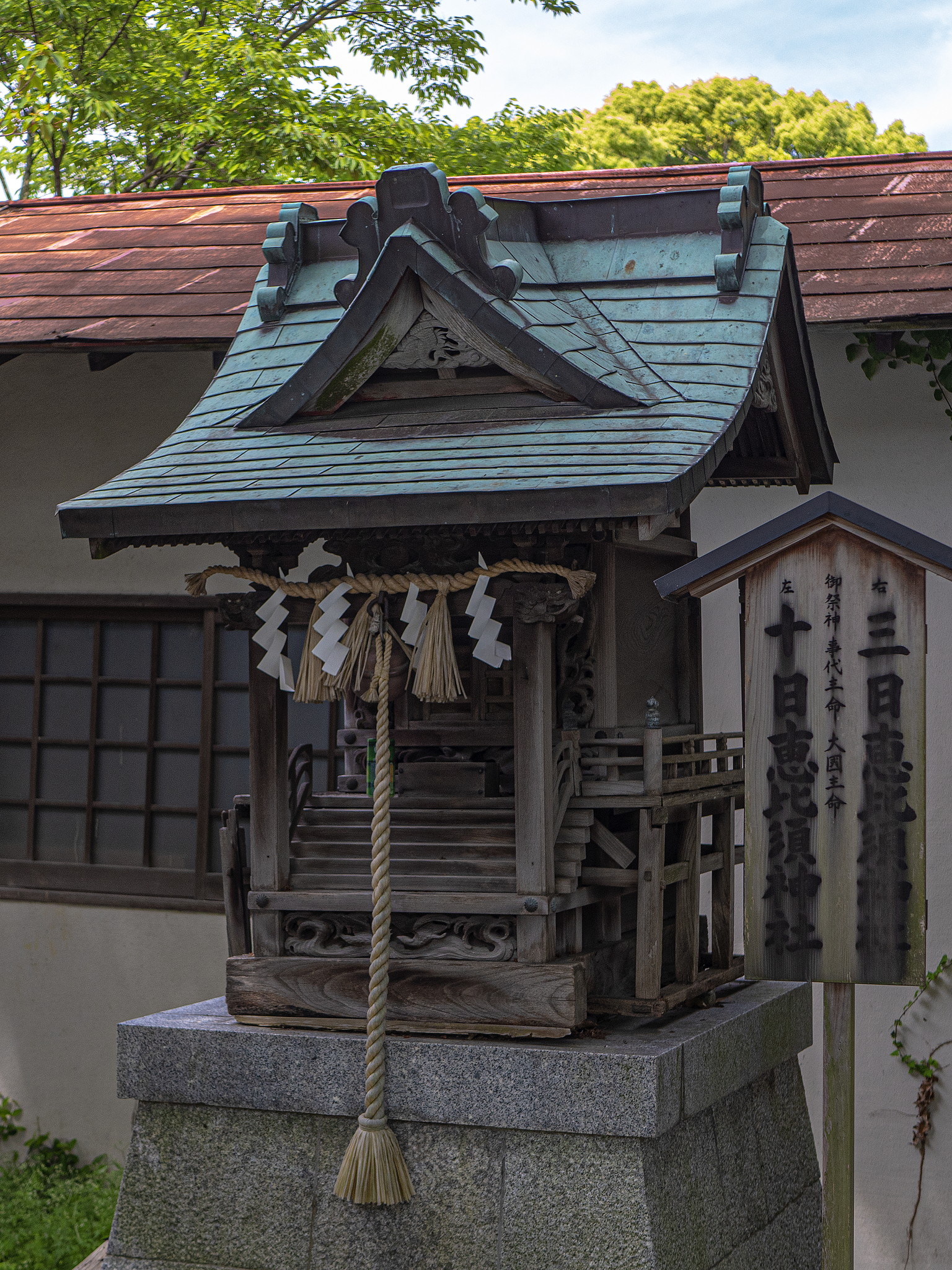 明治39年(1906)向町・本町にあった恵比寿神社を移設したものです。商売繁盛の御利益があり、事代主神と大国主命を祀っています。
