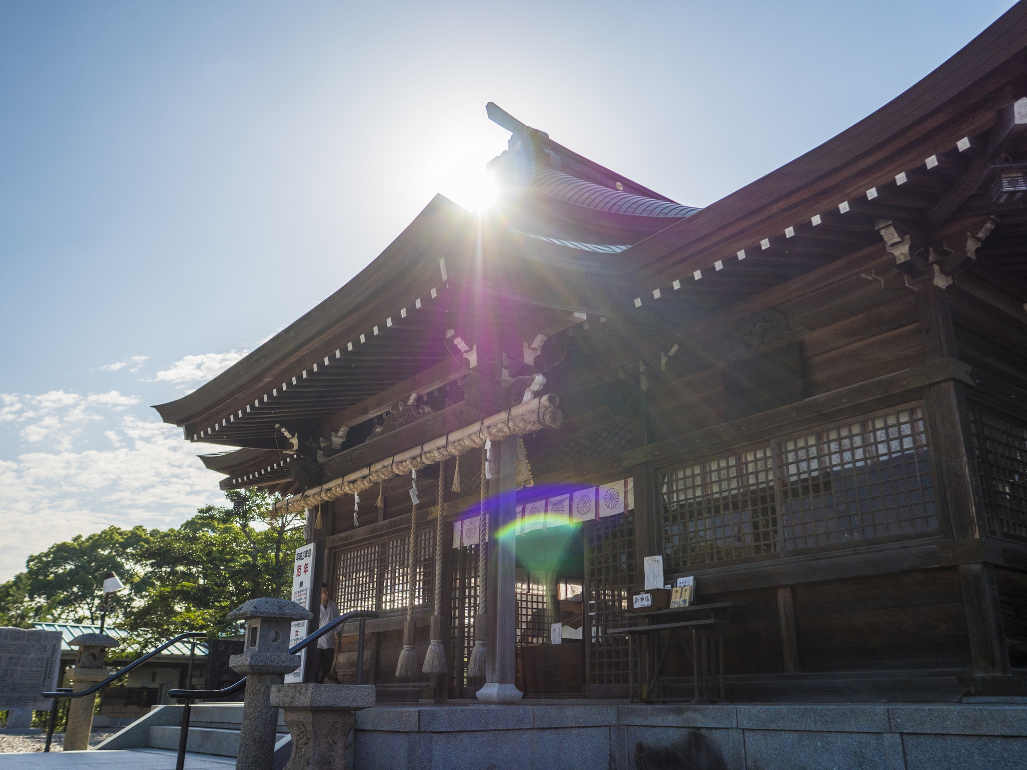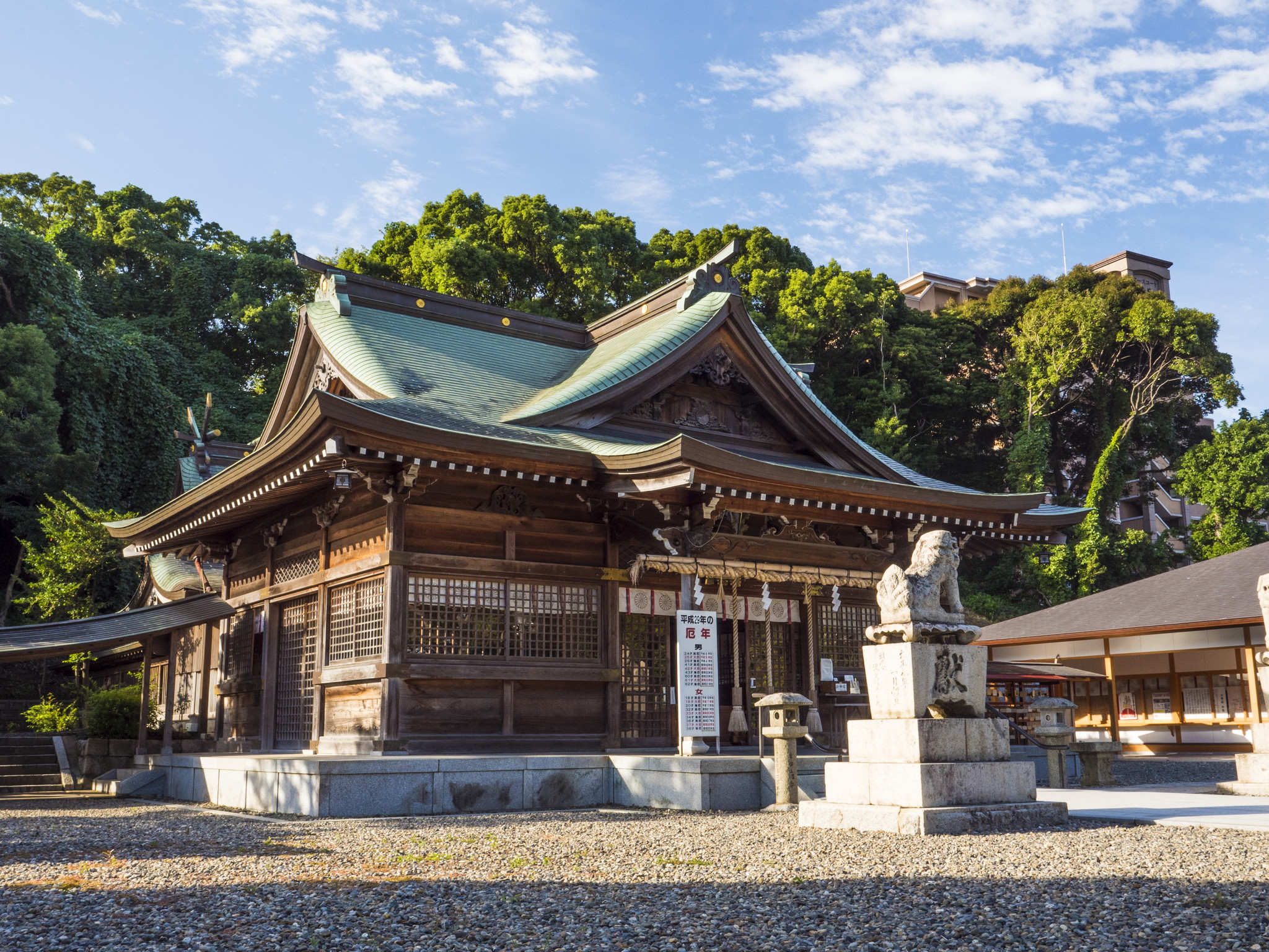 御祭神は、素戔嗚命と稲田姫命。相殿に住吉三神(表筒男命・中筒男命・底筒男命)を祀っています。慶長10年(1605)8月に初代福岡藩主の黒田長政が家臣の井上之房に命じて勧請。7月21~23日の御神幸祭は、岡田宮、同様に慶長10年(1605)に須賀神社が勧請された春日神社、岡田宮の旧鎮座地の一宮神社の3社に奉納される黒崎祇園山笠として知られています。黒崎祇園山笠は、昭和43年3月3日に県指定文化財の指定を受けています。