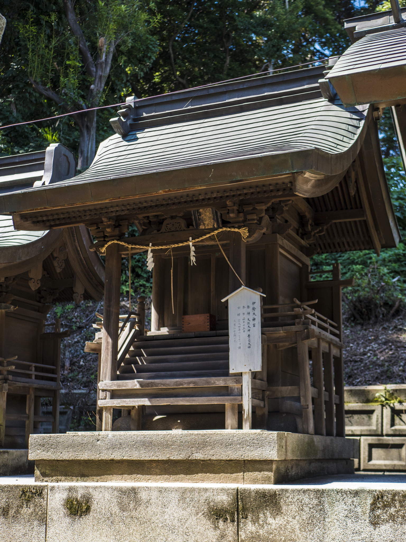 御祭神は、天照大御神・豊受大神。例祭日は4月15日。宝永4年(1707)久芳仁右エ門一巳により勧請。
