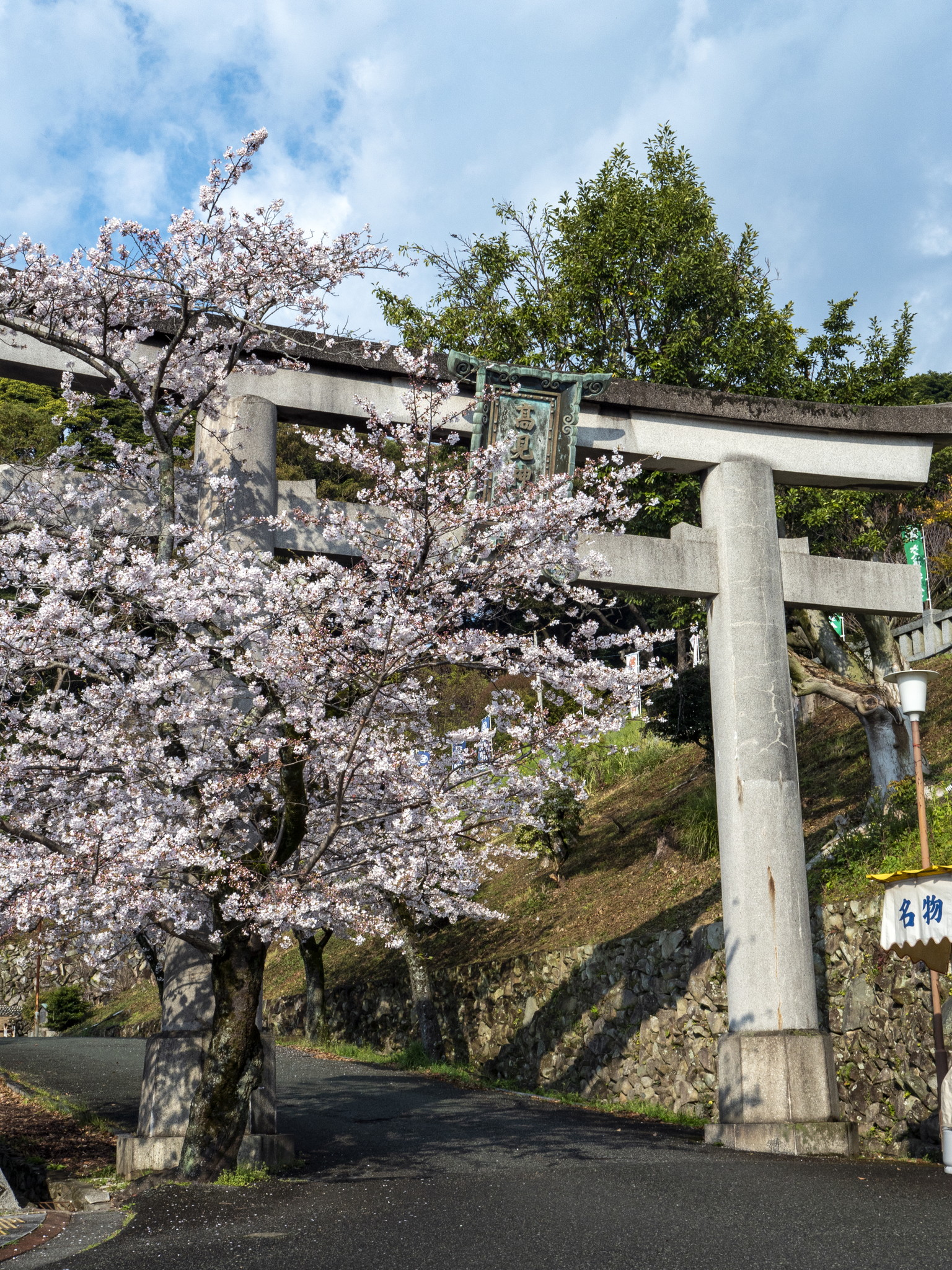仲哀天皇八年春正月己卯朔壬午、幸筑紫。時岡縣主祖熊鰐、聞天皇之車駕、豫抜取五百枝賢木、以立九尋船之舳先、而上枝掛白銅鏡、中枝掛十握剱、下枝掛八尺瓊、参迎于周芳沙麼之浦。而獻魚鹽地。