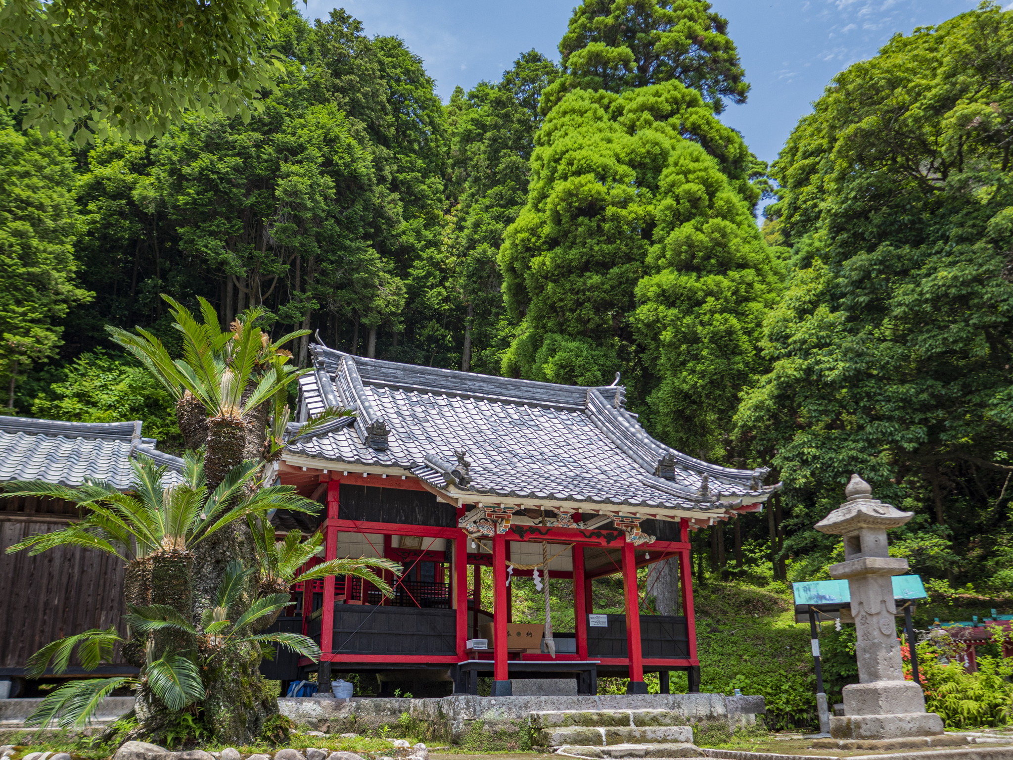 現在の社殿は、明治40年(1907)に改築され、その後修繕を加えたものです。春日造の本殿は間口2間・奥行1間半。入母屋造の拝殿は間口3間・奥行2間。例祭は、旧暦9月9日。旧暦3月16日の祈年祭には、境内で農耕・種蒔・奉射の御田植神事が行われます。能面五面が伝わっています。
