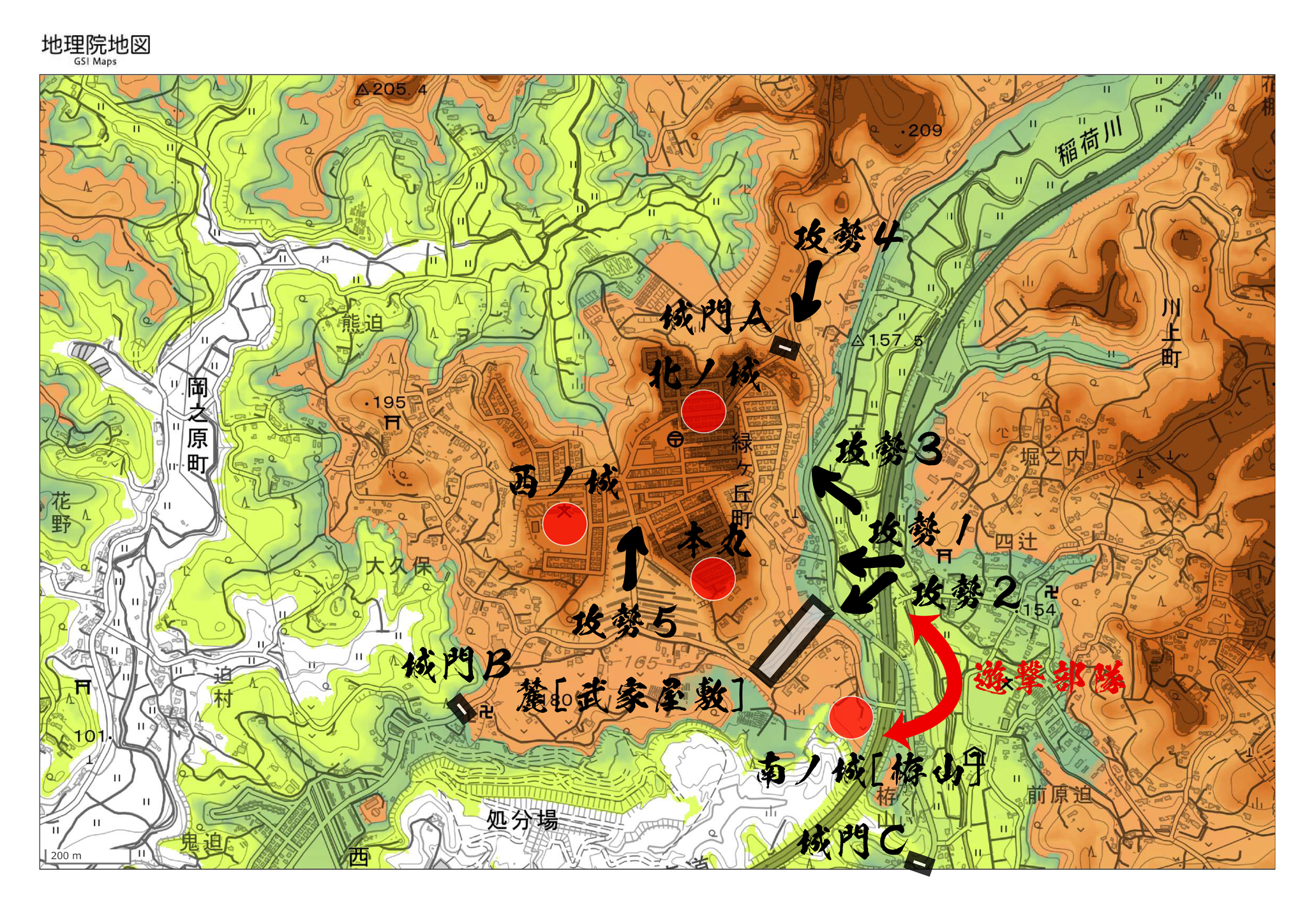 - 地図の薄茶(160m)を三の丸、茶(190m)を二の丸、焦茶(200m)を
