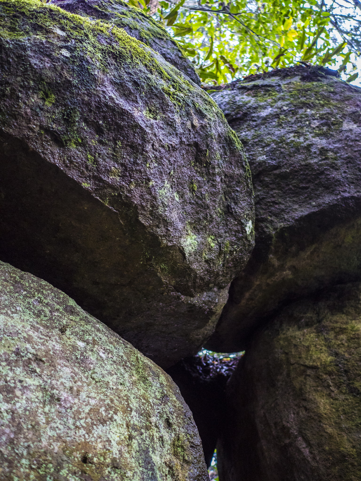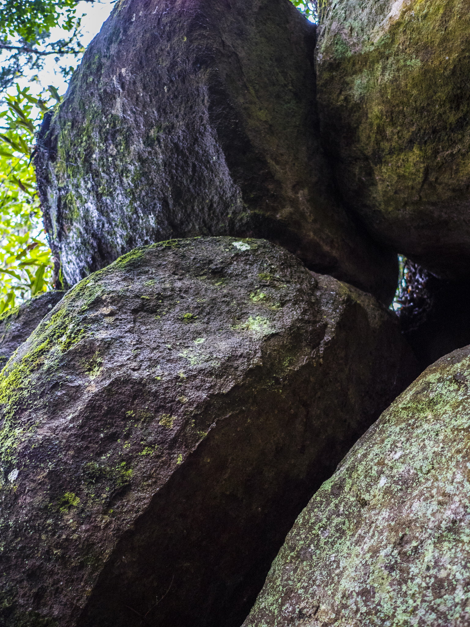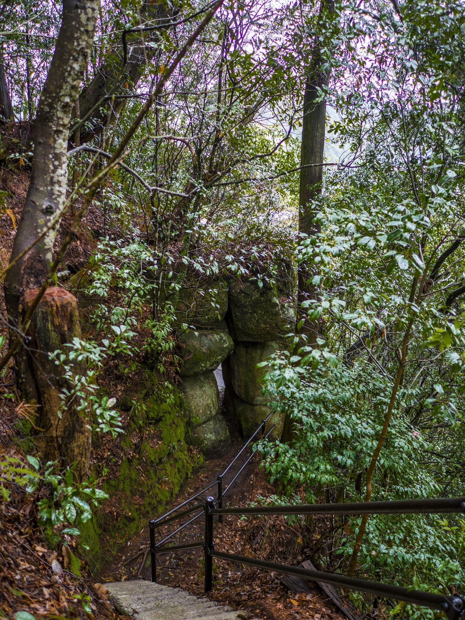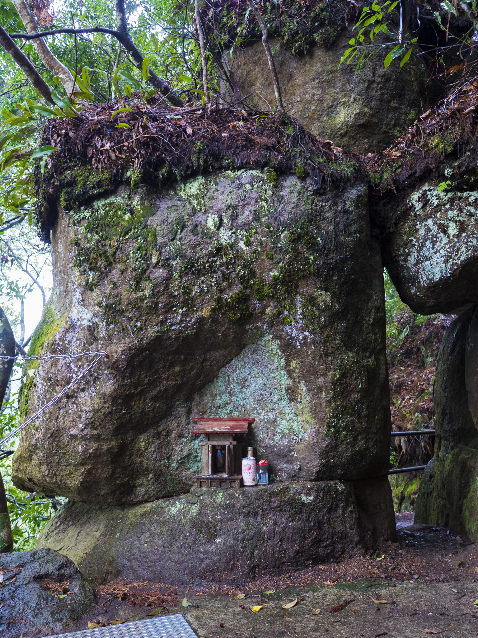 雨宮丘の頂上に鎮座する社殿の奥にある懸崖には、奥の院である「三産くぐり」と呼ばれるトンネル状の大きな自然の石があります。長く嫡男に恵まれなかった人吉藩主の相良長寛は、明和7年(1770)に雨宮神社への参拝の折、周囲に勧められこの巨石「三産くぐり」の間を身を細めてくぐります。すると効験あらたか、相良頼徳、相良頼之と男子出生の幸運に浴したとされています。以来、「幸せを産む」・「安らかに産む」・「金を産む」の三つの「産」を授かる御神徳の地として知られています。