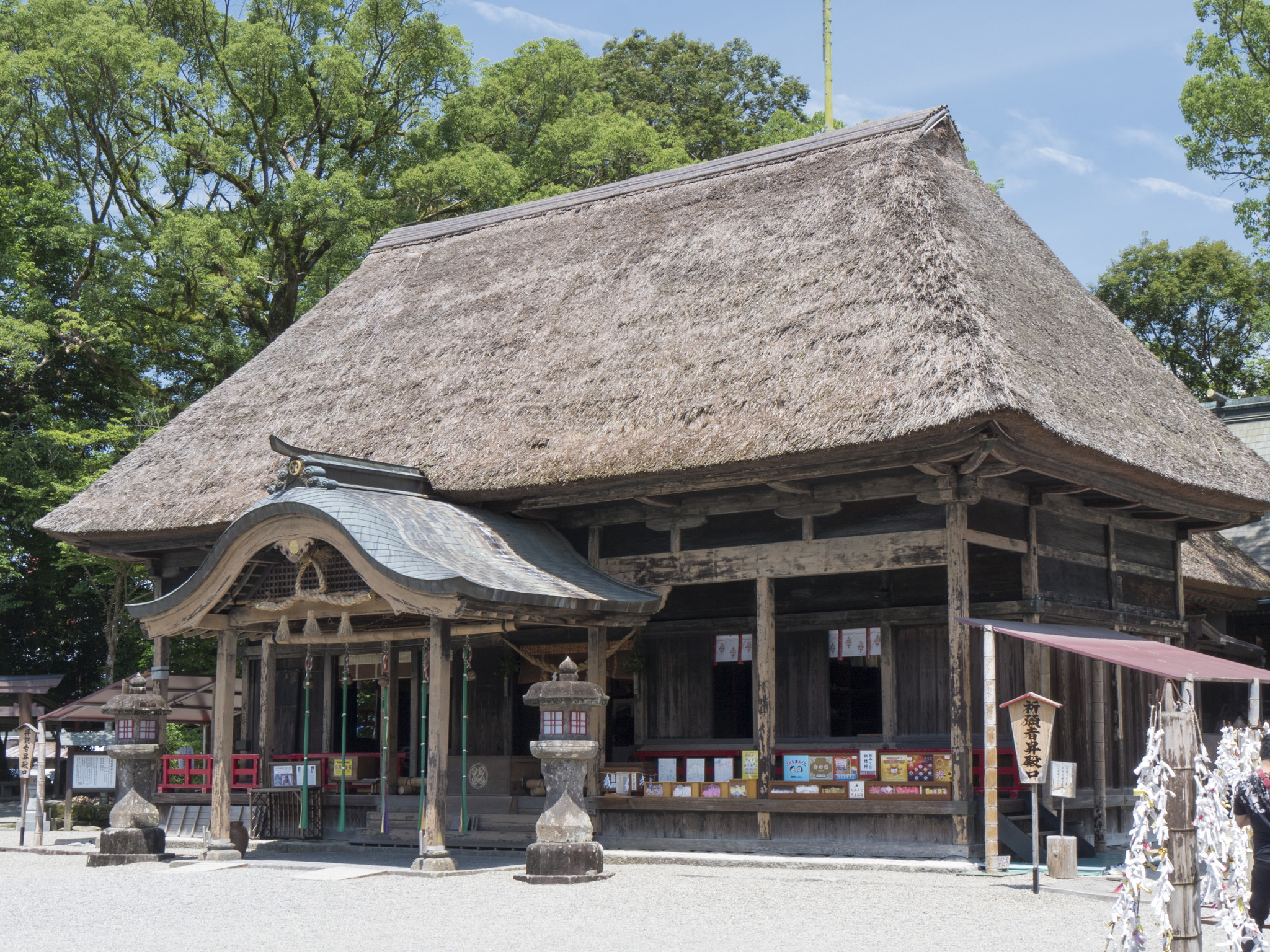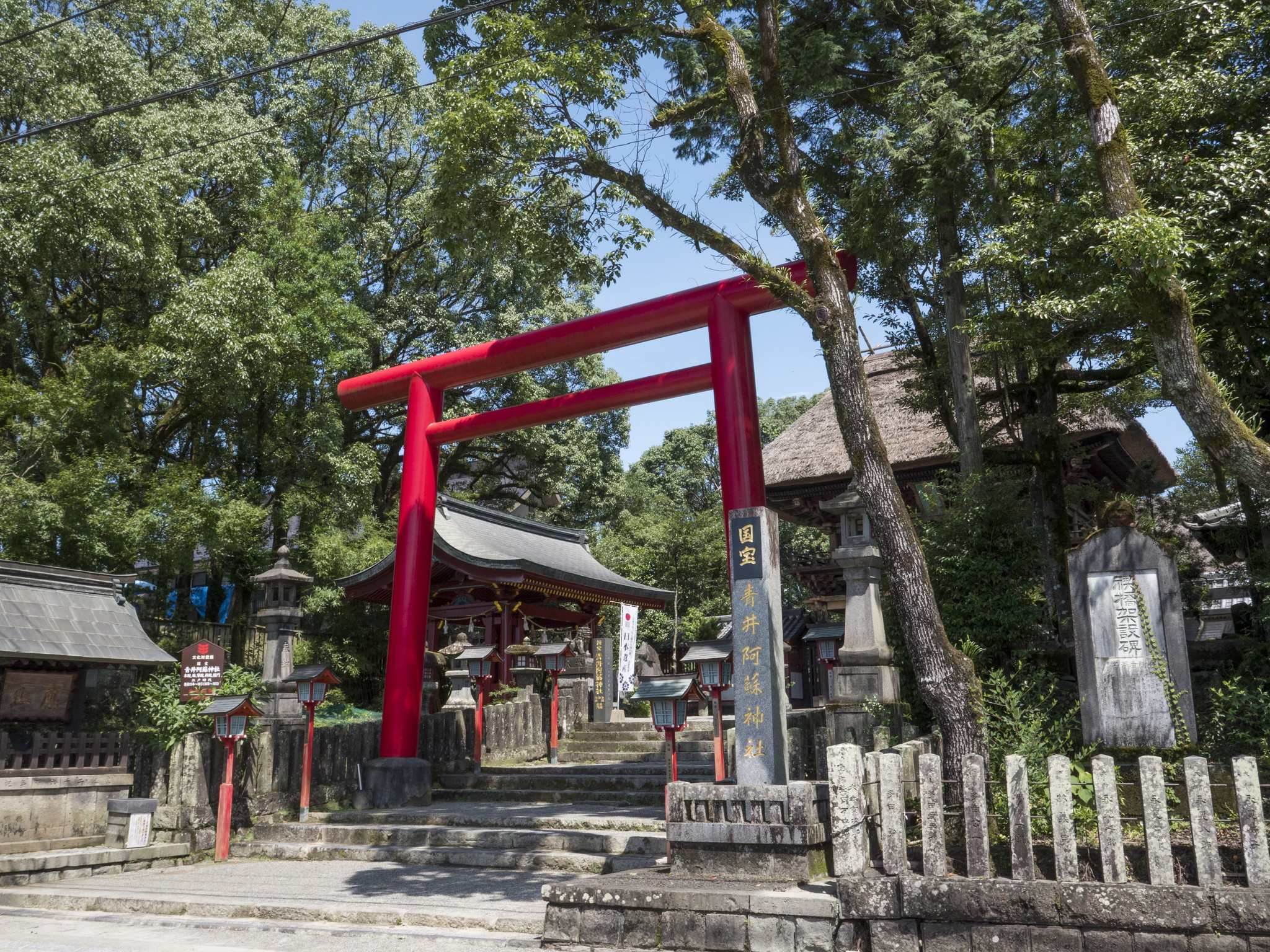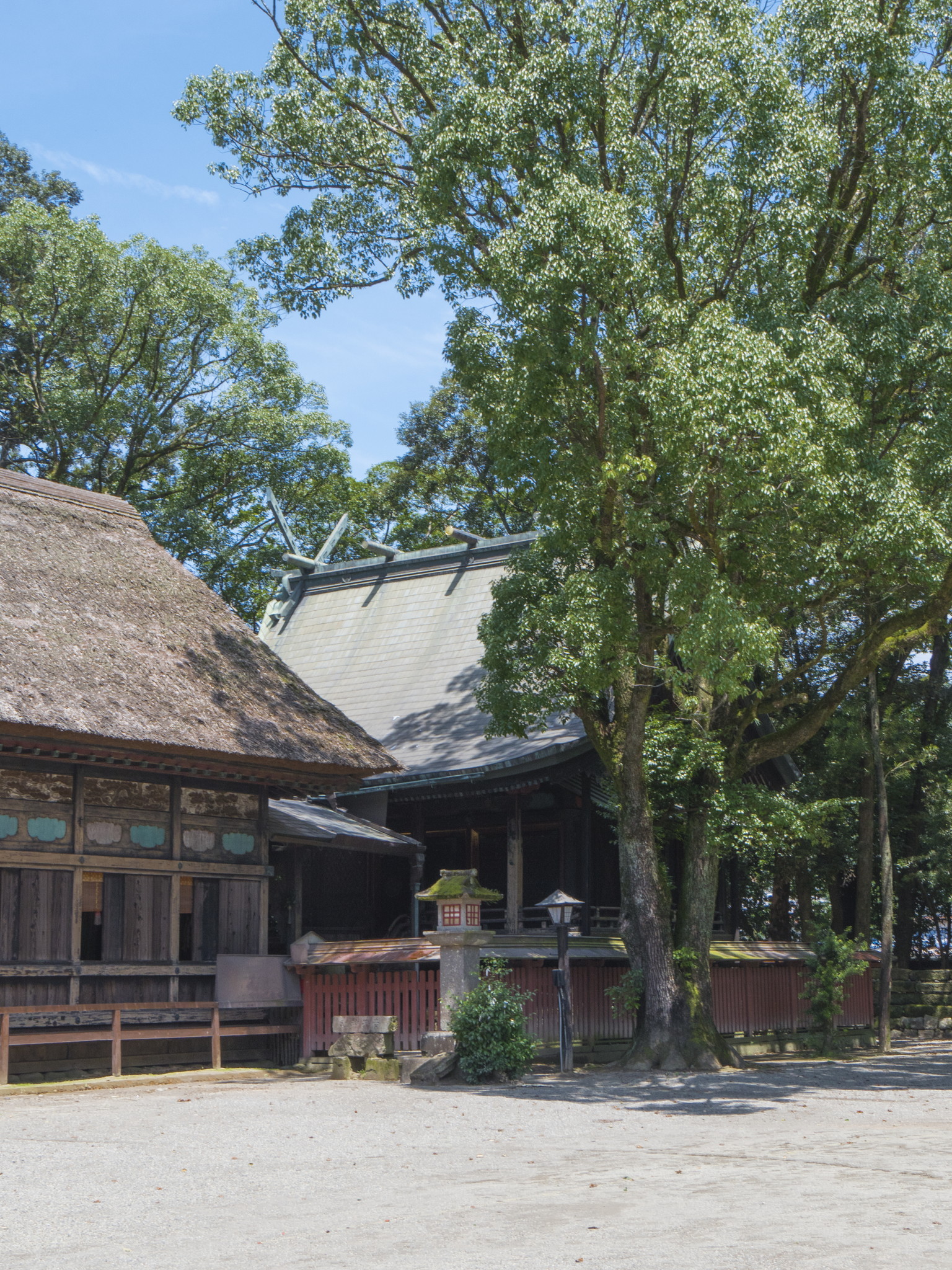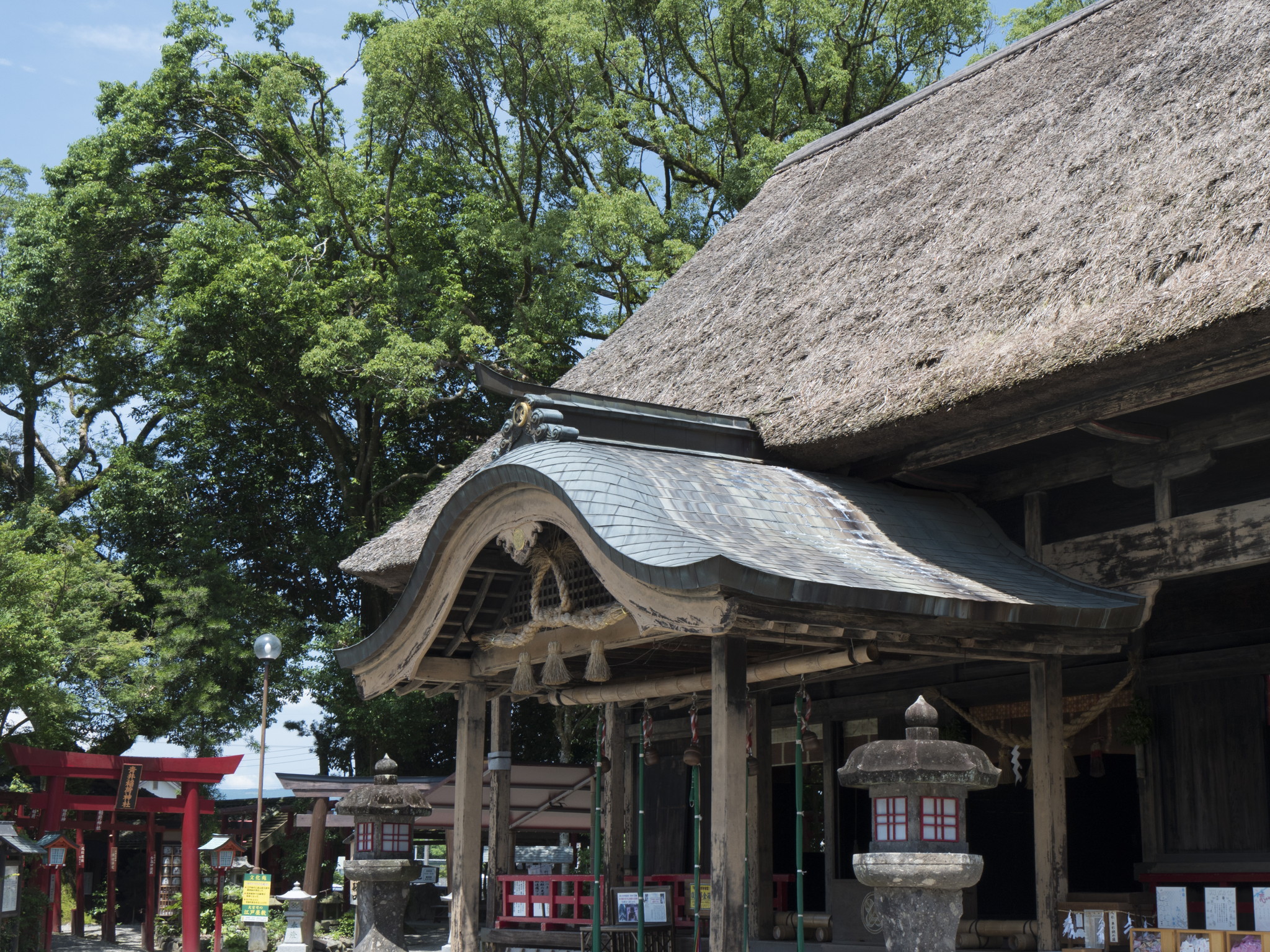 社殿向かって右手、御神木の神楠の隣に鎮座するのが青井大神宮です。御祭神は、右殿が天照皇太神、左殿が豊宇氣皇太神。例大祭は9月16日。月次祭は毎月16日(お伊勢講会)です。明暦2年(1656)50代大宮司に就任した青井惟治は、京都の吉田神社において唯一神道の奥義を伝授されたのを機に、それまでの神仏習合の風習をあらためます。寛文3年(1663)に、この青井大神宮を創建するなど根本的な神社改革を行いました。現在の両殿からなる社殿は、寛保2年(1742)に楼門東側の霊地に造営されたものですが、昭和34年(1959)に現在地に遷されました。