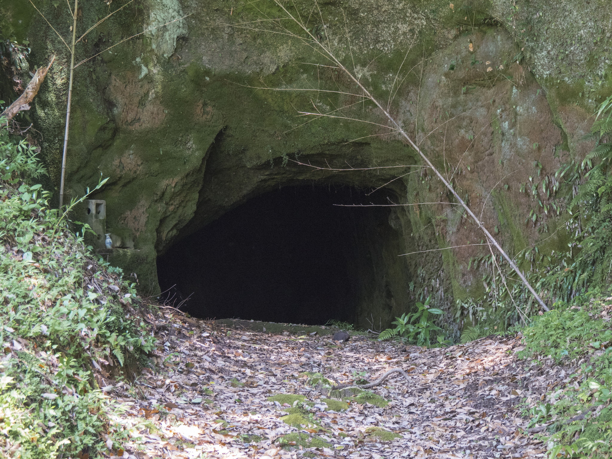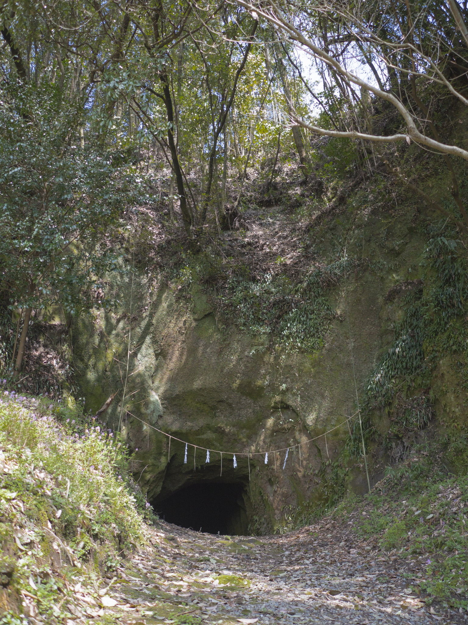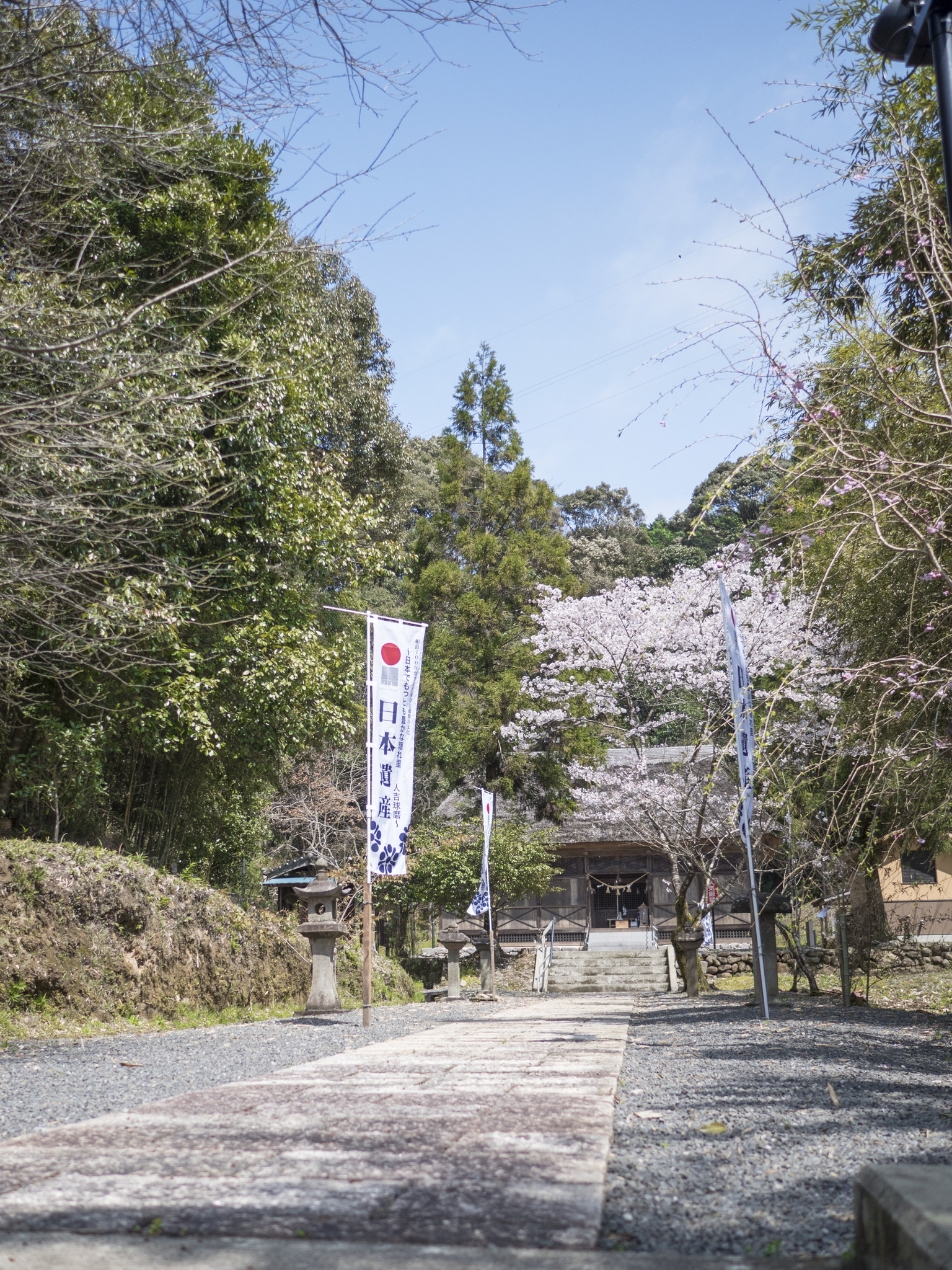 国指定重要文化財の指定を受けている凝灰岩製の石鳥居は、参道(約200m)の入口に立ち、元禄14年(1701)に寄進されたもので、南柱に「奉寄進岩屋講衆中」、北柱に「元禄十四年辛巳年三月吉日」と刻銘があります。稚児柱がついた両部鳥居形式(権現鳥居・四脚鳥居)では球磨地方唯一のもので、在銘鳥居としても最古のものです。鳥居は正確に西を向いており、春分・秋分には鳥居の中央から太陽が昇り、鳥居の中央から太陽の沈むのを見ることが出来ます。参道が200m以上もあるのは、周囲の山から離れる事で、太陽をよく拝むことが出来るように設計されたものと思われています。