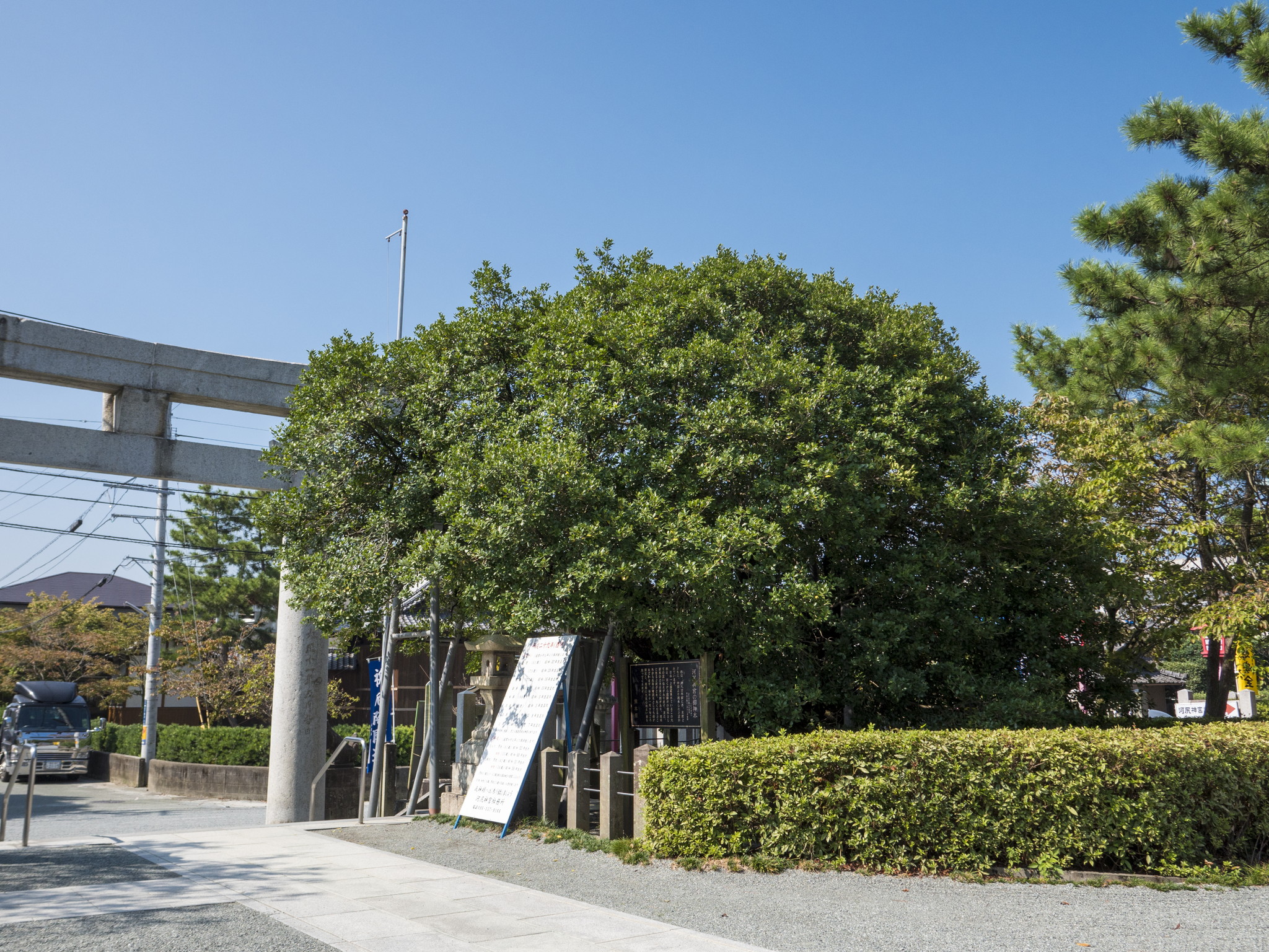 日本一と推定されている御神木の大柊は、古くから魔除けの霊木としての言い伝えがあります。また、若木のときには葉に刺があり、老木になると刺がとれ、丸くなることから長寿の守護木としても仰がれています。毎年、11月下旬ごろ開花し、周囲に大変心地よい香りを放ちます。