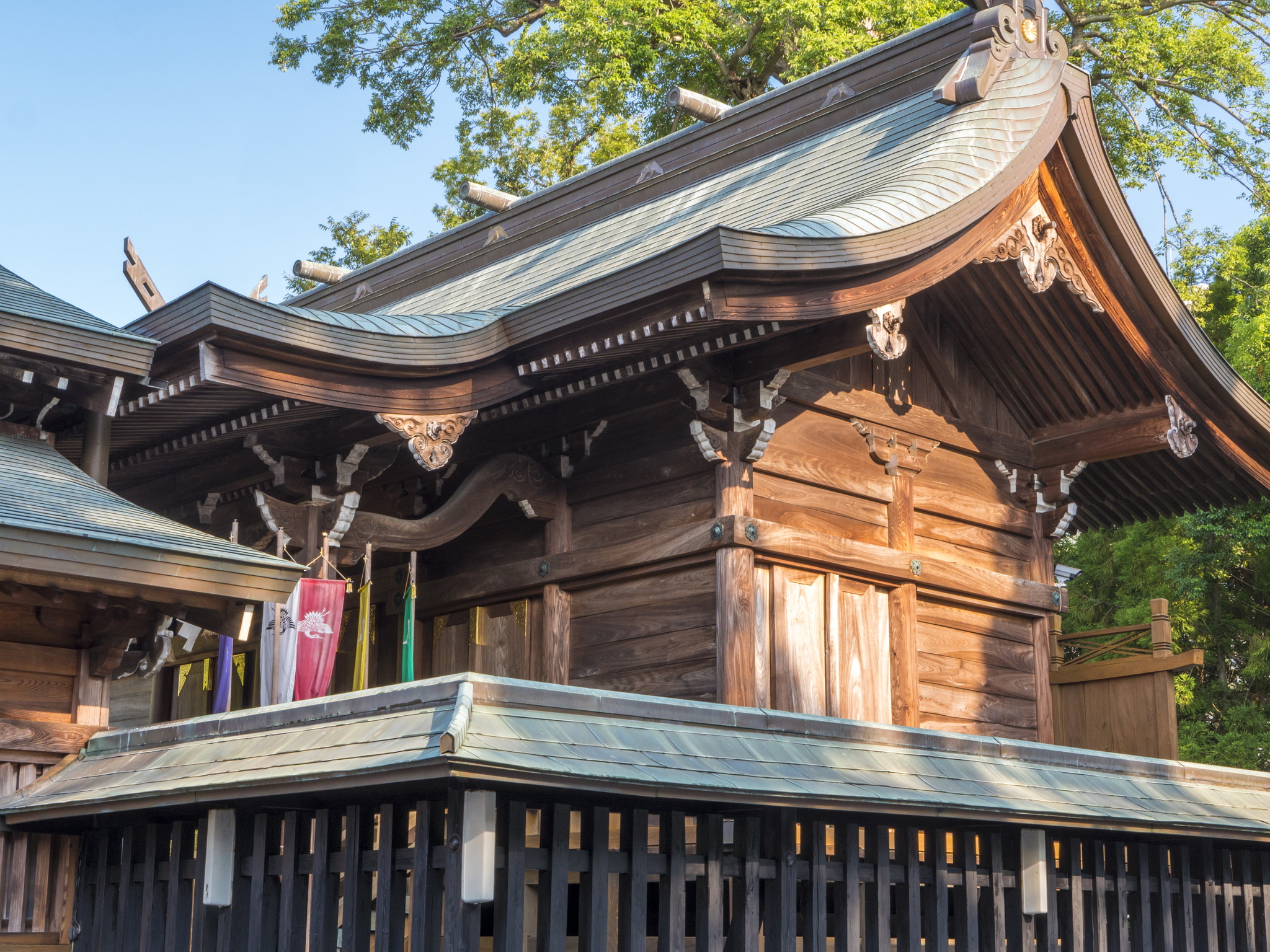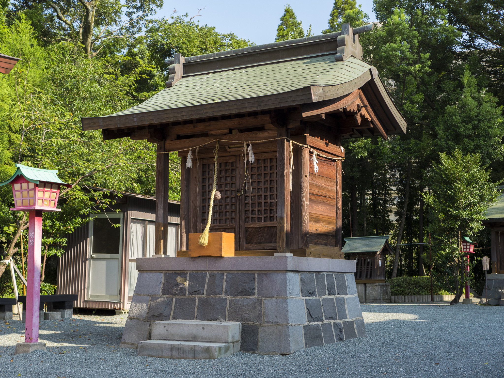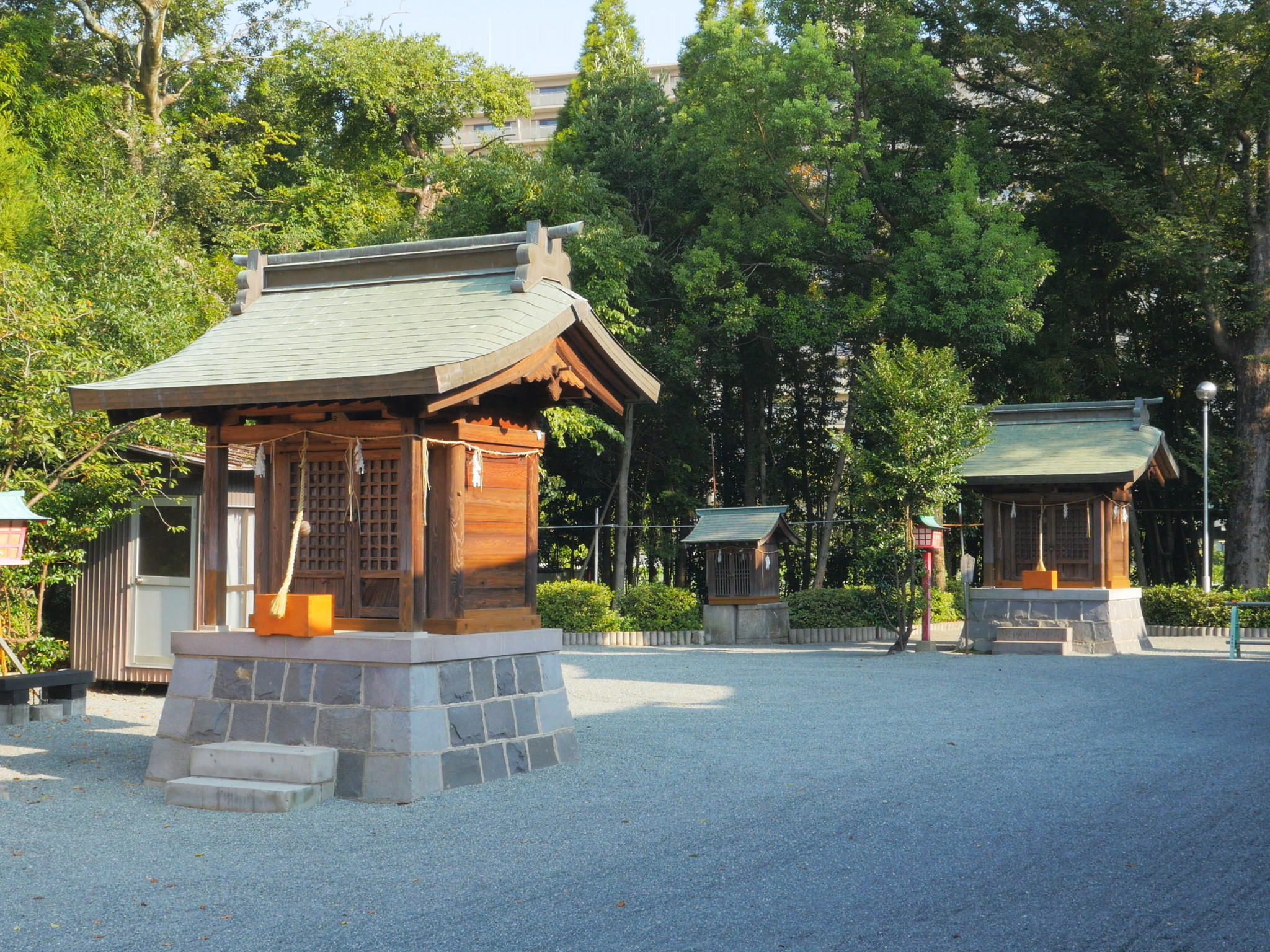 社殿向かって左手前の今宮神社は、河尻三郎源実明、並びに河尻氏代々の当主を祀っています。その奥の十六神社の御祭神は、 河尻氏当主代々の奥方です。社殿向かって右手奥の歳神社は、大歳神・御歳神・若年神・宇迦之御魂神を祀っています。歳神社の右手の若宮稲荷大明神は、宇迦之御魂神を祀っています。