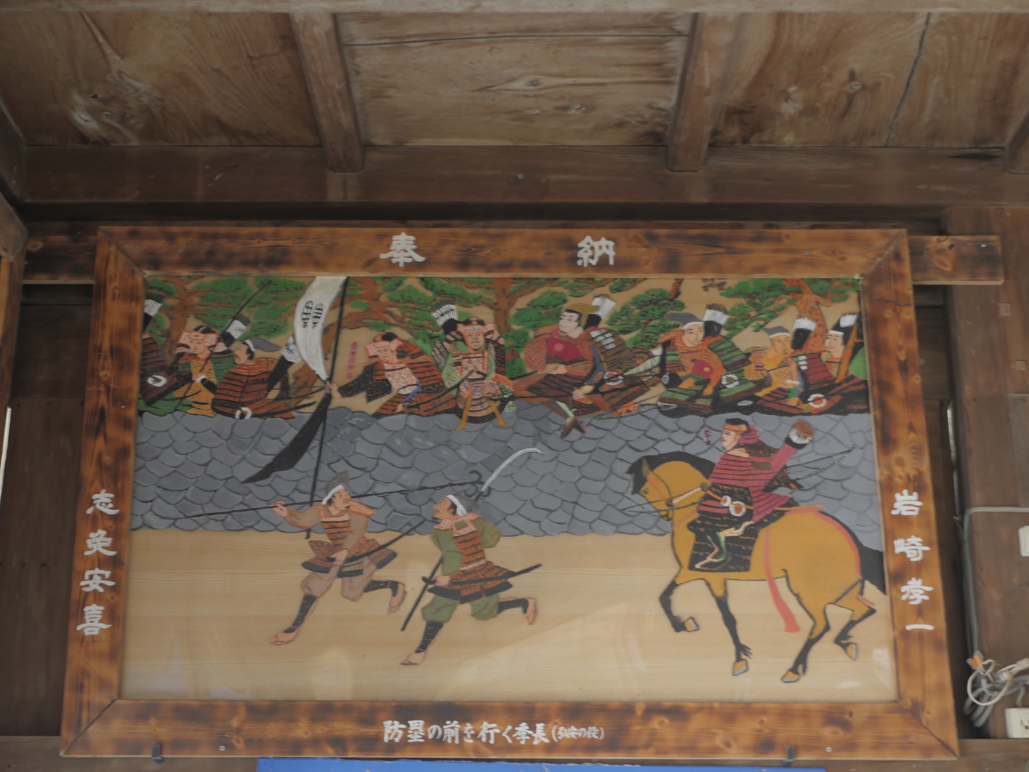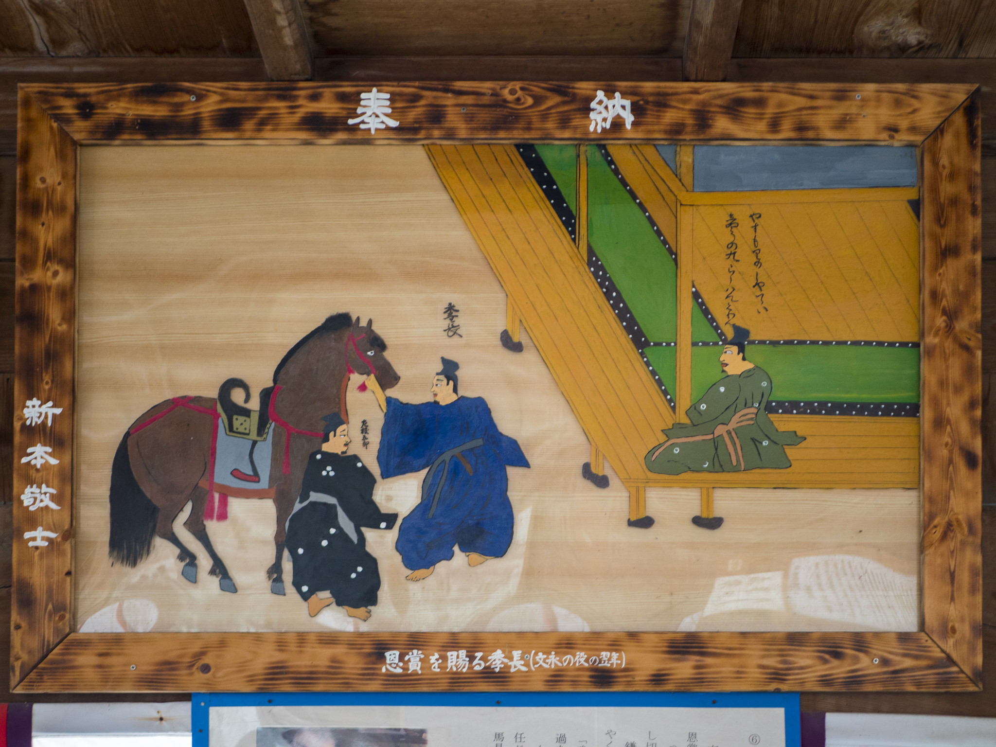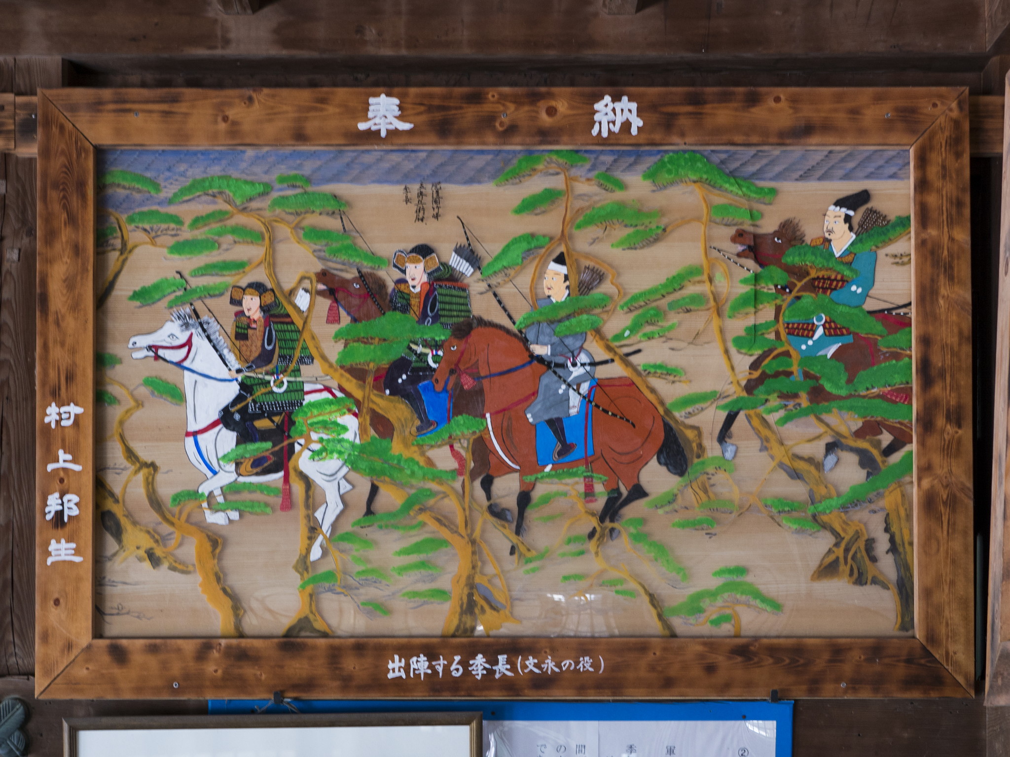 元寇の当時の武士たちの姿や戦い方を知る上で貴重な資料である「蒙古襲来絵詞」は、縦幅約40cm、長さは前・後巻を合わせると約40mにも及びます。その中から重要な場面を10枚選んで、甲佐町在住の有志が拡大模写したものが拝殿に大絵馬として奉納されています。「蒙古襲来絵詞」原本には、損傷や加筆などがありますが、複製された「蒙古襲来絵詞」は甲佐神社に奉納された当時の姿に近づけられています。また境内には、竹崎季長が甲佐大明神のお告げを受けたとされる桜を継ぐものとして、願成桜が2007年に植樹されています。