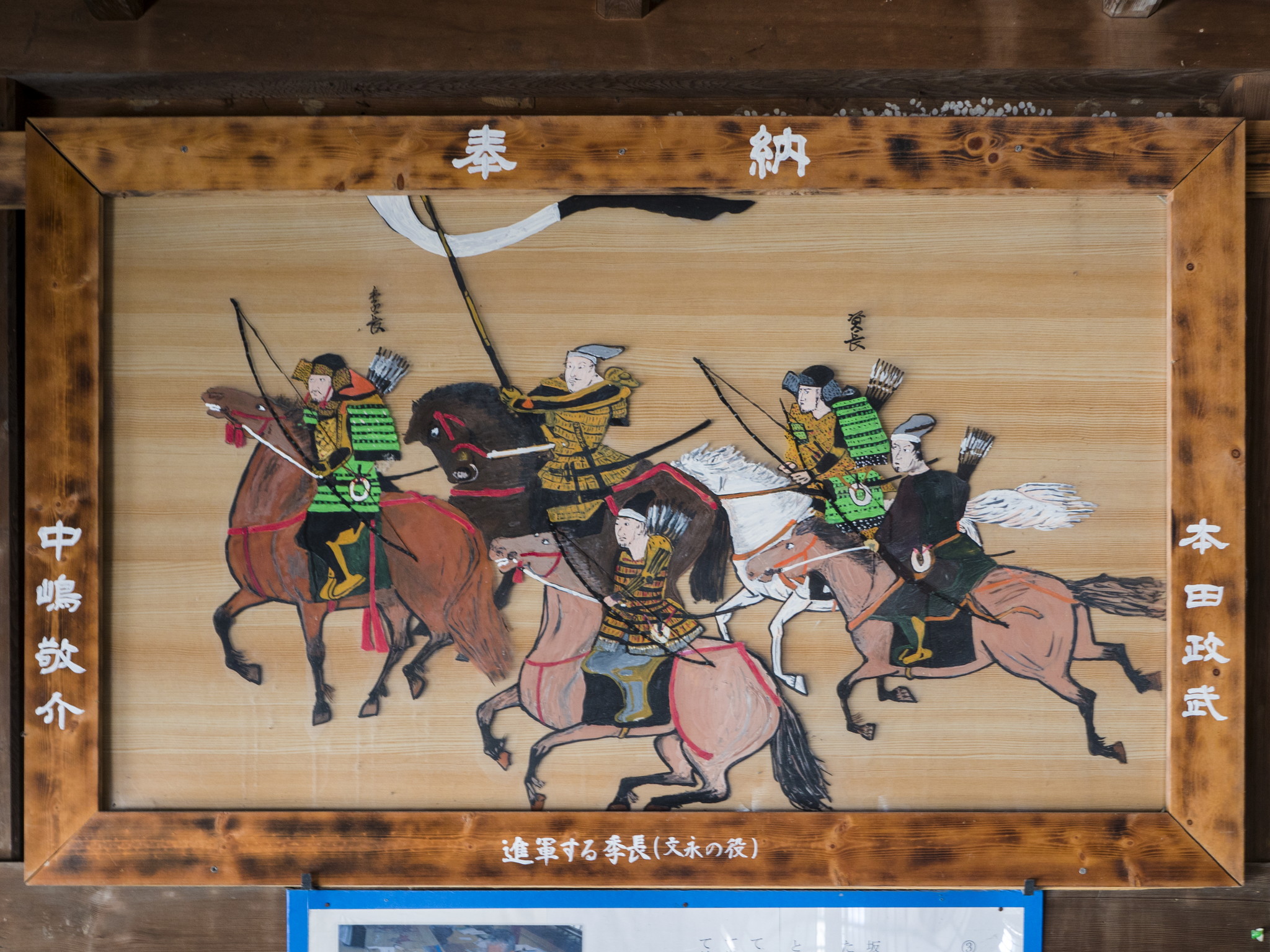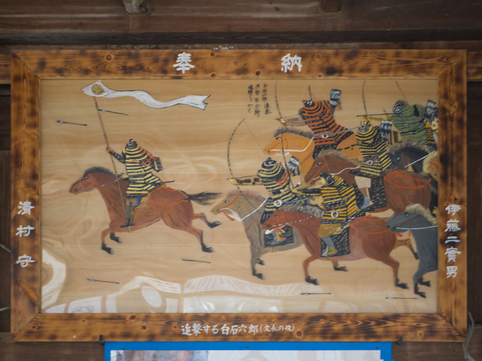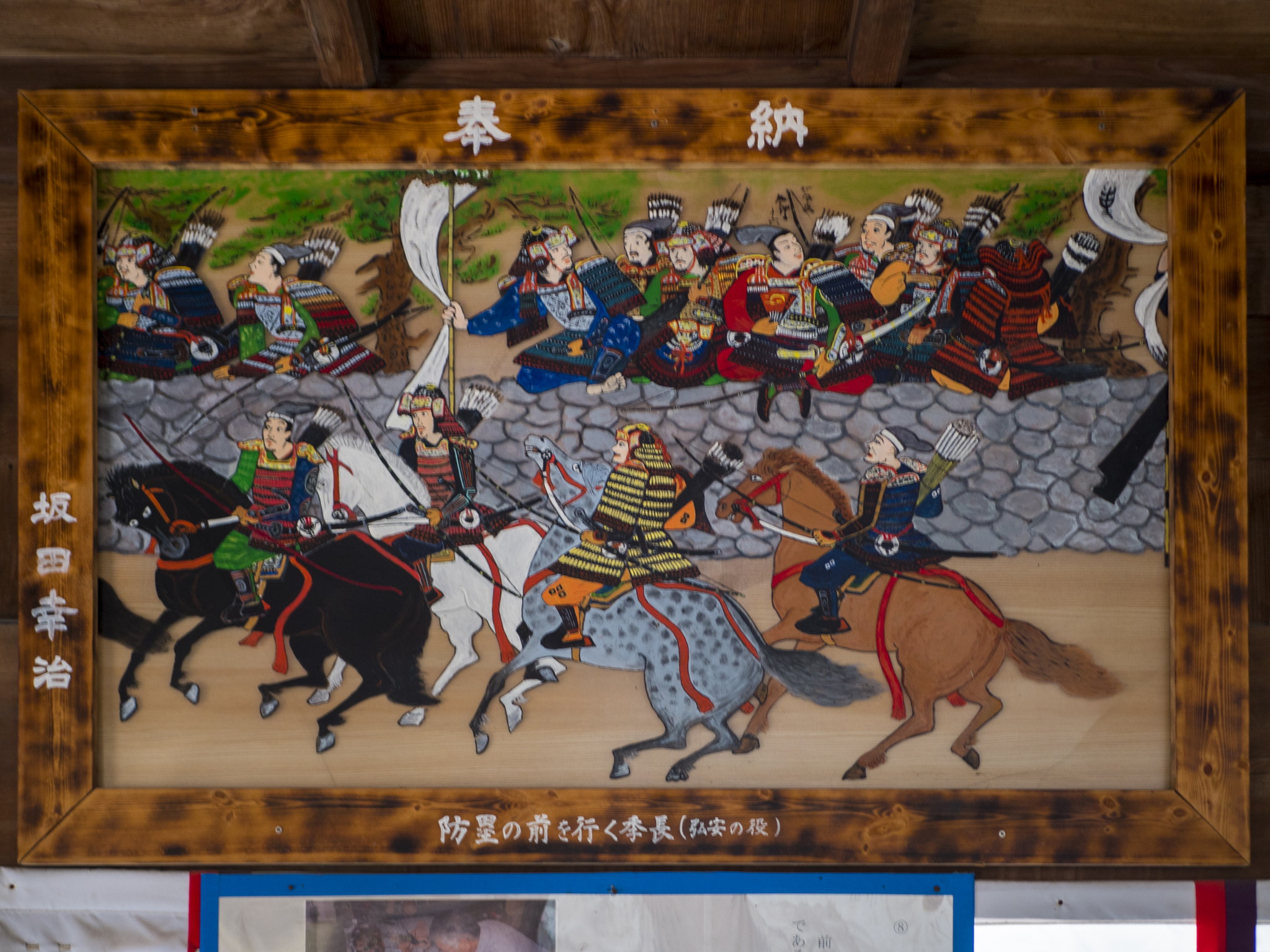 元寇の当時の武士たちの姿や戦い方を知る上で貴重な資料である「蒙古襲来絵詞」は、縦幅約40cm、長さは前・後巻を合わせると約40mにも及びます。その中から重要な場面を10枚選んで、甲佐町在住の有志が拡大模写したものが拝殿に大絵馬として奉納されています。「蒙古襲来絵詞」原本には、損傷や加筆などがありますが、複製された「蒙古襲来絵詞」は甲佐神社に奉納された当時の姿に近づけられています。また境内には、竹崎季長が甲佐大明神のお告げを受けたとされる桜を継ぐものとして、願成桜が2007年に植樹されています。