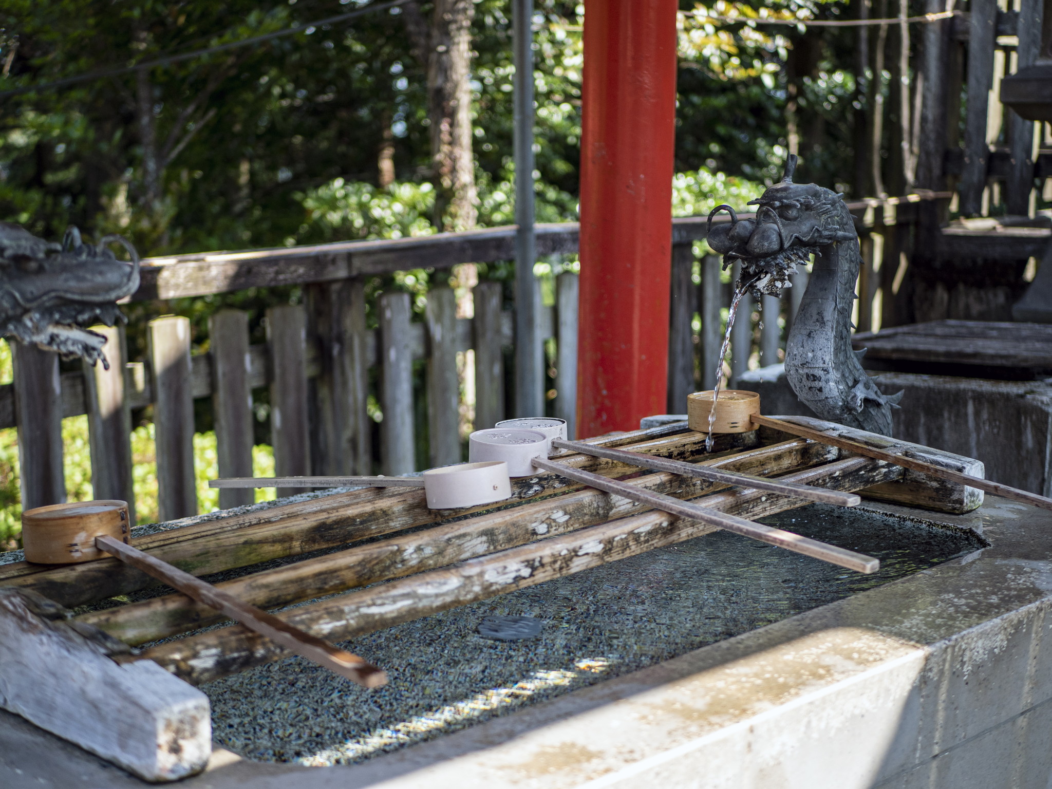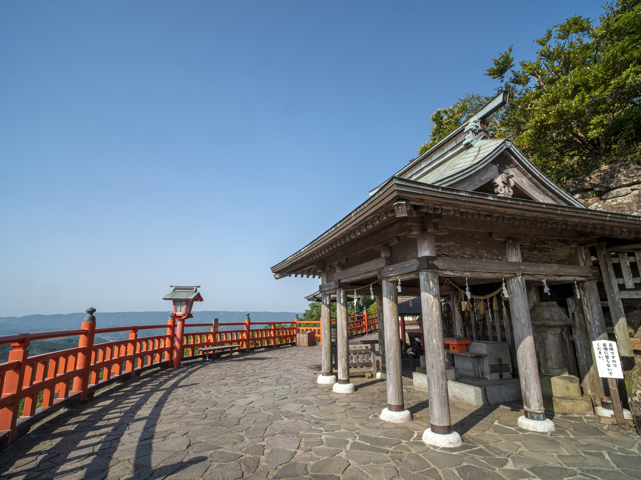 本殿の奥、展望台に鎮座。体長30cmほどの白蛇様が御神殿裏の岩山の中に棲息し、今日でも神縁を得ようと岩の隙間に目をやる参詣者の姿を多く見掛けます。