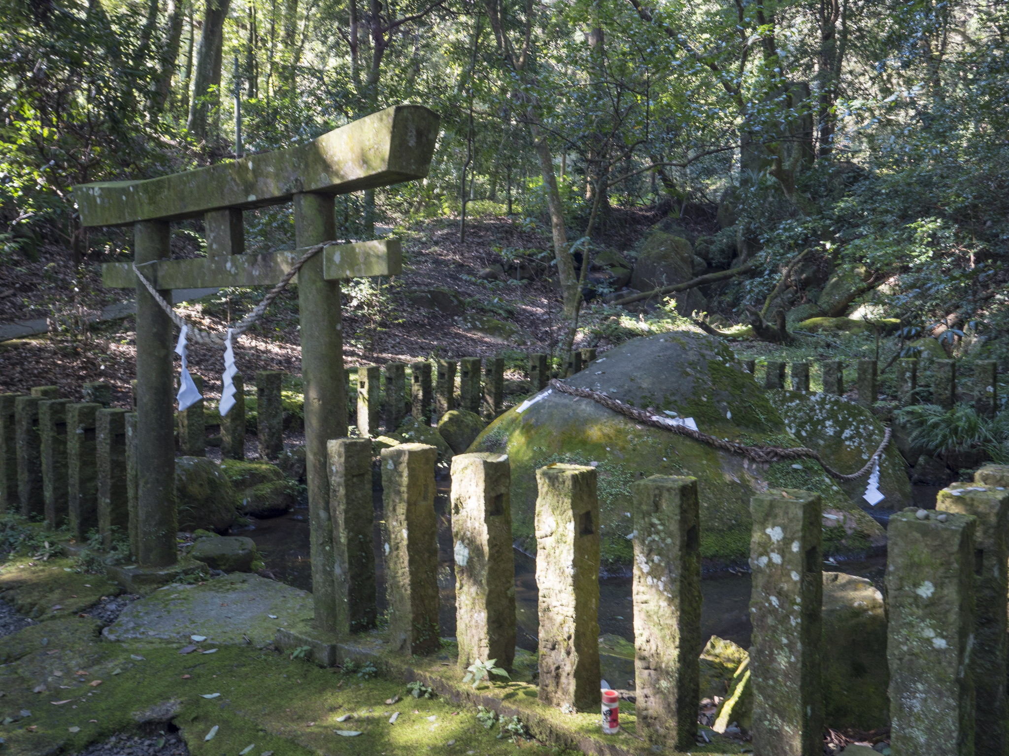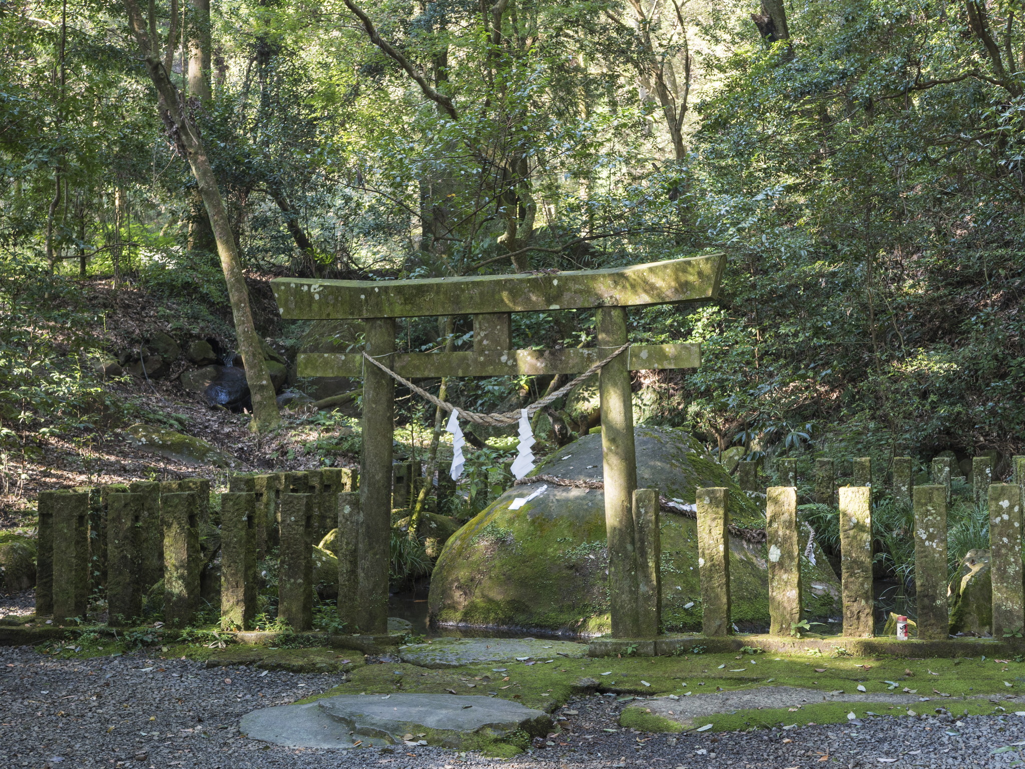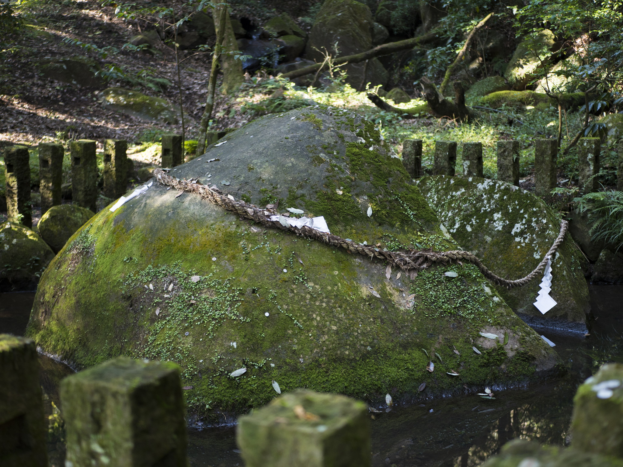 境内の故有谷と呼ばれる谷間には、御祭神の伊弊諾尊が、当神社の神宝であり、厄除け・魔除けの神となり御社殿に鎮め納められている「十握の剣」で三段に切ったとされる「神石」(神裂石・魔石・雷神石・割裂神石)があります。天地が開け、万物が成長し初めた神代の昔。天地創造の神である、伊弊諾尊、伊弉冉尊が誕生されます。夫婦となられた二柱の神様は、國土を産み、神々を生み出します。しかし伊弉冉尊は、火の神の軻遇突智を産んだ際の火傷が原因でこの世を去ります。その愛しい伊弉冉尊を恋い慕う悲しみの涙で凝り固まったのが「神石」(神裂石・魔石・雷神石・割裂神石)で、再びこのような災難に世人が遭わないようにと、深き祈りの心を込めて三段に切ったとされています。