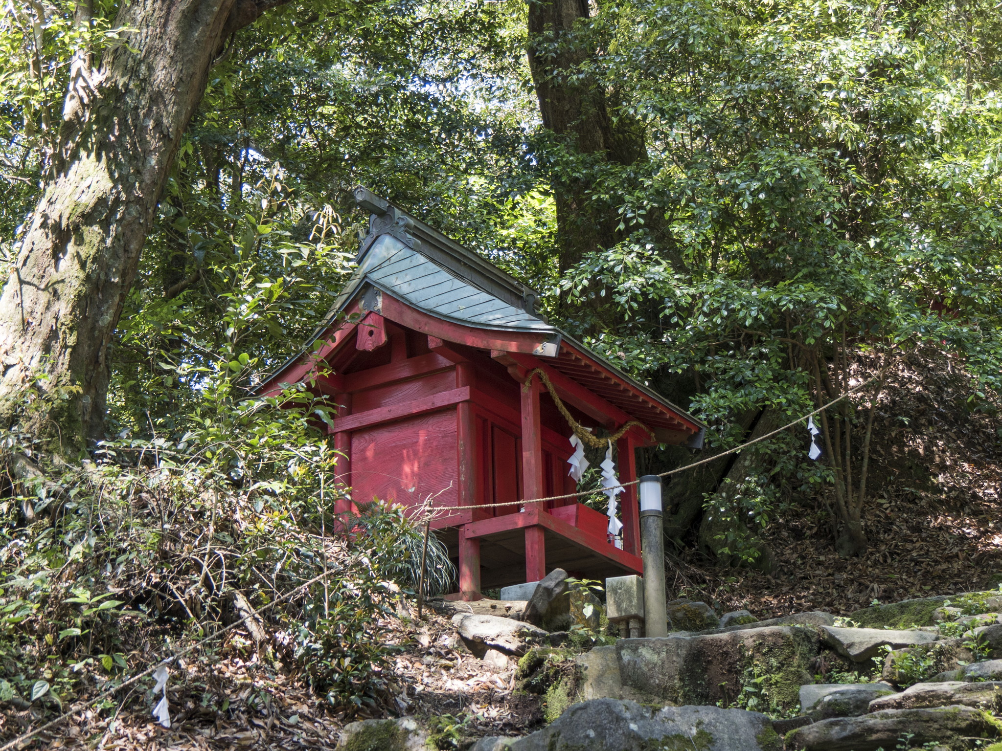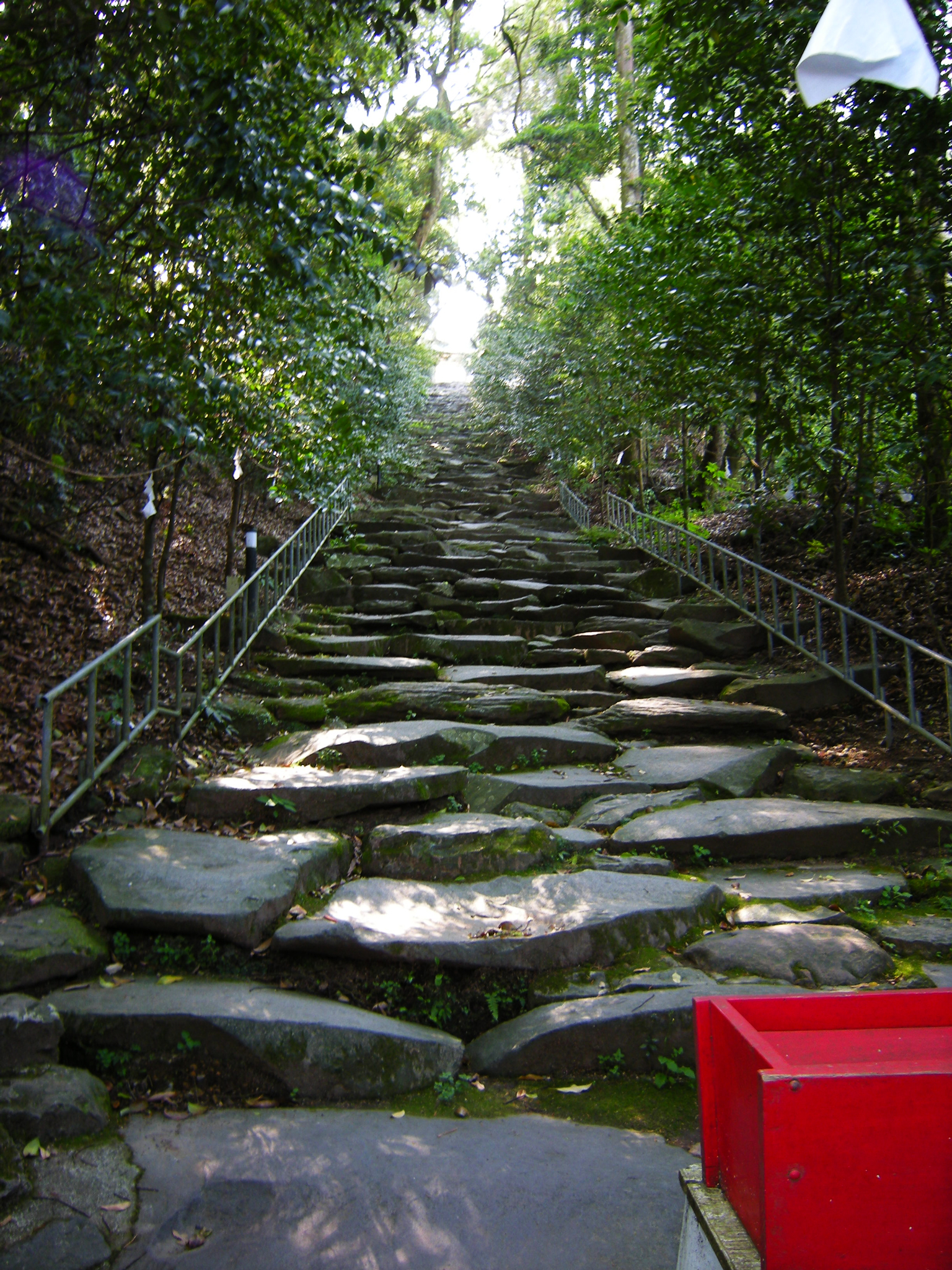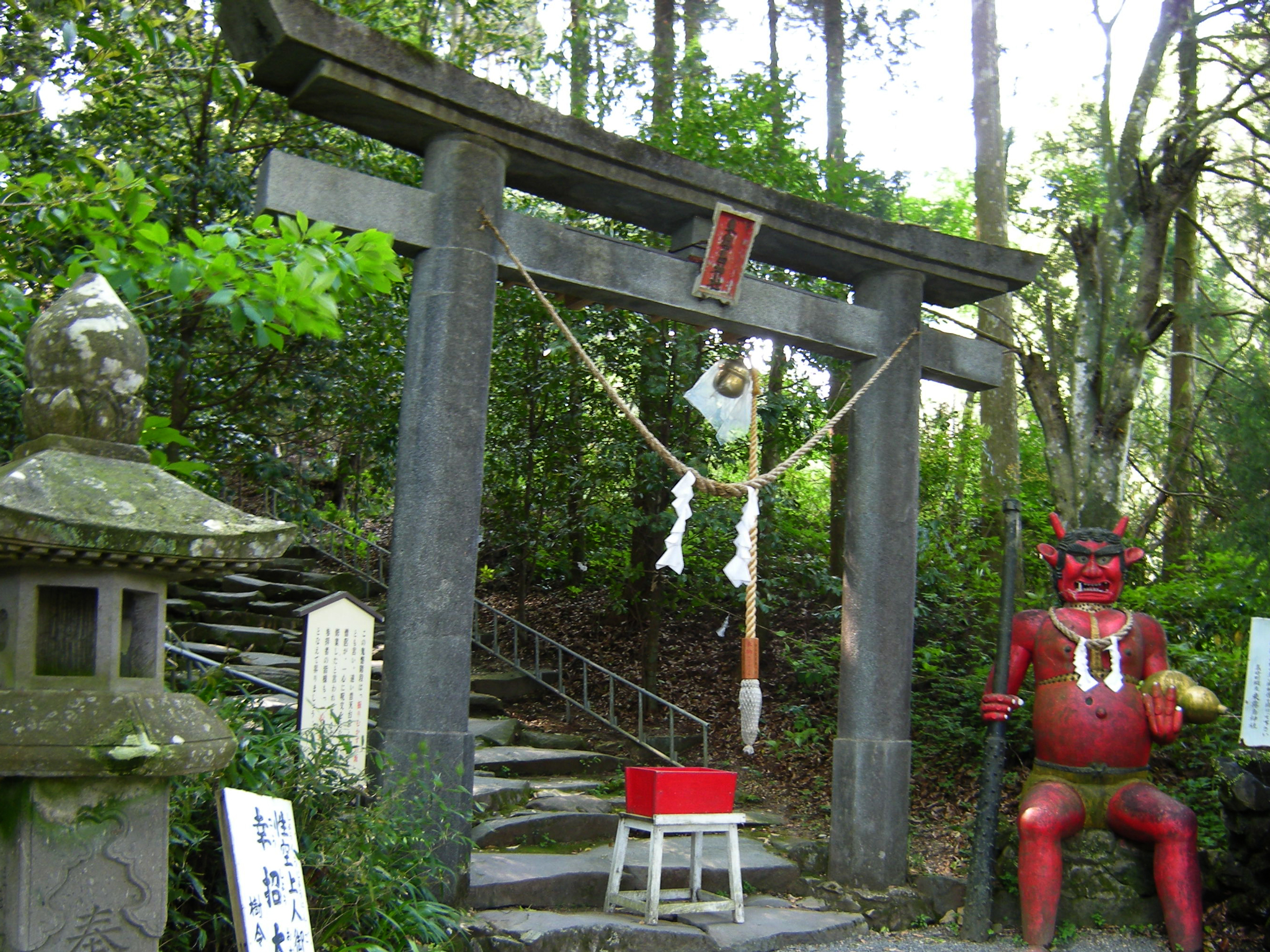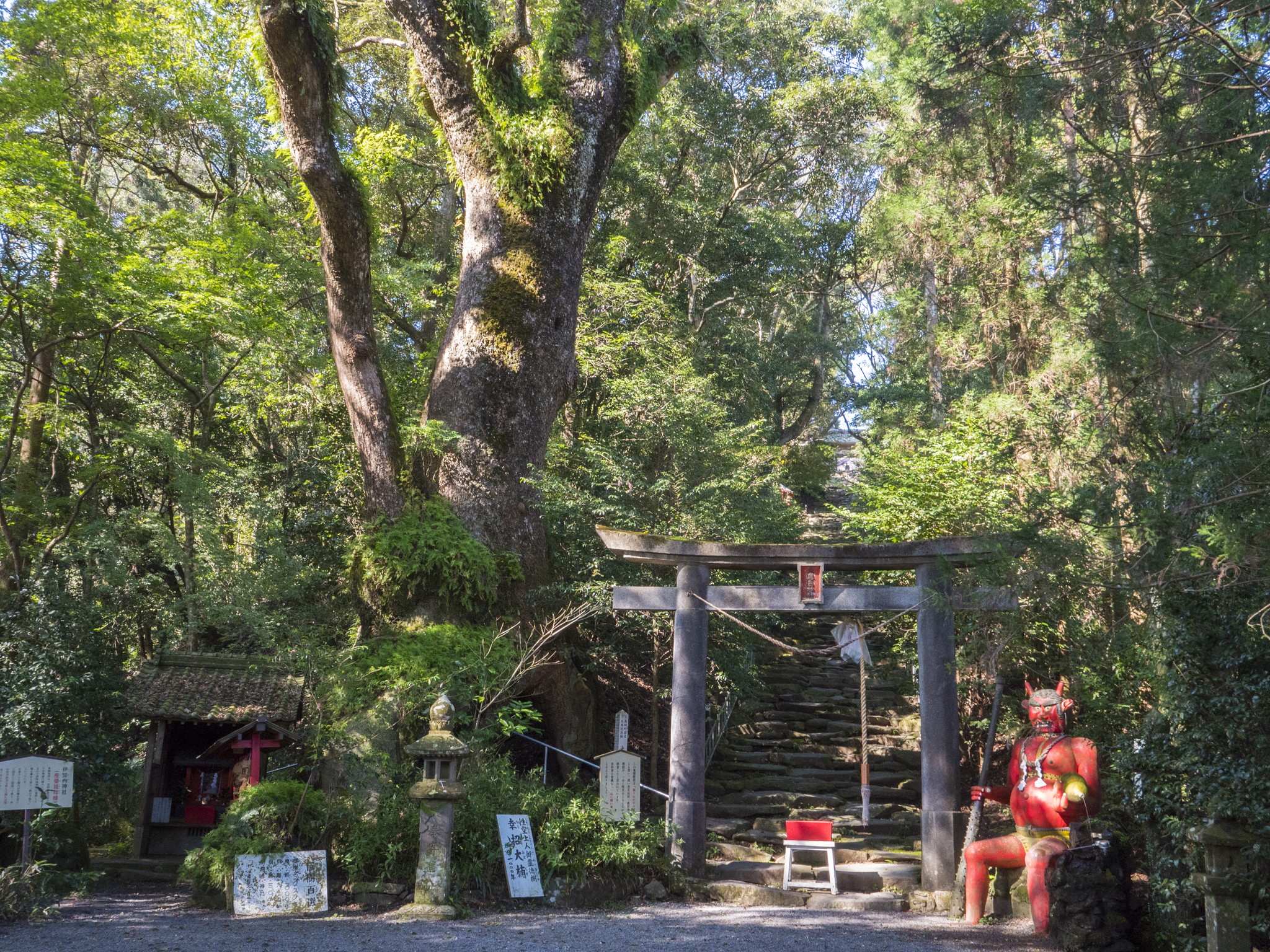 「鬼磐階段」の途上には、下から登って左手に道案内、交通の守護神の猿田彦尊。右手に商売繁盛の守護神の大巳貴尊。そのすぐ上の左手に霧島の大神を祀る霧島六社大権現宮。右手に霧島六社権現の導きの神としての猿田彦尊が祀られています。