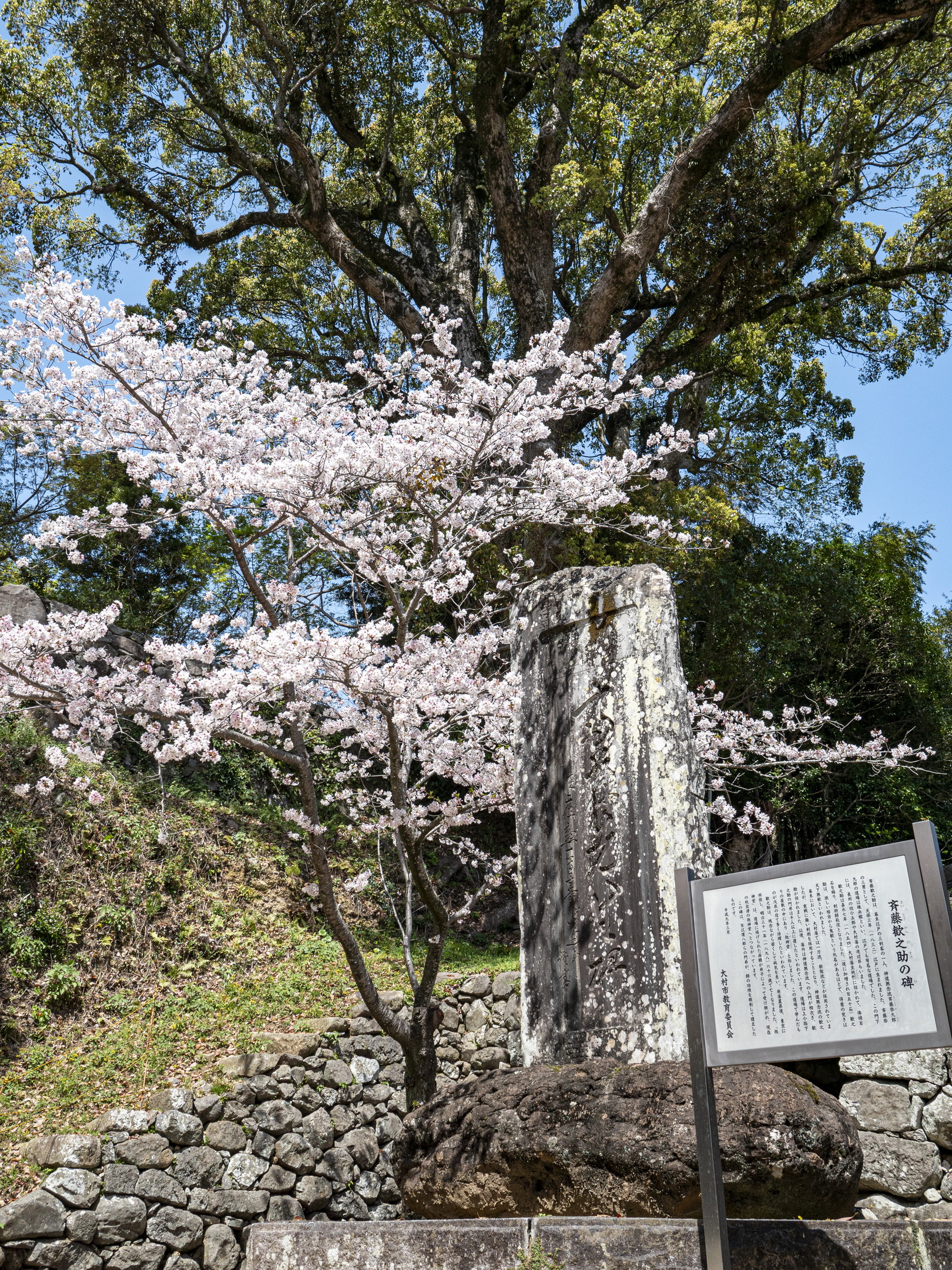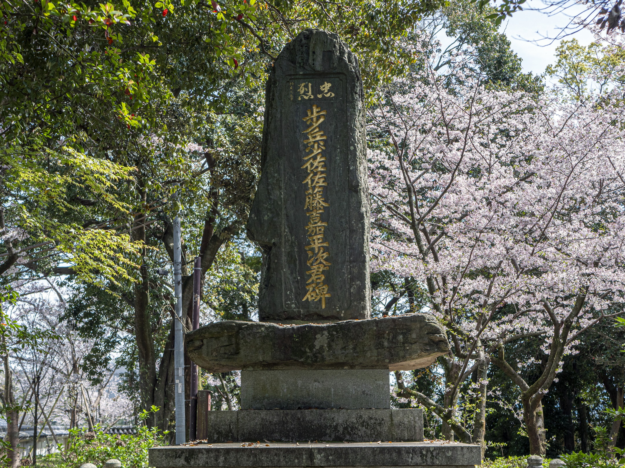 二の丸跡に建つ石碑。第1次世界大戦日独戦争で、歩兵第四十六聯隊(大村)第四中隊長佐藤嘉平次大尉は、大正3年(1914)9月28日未明、青島攻略の命を受け、峻険嵯峨なる浮山の要害攻略を、大村聯隊の名誉を担って自ら決死隊長となり、50数人の隊員の先頭に立ち、月明かりを頼りに肉弾を持って攻めに攻めたが、無念にも敵弾を胸とさらに腹にも受け、男盛りの38歳を一世に浮山の朝霧と消えた人である。