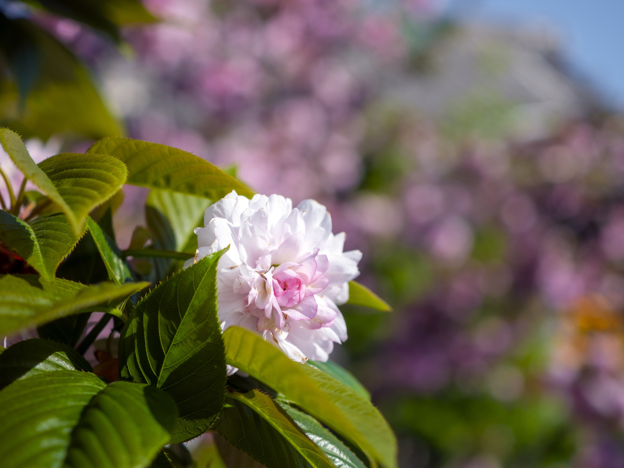 名桜の誉れも高い普賢象のように、花の中心にあるめしべが2枚の葉に変化します。二段咲きになる花は、このめしべの中に小さい不完全な内花が入れ子となってひそんでいます。この内花は、時に非常に不完全で、色々の変化があります。外花のがく片は5枚。花弁は36枚~56枚で平均45枚とオオムラザクラよりやや少な目です。オオムラザクラより少し遅れて直径4.5cmのピンクの花をつけます。