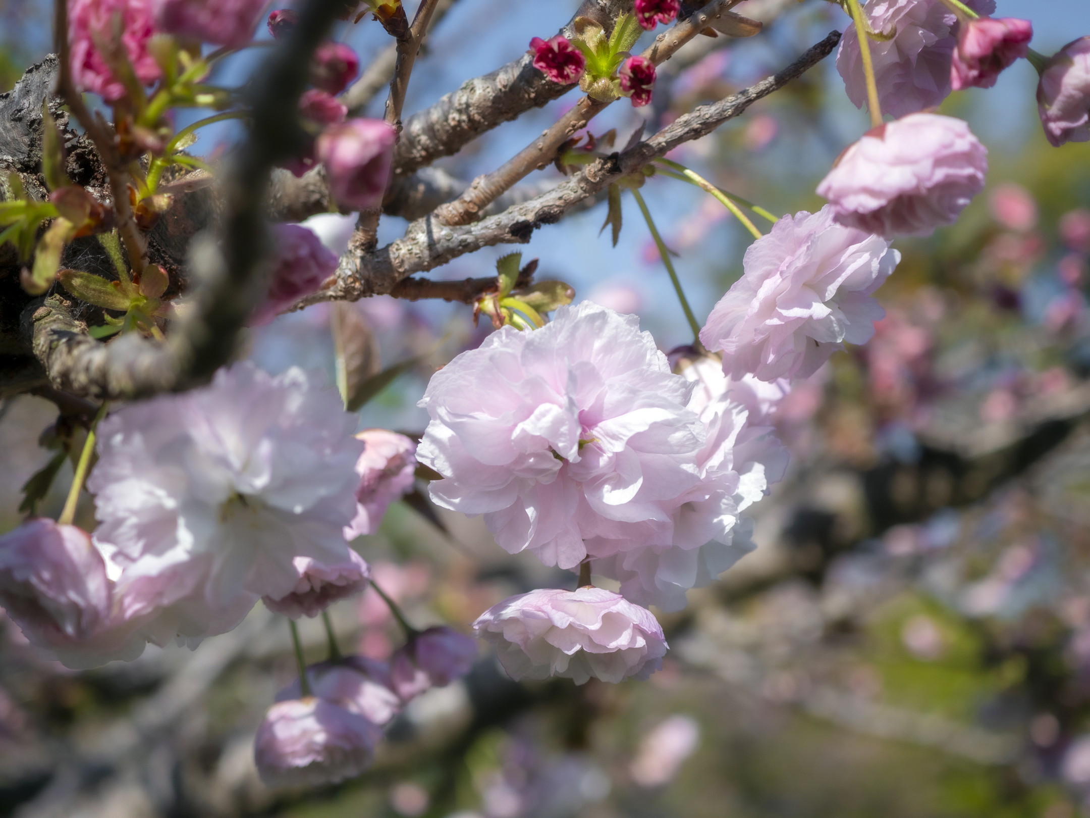 がく片・花弁・おしべが非常に多く、花ごとに著しく変化し、全ての花が八重桜を二つ重ねたような独特の二段咲きという特徴を持っています。下の花を外花、上の花を内花といい、外花のがく片は10枚(桜の基本は5枚)。ひとつの花の花弁の数は、少ないもので60枚、多いものでは200枚にも達し、おしべの数とともに変化に富んでいます。開花は外花から始まり、やがて内花も開き、ソメイヨシノより少し遅れて直径4cmのピンクの花をつけます。学名の品種名はミラビリス(mirabilis)で、奇想天外、霊妙不可思議との意味です。