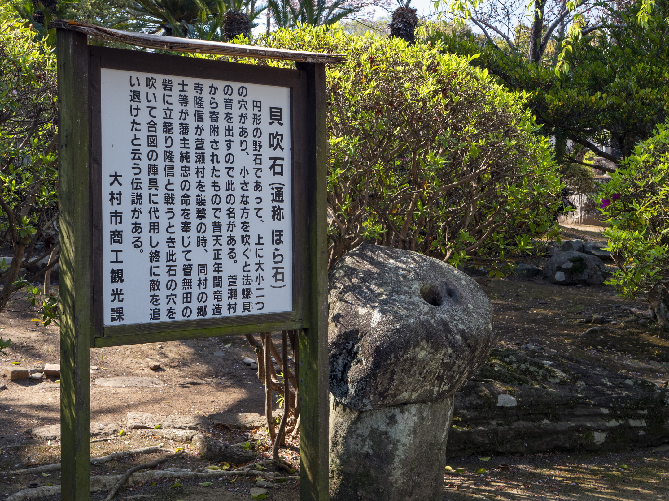 手水舎を過ぎて参道右手にある、萱瀬村から寄附された円形の野石です。上に大小二つの穴があり、小さな方を吹くと法螺貝の音を出すので名称されています。天正5年(1577)龍造寺隆信が、前年に家臣の鍋島氏が大村氏に敗れたことから、8000人の大軍を率いて萱瀬村に攻め入ります。わずか300人ほどの同村の郷士等は、菅無田砦に立籠り、この石の穴を吹いて合図の陣具に代用したと伝承されています。砦の人々は戦死したものの、龍造寺側も大きな被害を受け体勢を立て直しているところ、大村純忠が急襲して終に敵を追い退けました。 ※看板参照