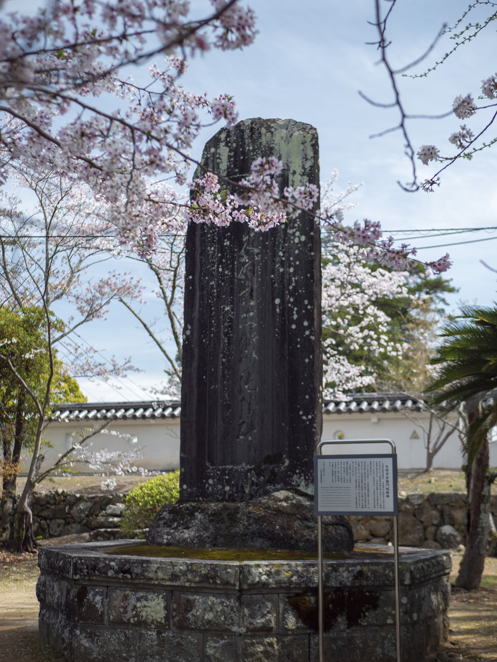 虎口門前の石碑。明治2年(1869)6月わが大村藩「2万7千石」は戊辰戦役の勲功により薩摩、長州、土佐につぎ「3万石」の賞典禄を給せられ、且、優渥なる感状を賜わる。これ偏に明治維新の大業成就のため藩主「純熈公」を中心とし藩論を一定し上下一致、粉骨砕心以って勤王の誠を捧げたる所以なり。この戦役に際し大村藩は京都に到りては禁裏を守護し大津に進む。その後東海道征討軍先鋒として箱根の関を越え江戸に進撃す。江戸に於ては上野彰義隊の討伐に参加する。慶応4年(1868)6月奥羽の賊軍追討の命下るや吾が東征軍総督、土屋善右衛門以下118名は藩地よりの応援隊総司令、大村弥門以下110名を併せ一隊を編成し、薩摩、佐土原と共に進んで会津の強敵を屠り大いに戦功を立つ。又北伐軍「吾往隊」は羽州舟川港に上陸以来、角館、刈和野、神宮寺等に転戦し殊勲を立つ。しかし悲しくもこの戦役に於いて少年鼓手、浜田勤吾を初め戦死22名、戦傷57名の犠牲者を出す。歳月は流れ明治維新の大業より120年余を経す。この秋往時を想い、ここに碑を建て勤王の志篤く名君なりし藩主「大村純熈公」の御遺徳を敬慕し併せて従軍将兵の勲功を称えんとする。