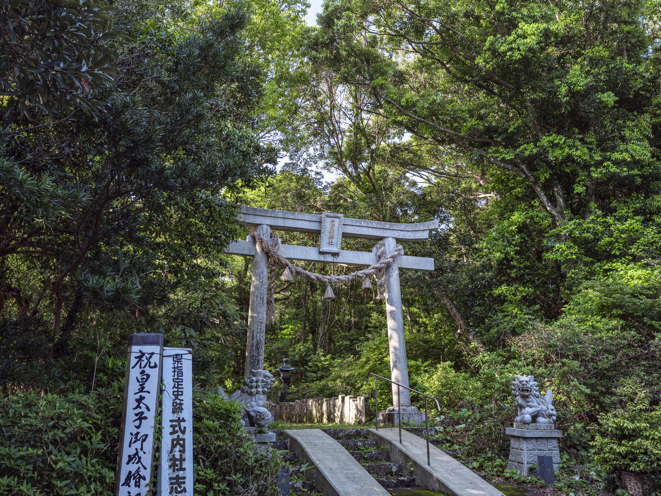 海抜347mの志々伎山山頂には上宮とされる石祠があります。十城別王はこの地で眺望中に流れ矢によって薨去され、その御廟とされています。現在の石祠は宝暦5年(1755)9月25日、円満寺住職の随元が建立したとの記銘があり、晴れた日は山頂からの眺望は誠に雄大で、五島列島はおろか壱岐・対馬まで眺められます。海上監視にはまたとない絶好の地で、十城別王が異国警備の要衝として、この地を選ばれた真意が頷けます。戦前は女人禁制の地とされ、男子も「草履脱ぎ場」の標柱からは、裸足で登る風習がありました[03]。