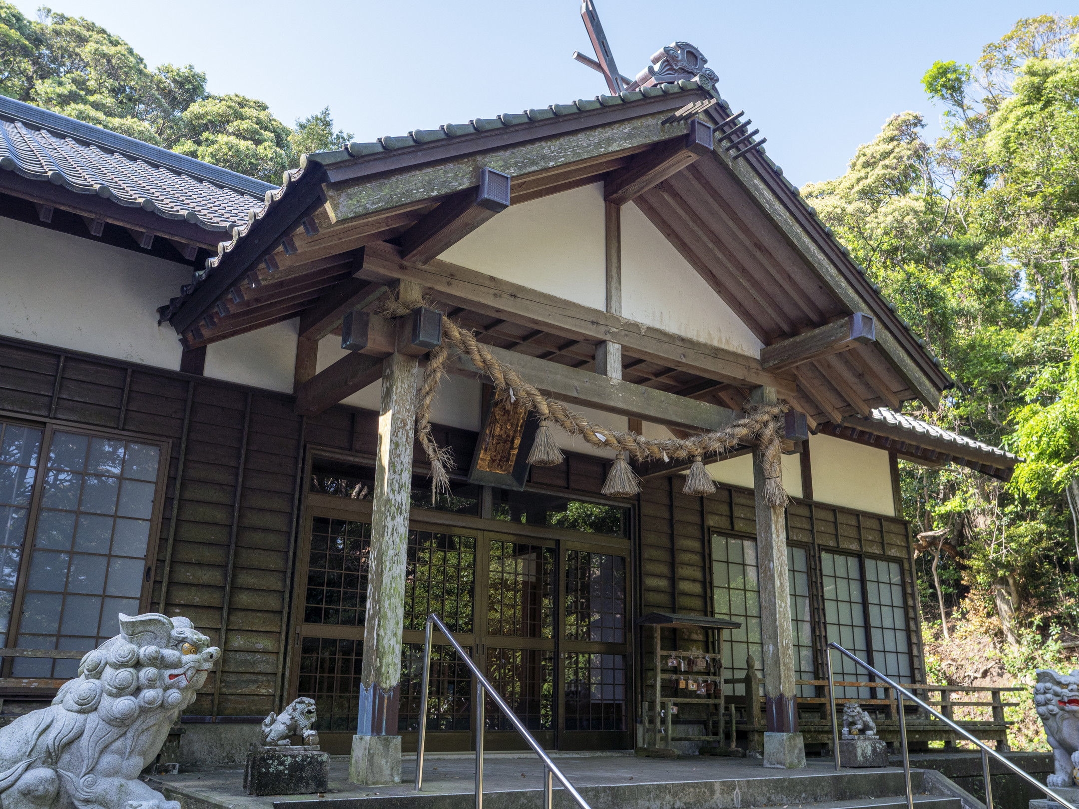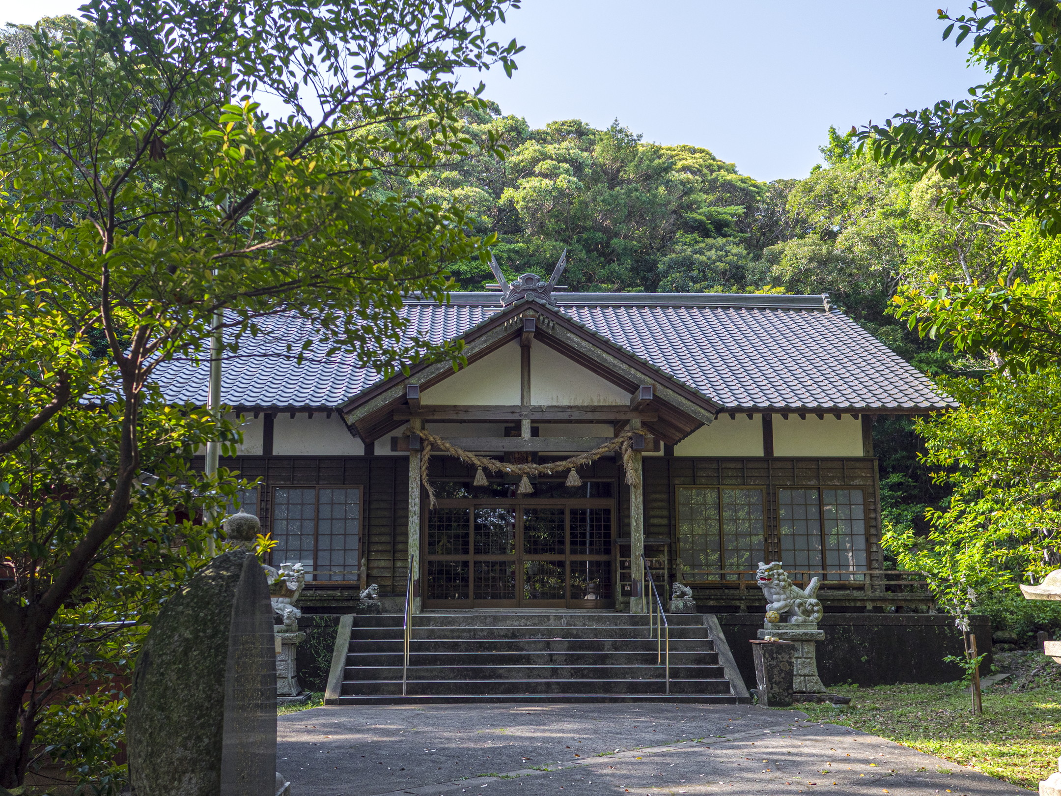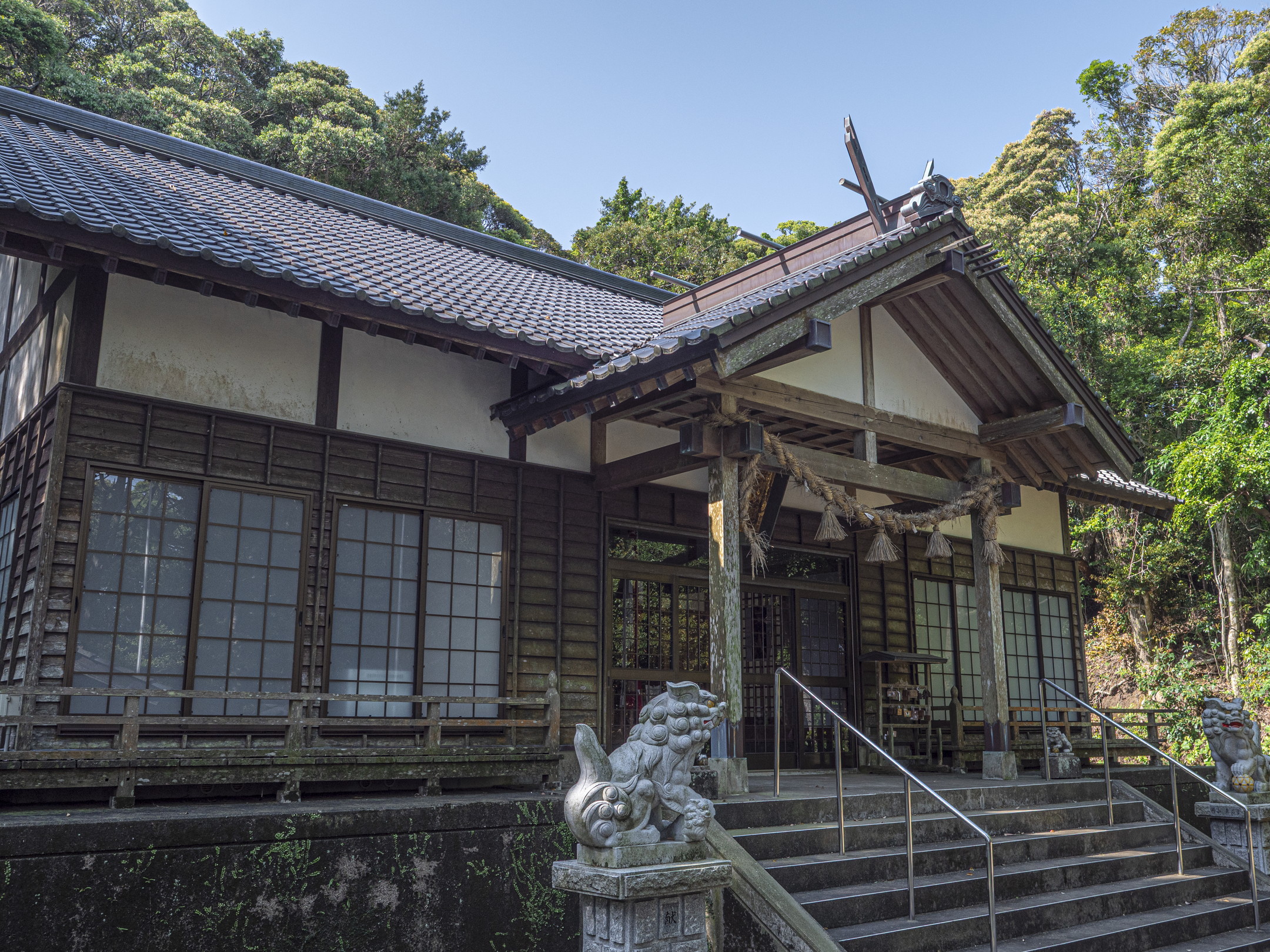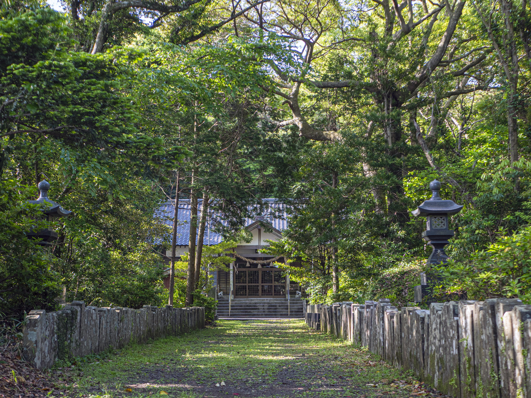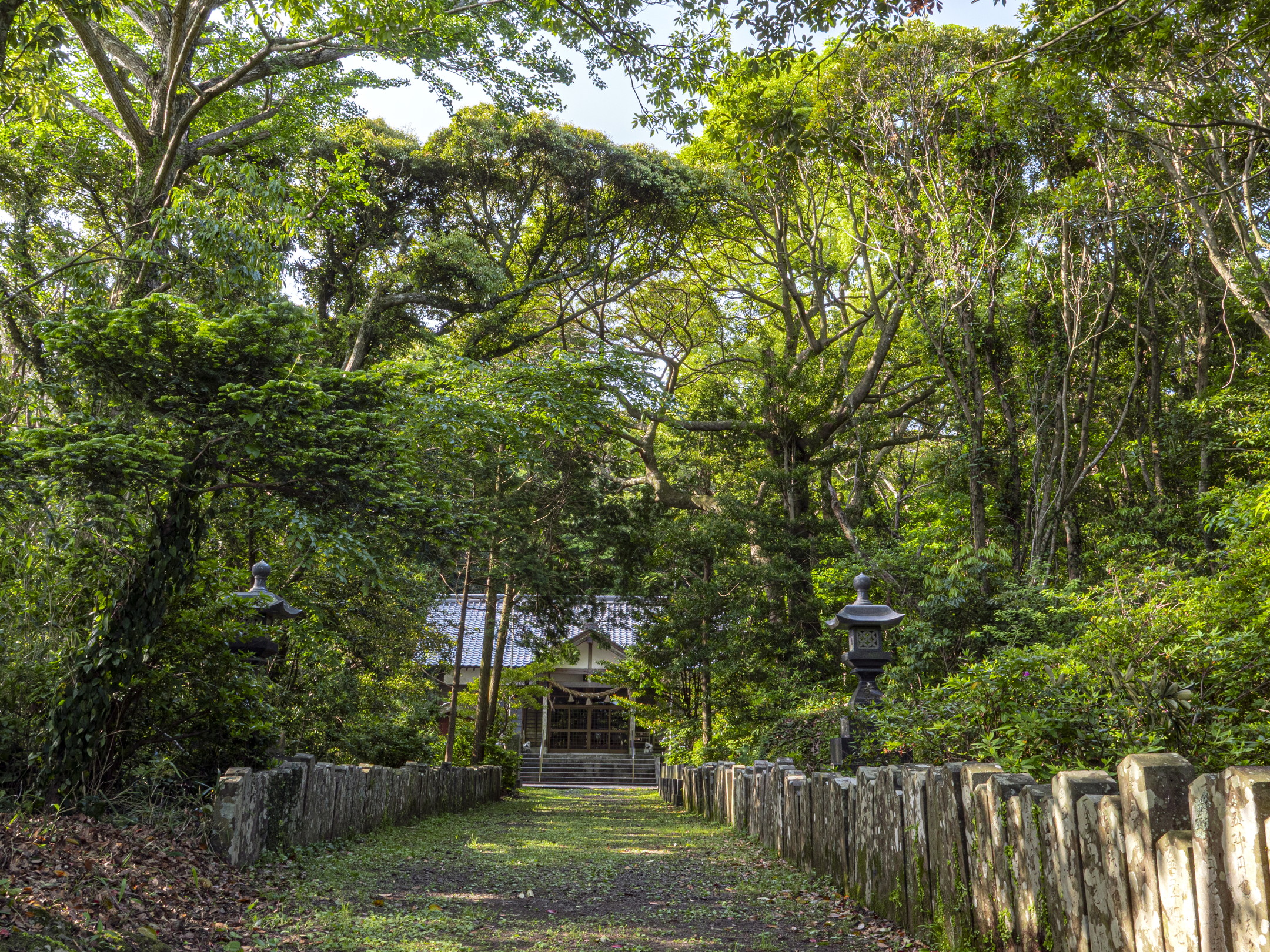 志々伎山の中腹に鎮座。別当寺としての神光寺、円満寺の跡地で元は寺屋敷と呼ばれていました。昭和36年(1961)社地を移し、新築されました。泉水の跡と思われるものが社殿の側に残っています。約200m登った左側には、石垣で囲んだ40坪ほどの敷地があり、古材が放置され、十数基の石燈籠が残っています。永禄2年(1559)から昭和36年(1961)社地を移転するまで神社祭祀の中心地であった中宮の跡地です[01]。『神社旧記』の写本『注進並進上』に書かれた弘安7年(1284)11月18日の差出が、「奇師安倍人包、中宮之師澄温、下宮之師海、重、祝申海窓綱、大宮司源宗秀」となっていることから、少くとも13世紀には、上宮・中宮・下宮・沖ノ宮の組織ができ、中宮が別当寺を中心とする施設になっていおり、大宮司職も置かれていたと推察されています[02]。