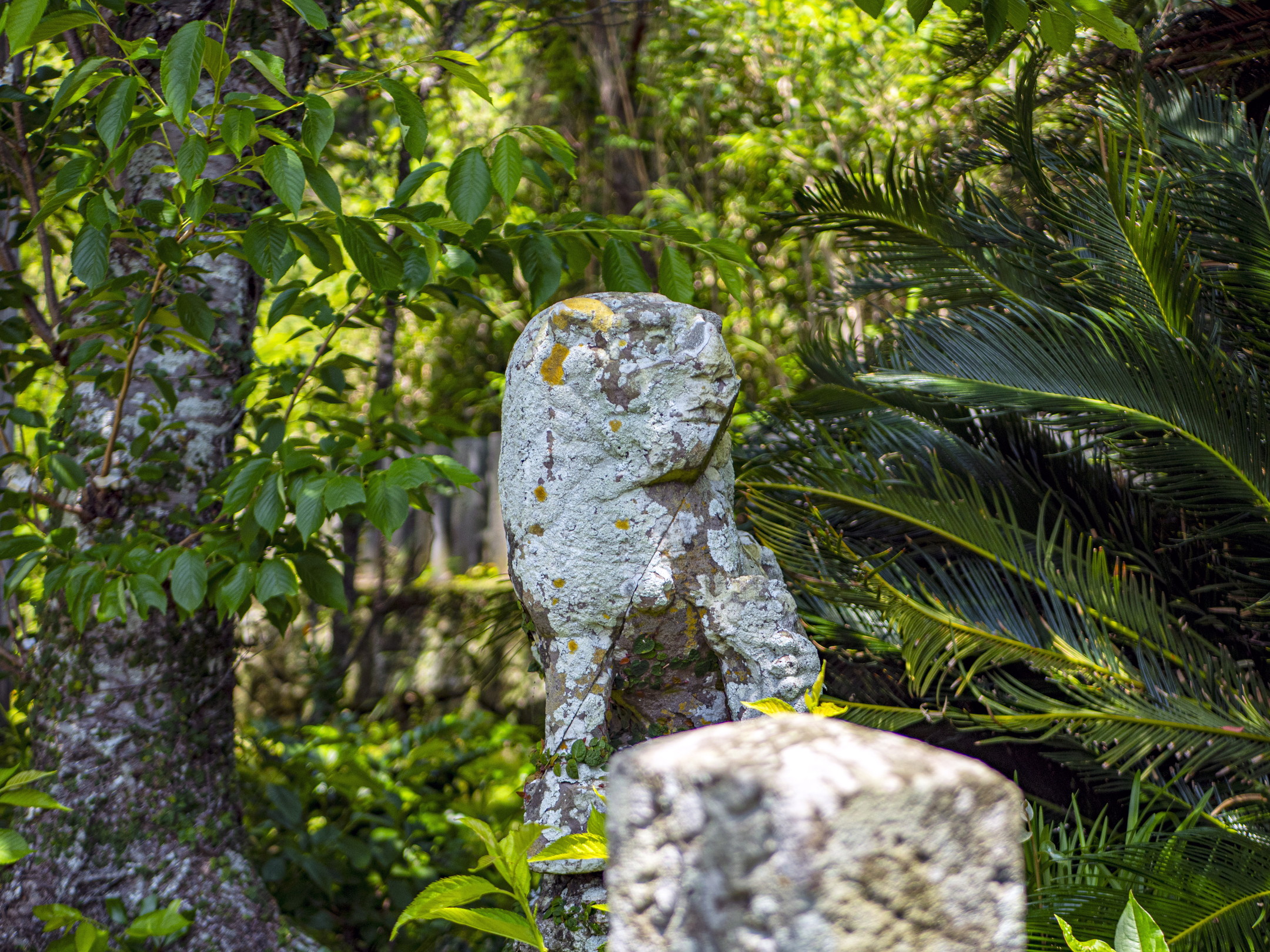 社殿向かって左手には、薩摩塔、右手前に宋風獅子があります。共に浙江省産石材によるもので、13世紀前半に中国(南宋)で作られて平戸にもたらされたものと考えられています。当時の大陸と平戸の交流を示す貴重な文化財として、平成30年(2018)5月2日に平戸市指定有形文化財に指定されました。薩摩塔は、最大高200cm、最大幅140cm。宋風獅子は、最大高110cm、最大幅50cm。薩摩塔は鹿児島県、福岡県、佐賀県、長崎県でしか確認されない特異な石造物です。沖ノ宮の薩摩塔は、六角を基調とする六角基調型で、屋根(笠)・仏龕・須弥壇(須弥座)を一石で造る一石造り型。仏龕の中を刳り抜き本尊の仏像を別造りとする本尊別造り型です。蓮弁意匠を持つ点などが中国浙江省麗水市の霊鷲寺石塔(南宋期)等と共通しています[03]。