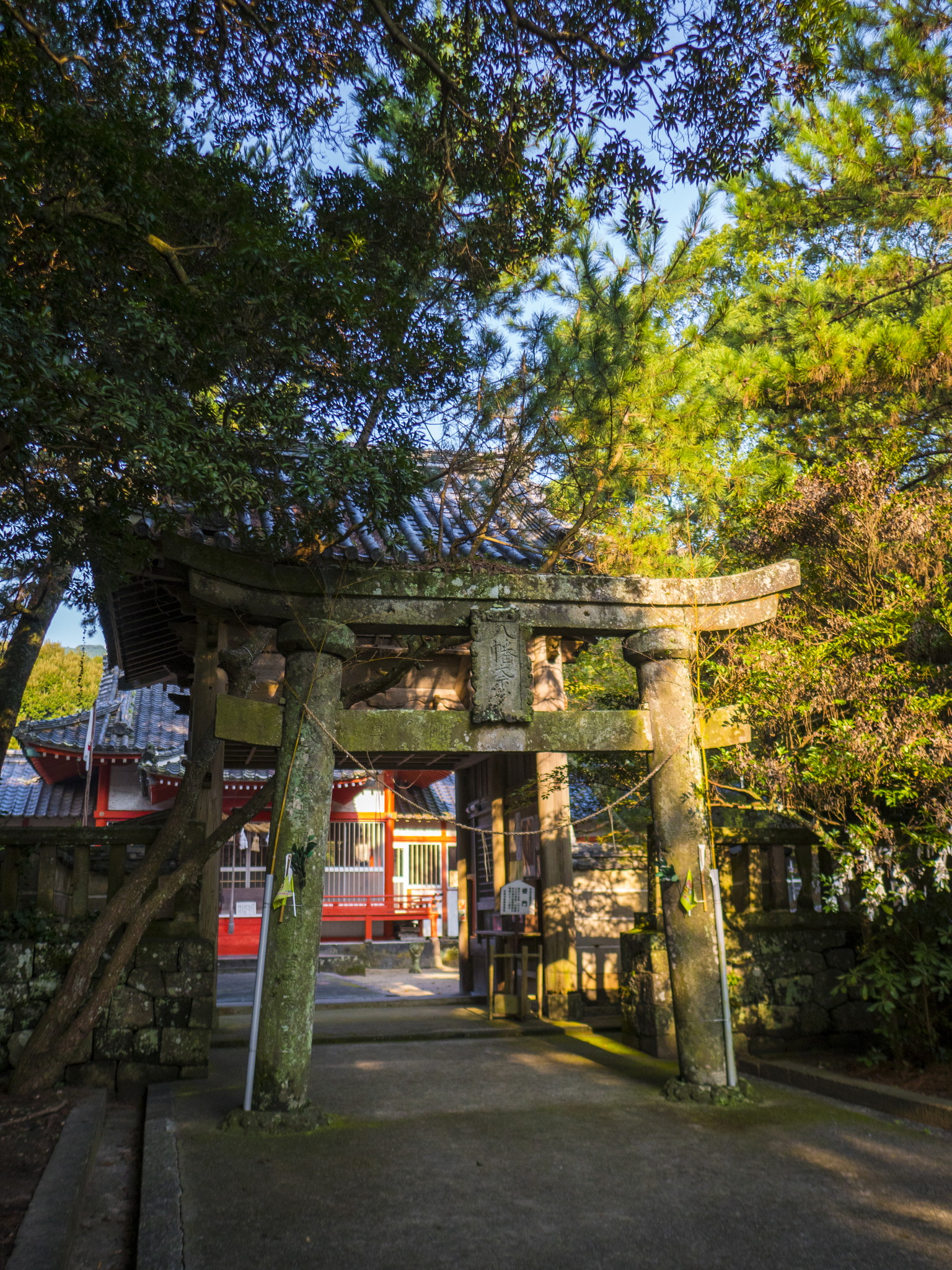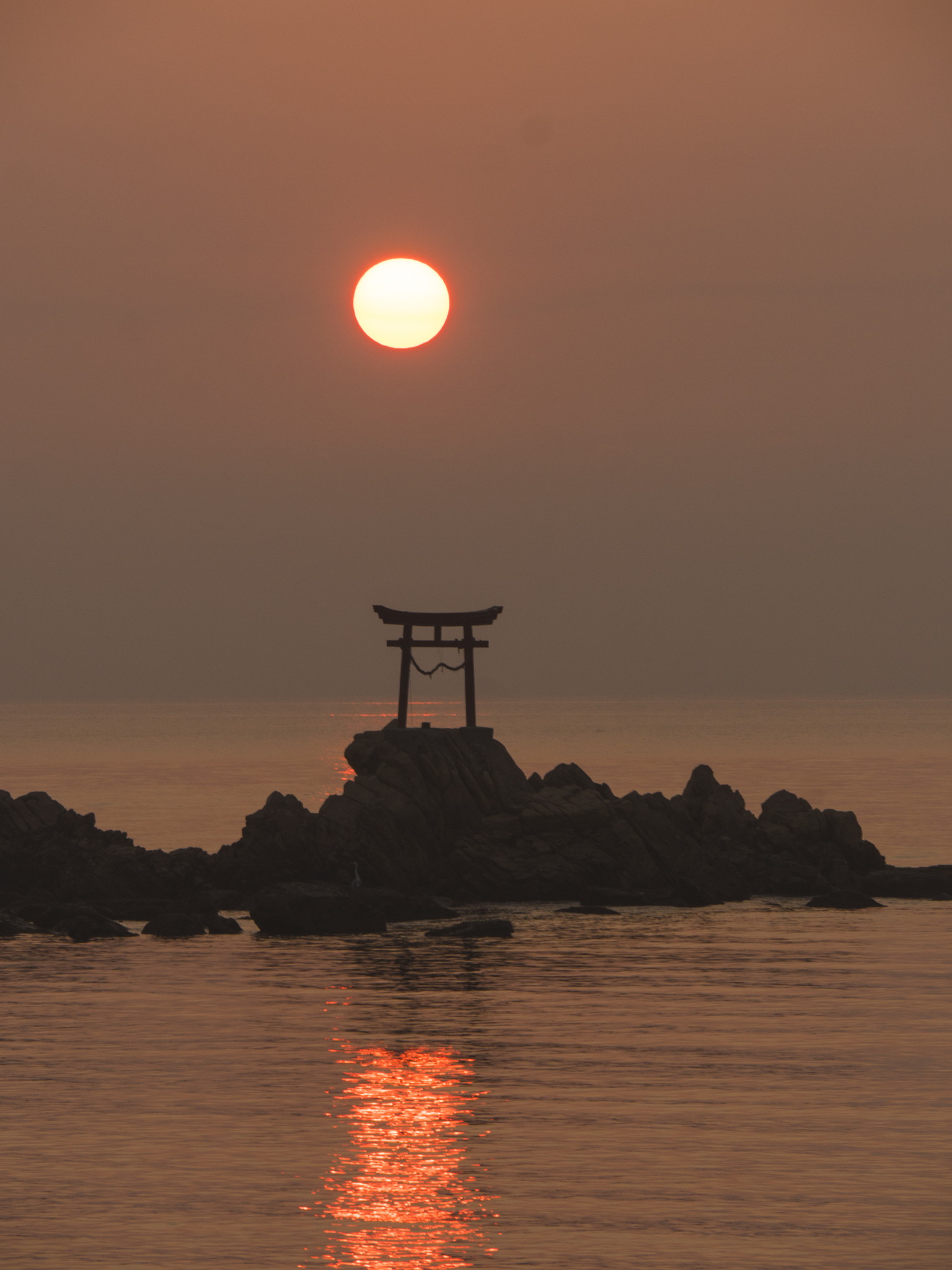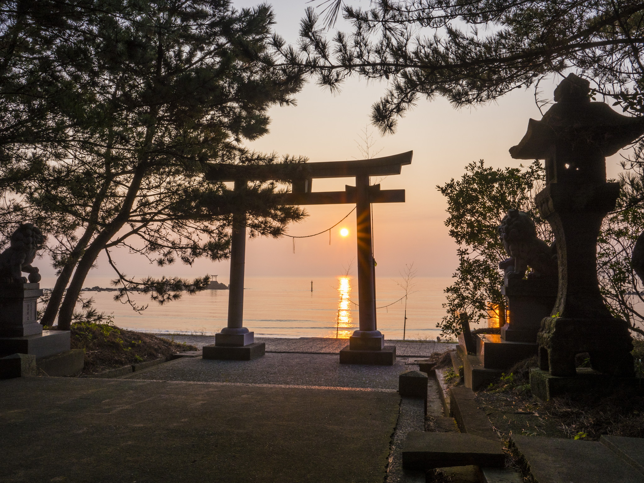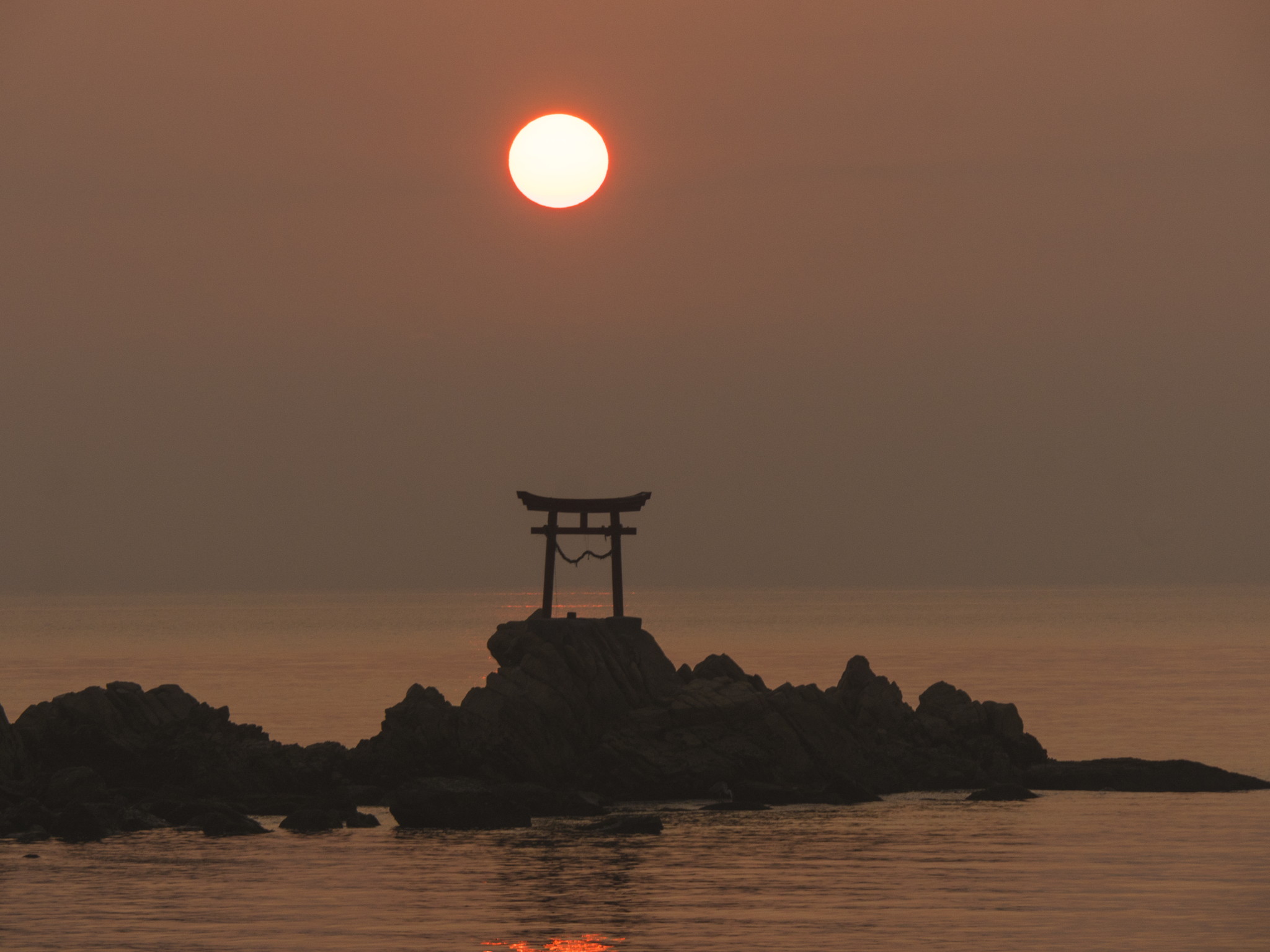 奈多海岸の沖合約300mには、元宮とされる市杵島の岩礁の上に小鳥居が建てられており、古くから比売大神を祀り、守護神として尊崇してきたとされています。比売大神は、素戔鳴尊と天照大神の誓約により素戔鳴尊から生まれた瀛津嶋姫命(市杵嶋姫命)、湍津姫命、田霧姫命の三女神とされ、その降臨した宇佐嶋が市杵島とされています。