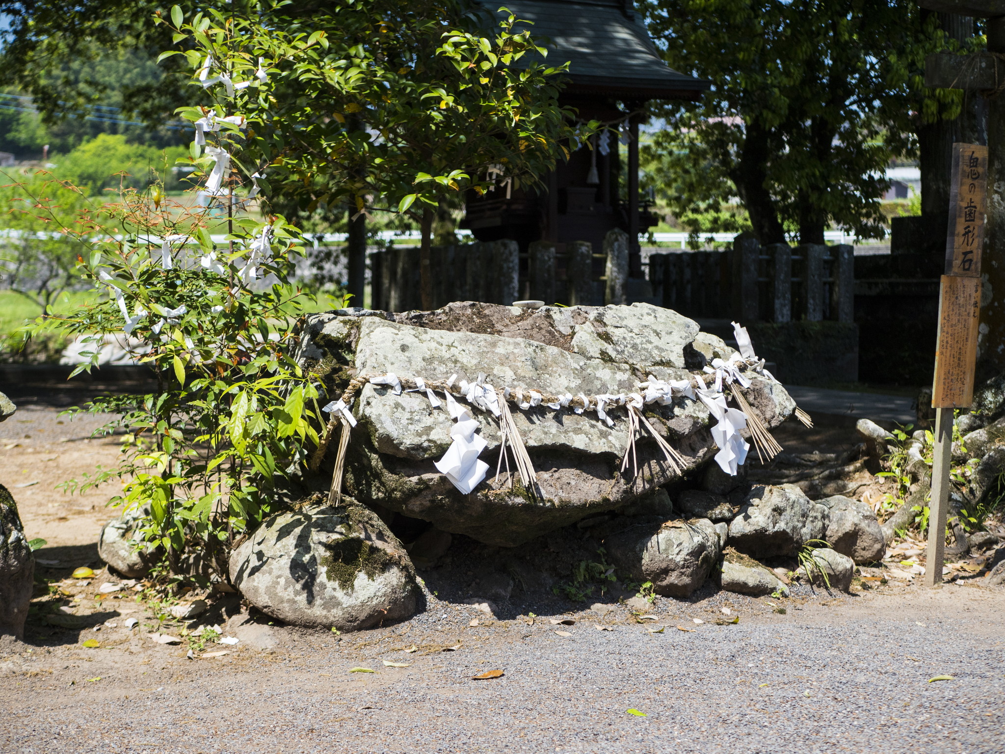 合併社の前に祀られています。本宮山の北西、西寒多神社の南西の霊山には、恐しい鬼が住み、麓の人々に悪さばかりしていました。ある時、天照大御神を祀る巫女の親子が本宮山にやって来て、毎日お祭りをするようになります。そのお祭りの音を不快に感じた鬼たちは、巫女の親子を取って喰おうとします。その際、巫女の母親は霊山と本宮山まで一晩で橋を架けられたら、食べられましょうと約束します。ならばと必死になった鬼は約束通り一晩で橋のほとんどをつくってしまいました。これに慌てた巫女の親子は、朝が来たかのように長鳴き鶏の鳴き声を真似ると、夜明けと間違えた鬼どもは、悔しがって歯で石を噛み、投げつけ退散したとされています。そして鬼たちは霊山から居なくなってしまいました。この歯形石は、その時の石とされています。最初は池に投げられましたが、流行り病が発生したので、当地に祀られるようになりました。