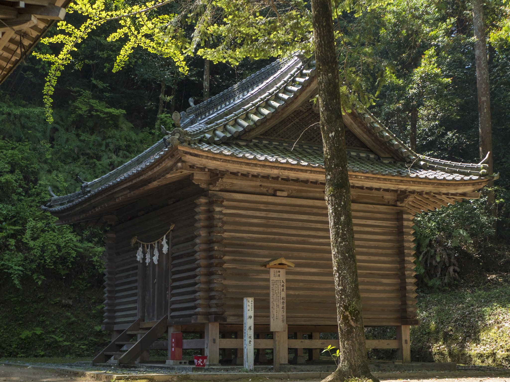 本殿の西に位置する校倉造りを特徴とした入母屋造り桟瓦葺き、高床式の建物です。応永15年(1408)の造営。校木を井桁に組み合わせた井篭組みという形式の校倉造りで、県下ではあまり例がありません。明治19年(1886)6月に改修。桁行5.7m、梁間4.8m、高床0.98mです。昭和49年(1974)1月9日に市指定有形文化財に指定されました。