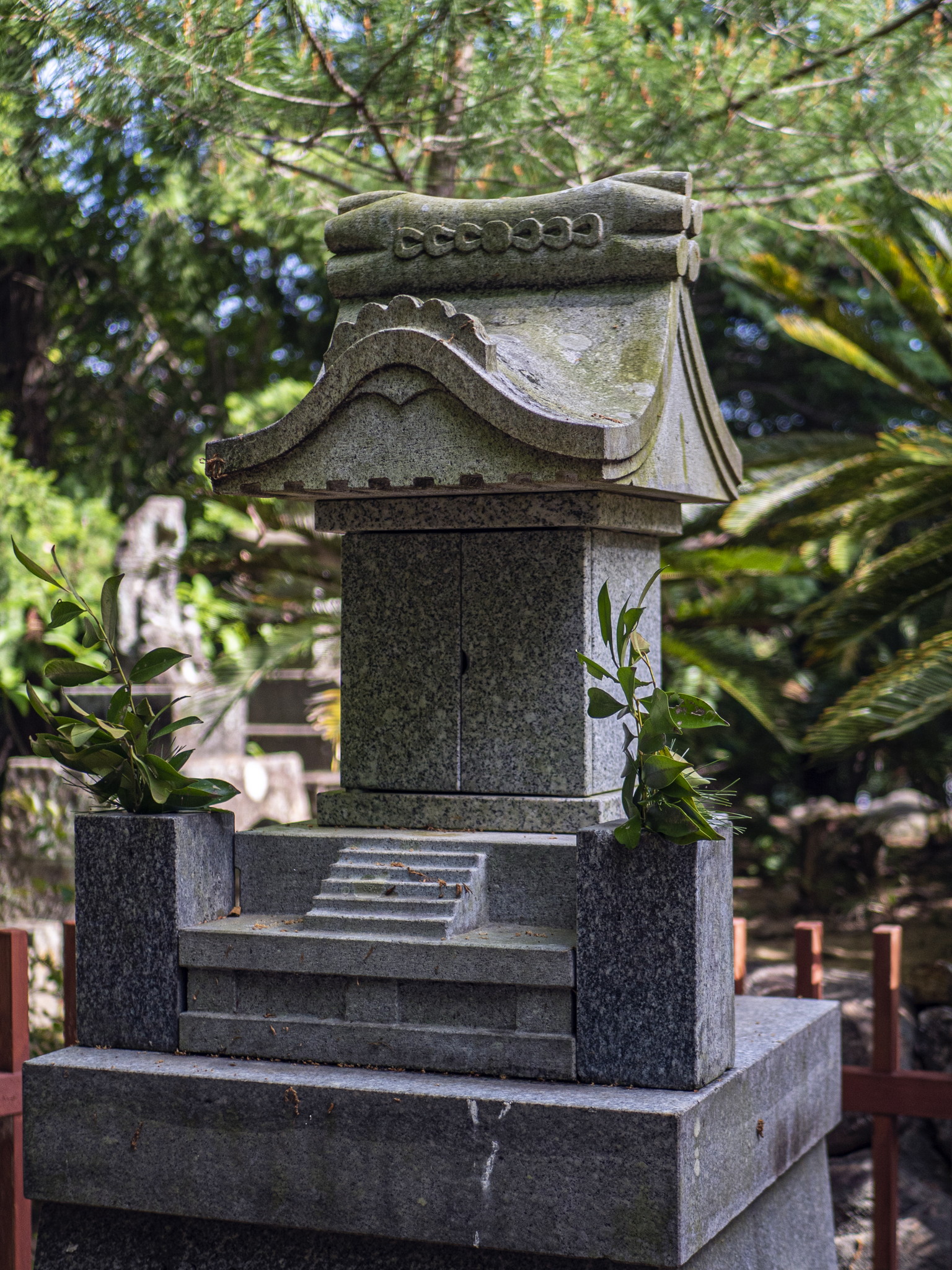 田道間守は、但馬国出石郡神美村三宅を生誕地とし、その地に鎮座する中嶋神社の御祭神として祀られています。昭和29年(1954)7月、太宰府天満宮の摂社・中嶋神社の九州分社遷座祭に出席した佐賀県菓子組合伊万里支部長の宗佐八氏が、香橘神社は日本最初の非時香菓(橘)の渡来地であるとして奉賛会を結成。昭和31年(1956)11月13日に総本社の中嶋神社から中嶋神社佐賀県分社として田道間守命の神霊を勧請し、創建されました。花崗岩で巡らせた玉垣には森永製菓、江崎グリコをはじめ県内外の製菓業者の芳名が刻まれ、但馬の総本社である中嶋神社、垂仁天皇陵陪塚田道間守命墓所、和歌山の橘本神社、太宰府天満宮の摂社・中嶋神社と共に、田道間守命の五大聖地のひとつとされています。田道間守命の命日である4月19日には伊万里菓子組合により献菓祭が斎行されています。