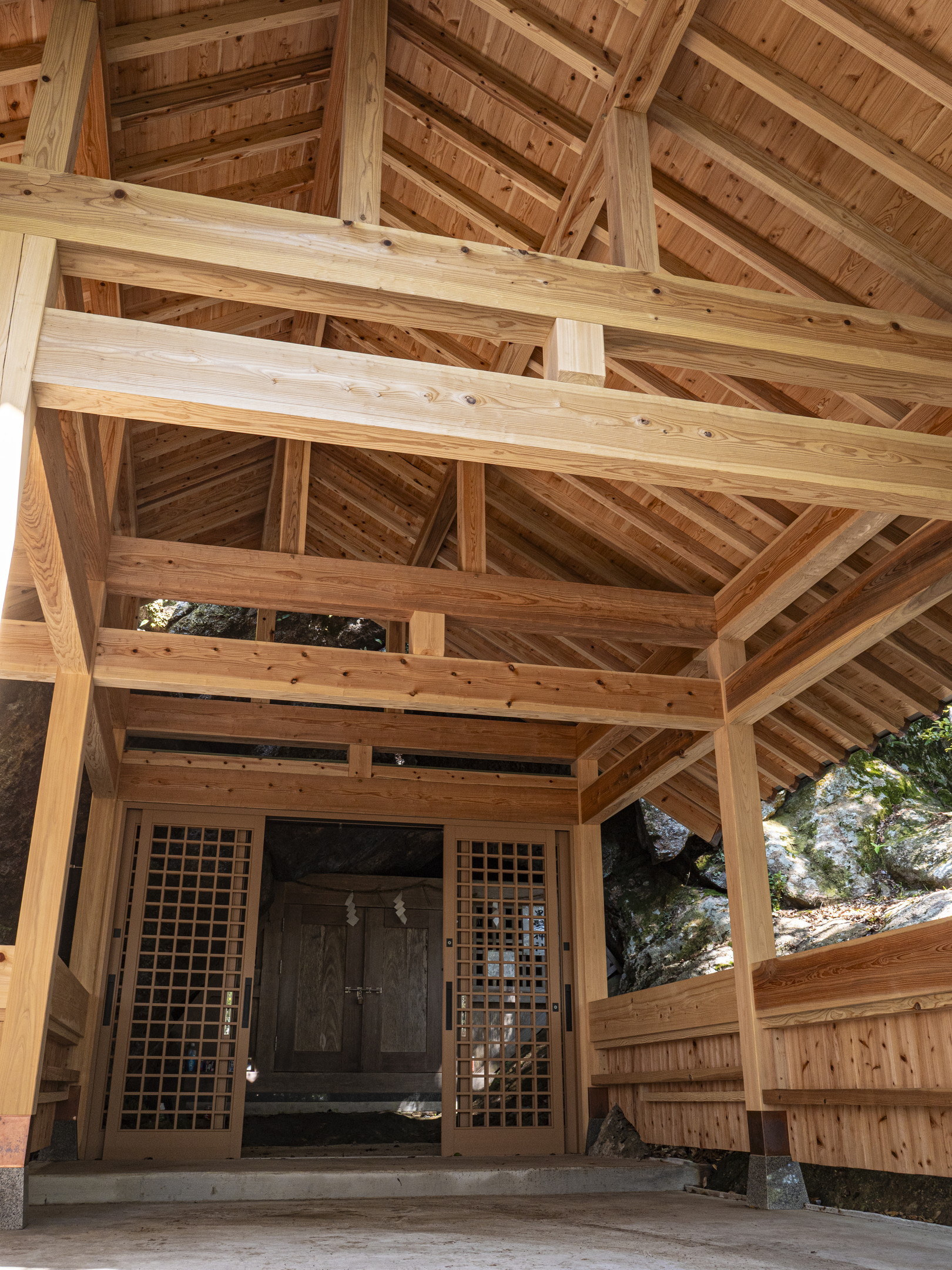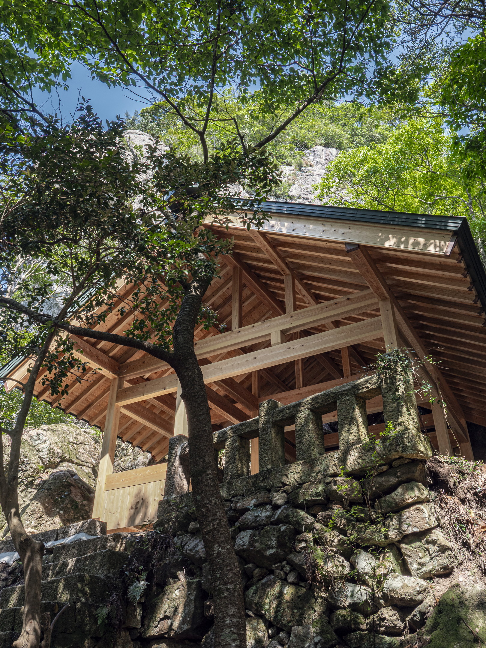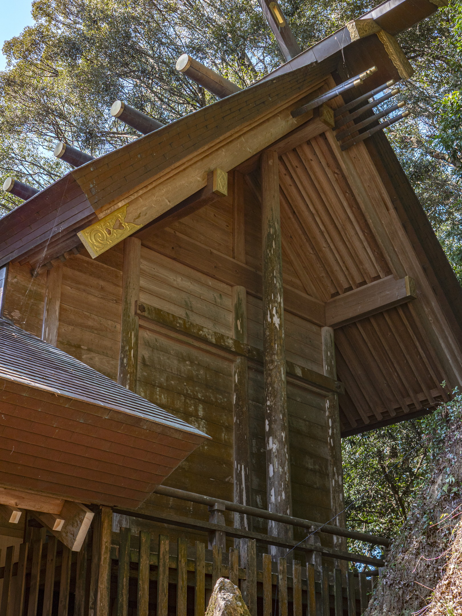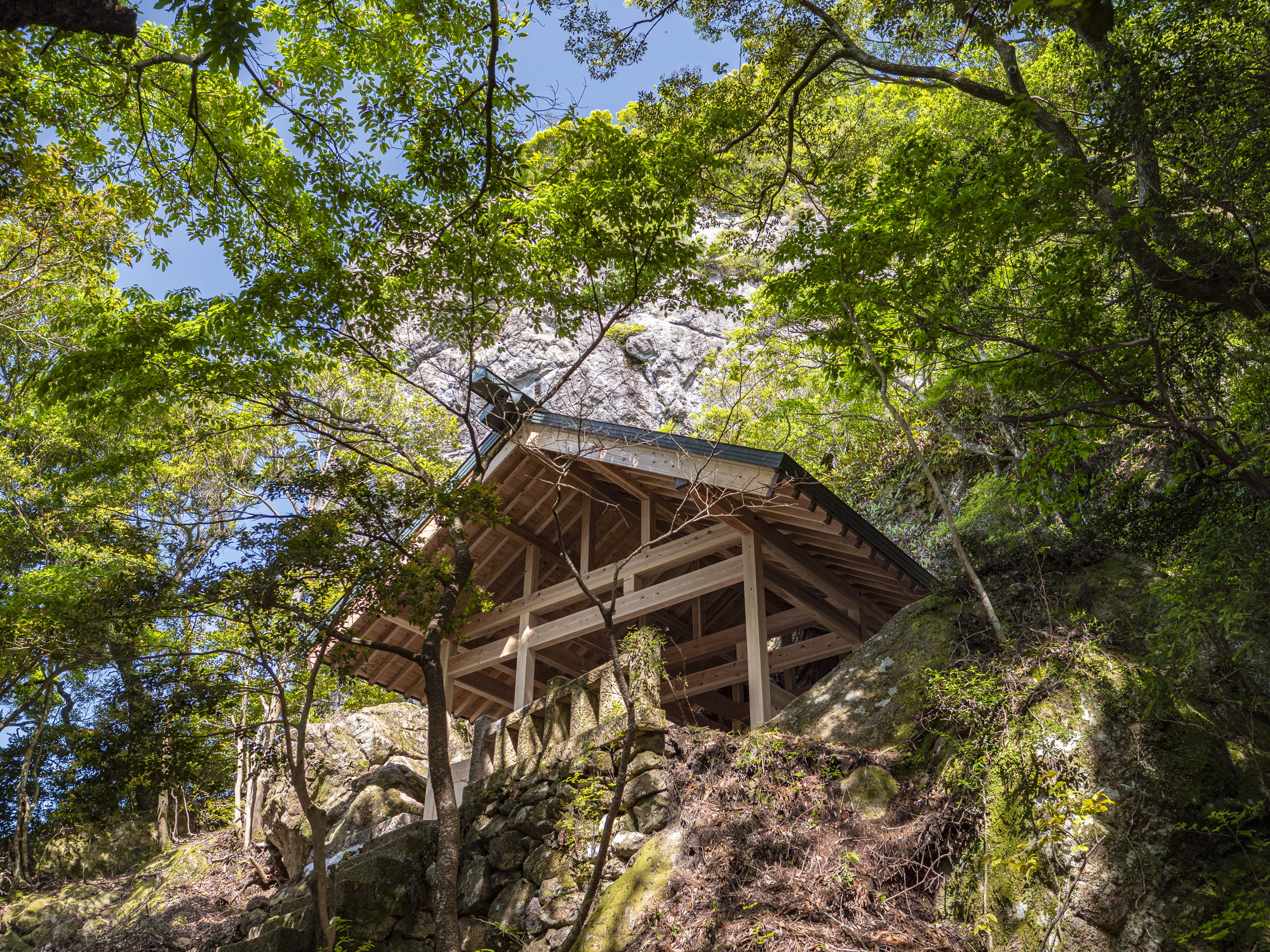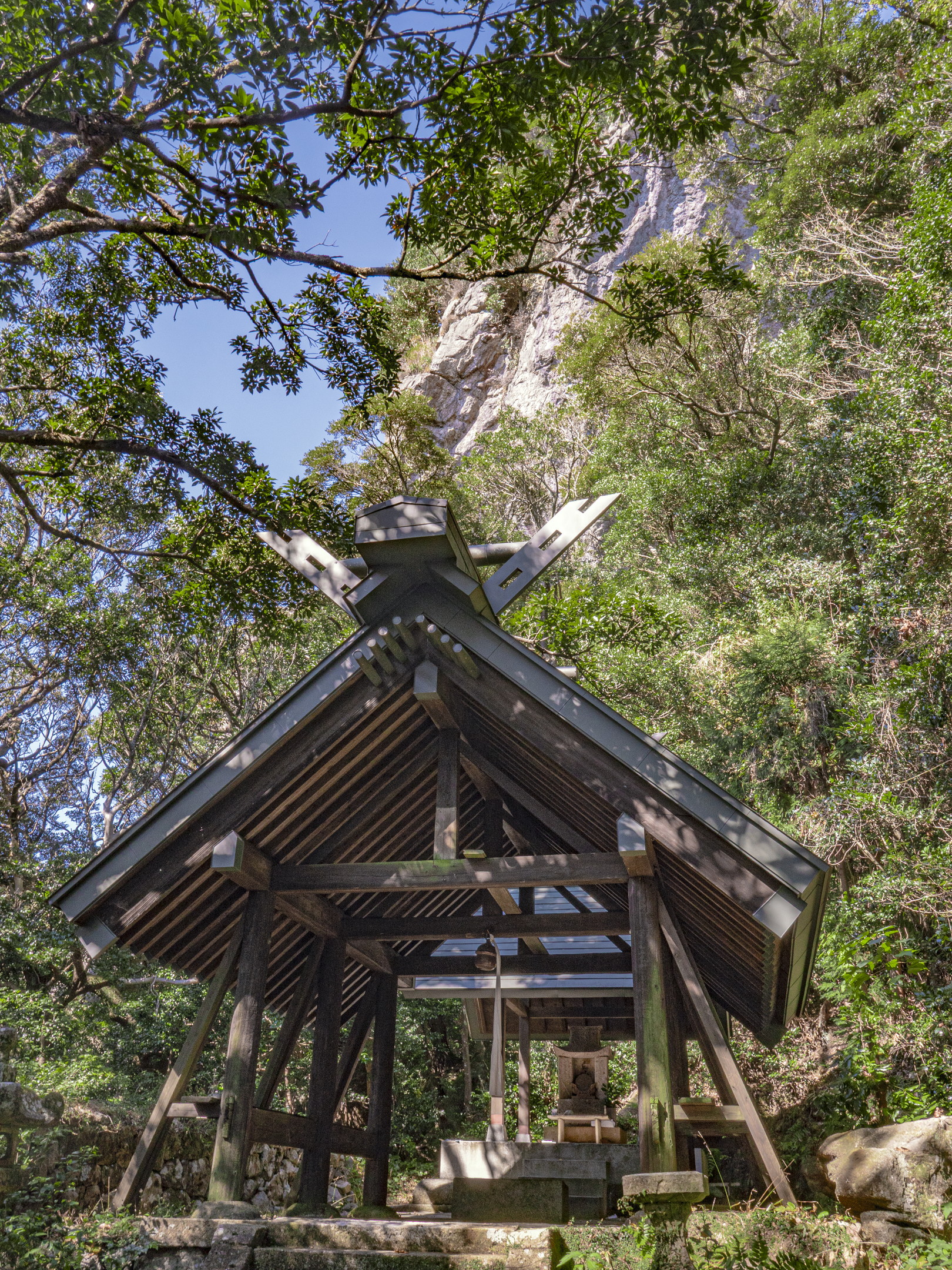 ひとつは、黒髮山では、伊奘冉命が、山上に遊ぶ姿がたびたび見られると伝えています。伊奘冉命は、2羽の烏が先導して牝牛に引かれた天磐船に乗るとされ、黒髮山には天磐船を繋いだ跡が残され、境内の2羽の烏像はその名残とされています。そして、頂上の天童岩は、老翁の夢に二人の童子が現れ、伊奘冉命が山上に飛遊して羽衣が高く舞う様を「山上飛遊の神は伊奘冉命なり。これを尊祀するもの、必ず幸あらむ」と宣り、自らを速玉男命、事解男命と名乗ったことに由来し、名付けられたと記しています。その奇瑞を受けて石祠を山腹に立てて、祀ったのが崇神天皇16年(前82)で、伊奘冉命を天童岩霊窟の下に奉斎し、速玉男命、事解男命を合祀して創祀されたとしています。そして、黒髮山頂上にある天童岩下にある霊窟の上宮がその跡としています。霊亀元年(715)下宮が建立され、大同年中(806-810)詔が下されて田園若干が寄進されます。室町時代までは七合目から上は女人禁制の山とされます。中腹の乳待坊には巨岩・大岩がそそり立ち、その中の雌岩・雄岩の間から万物が生まれたとの伝承も記しています[02]。