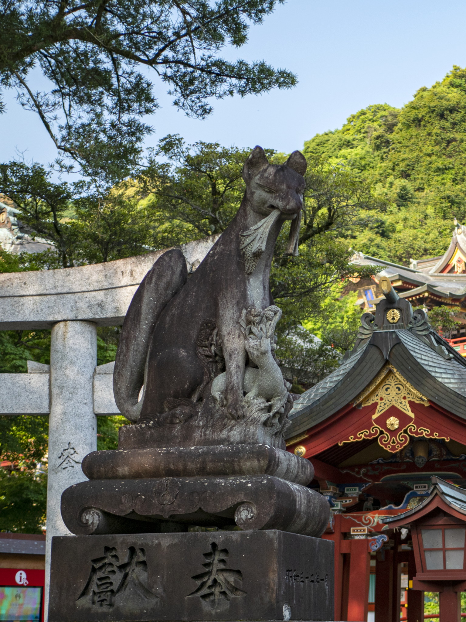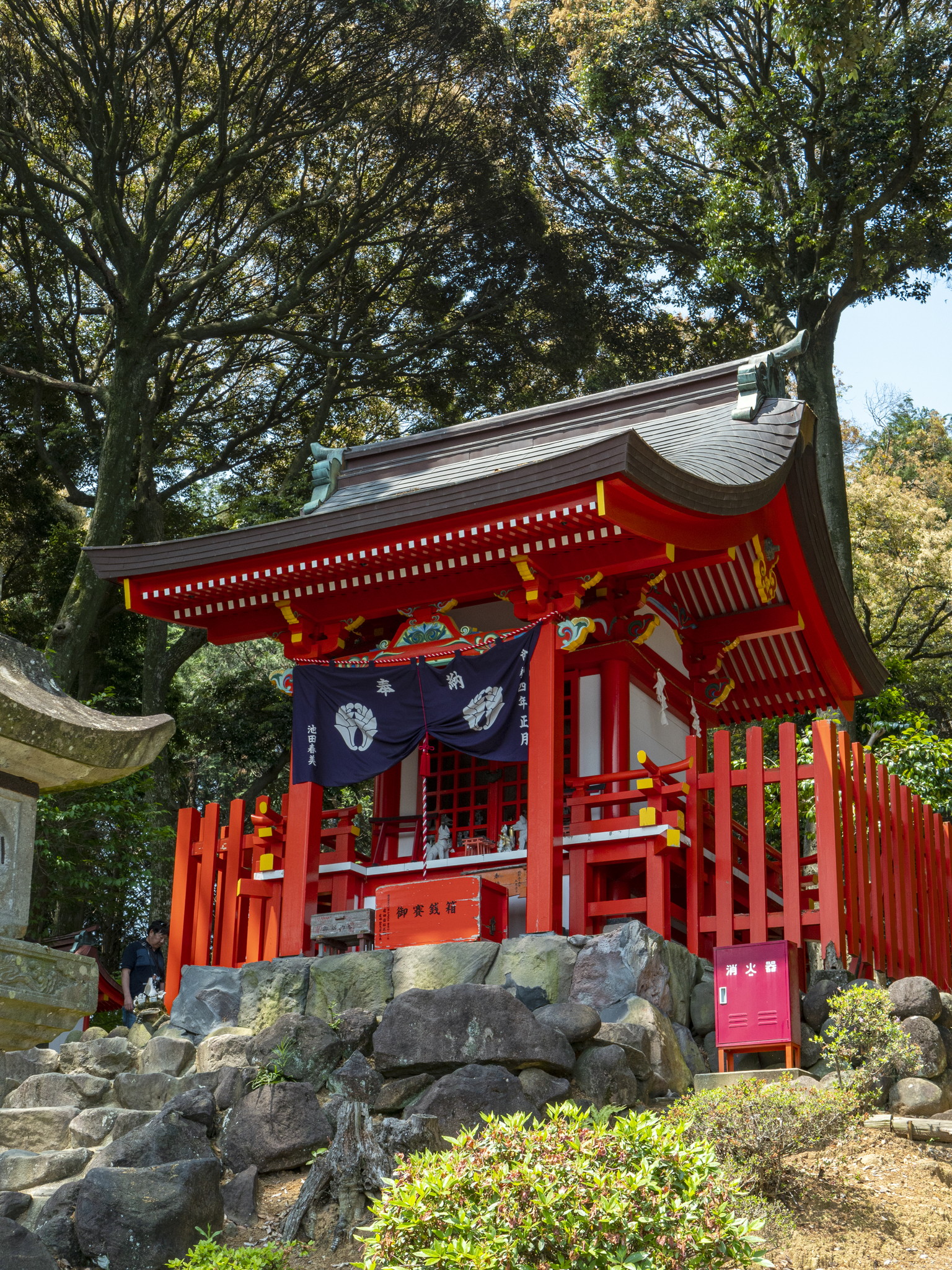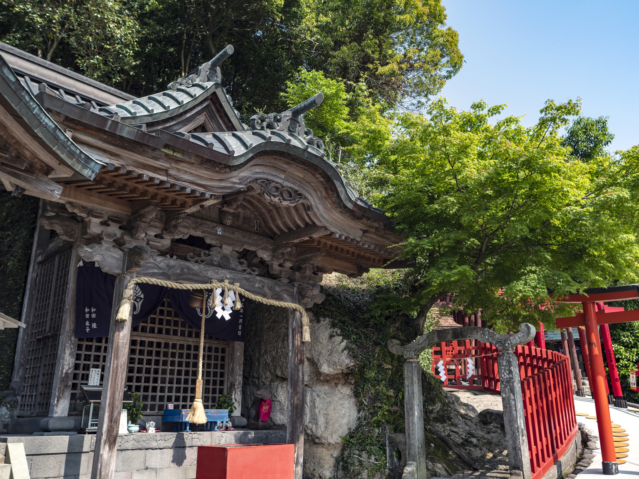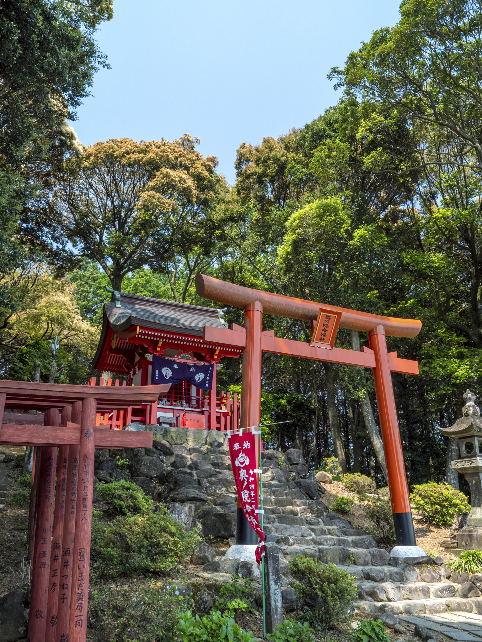社殿向かって右下の参道、石壁山の高い崖添いに鎮座。技芸上達の神様として祀ってあります。祭神は岩本大神。