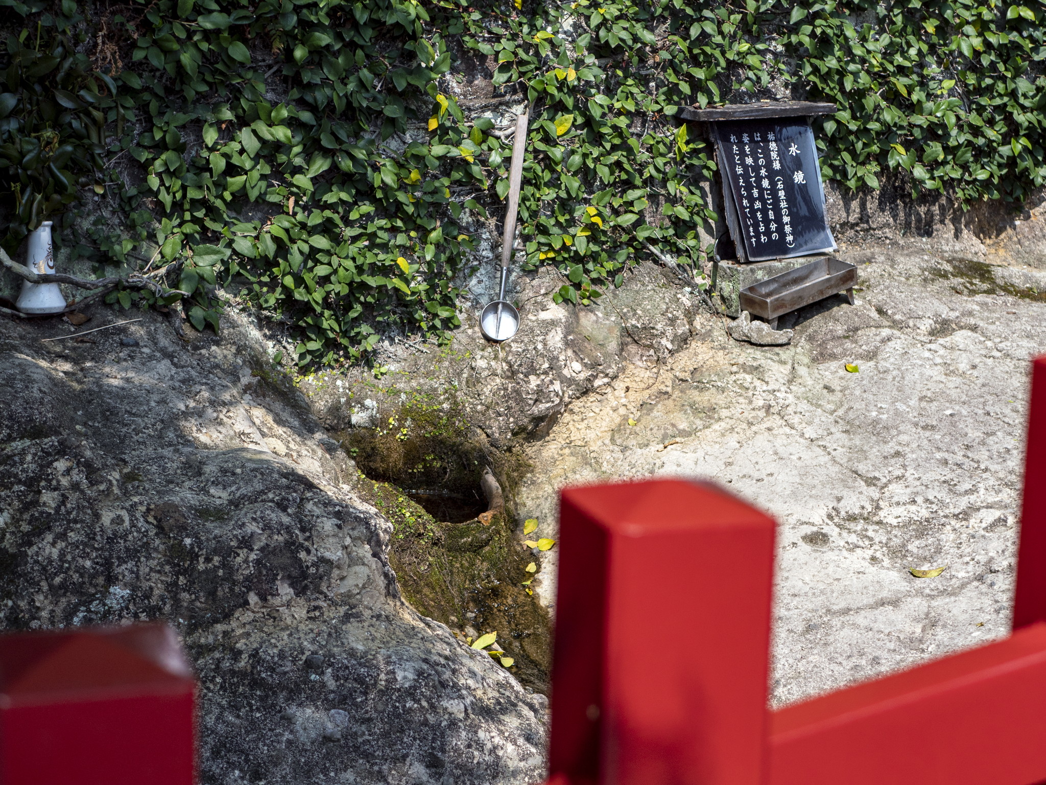 石壁神社のすぐ右手。萬子媛(祐徳院)が、御自身の姿を映して吉凶を占われたと伝える場所です。当地に庵を結んだ萬子媛は、神仏に仕えて御暮らしになり、村人からは大変敬慕されていました。村人が畑で獲れた野菜を祐徳院様へ届けた時、この水鏡を通して村人が訪れることを事前に知っていたとお話しし、一層の敬慕を受けるに至ったと伝えられています。